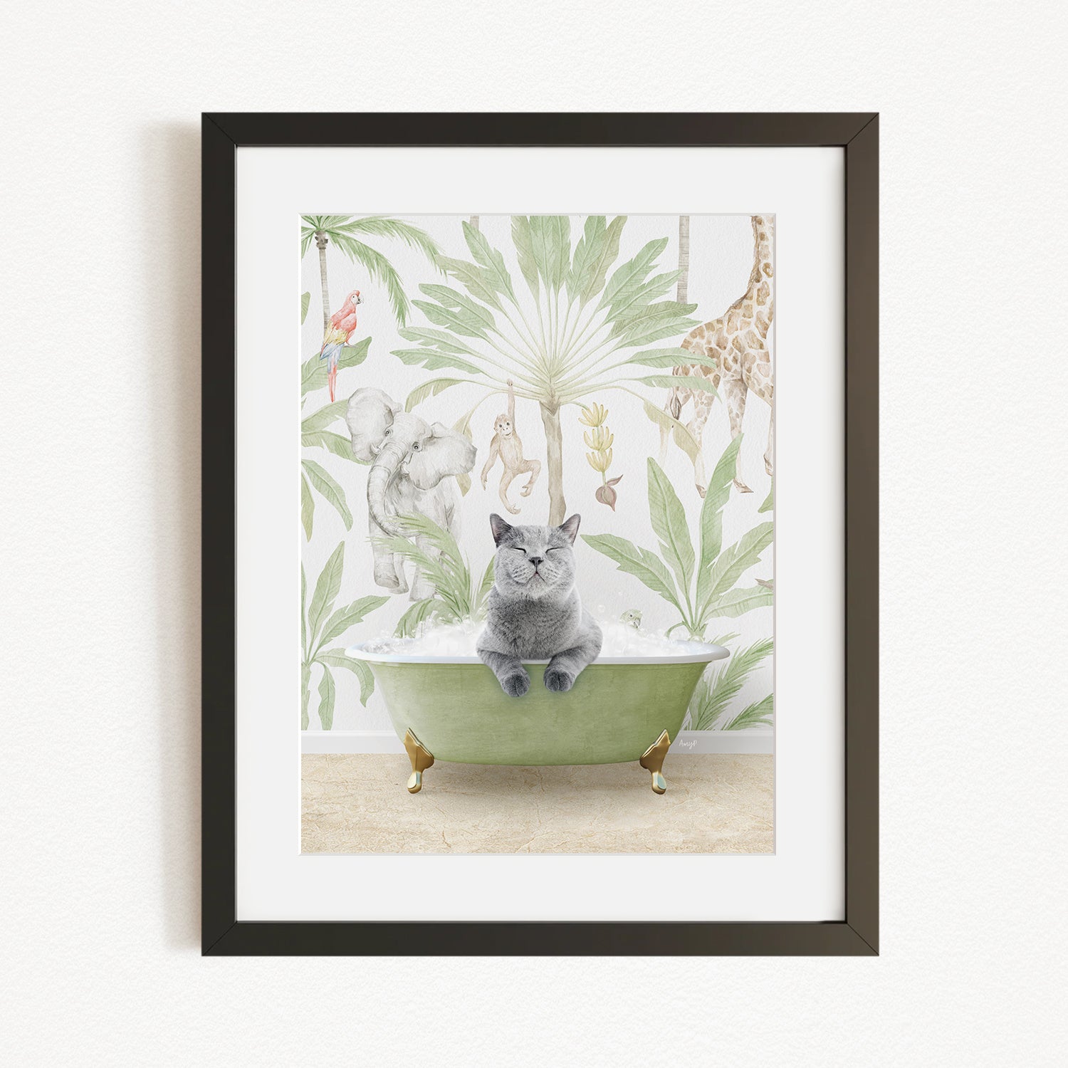 A framed illustration depicting a gray cat sitting in a green bathtub, surrounded by various animals and plants, including a giraffe and an elephant, against a tropical wallpaper background.