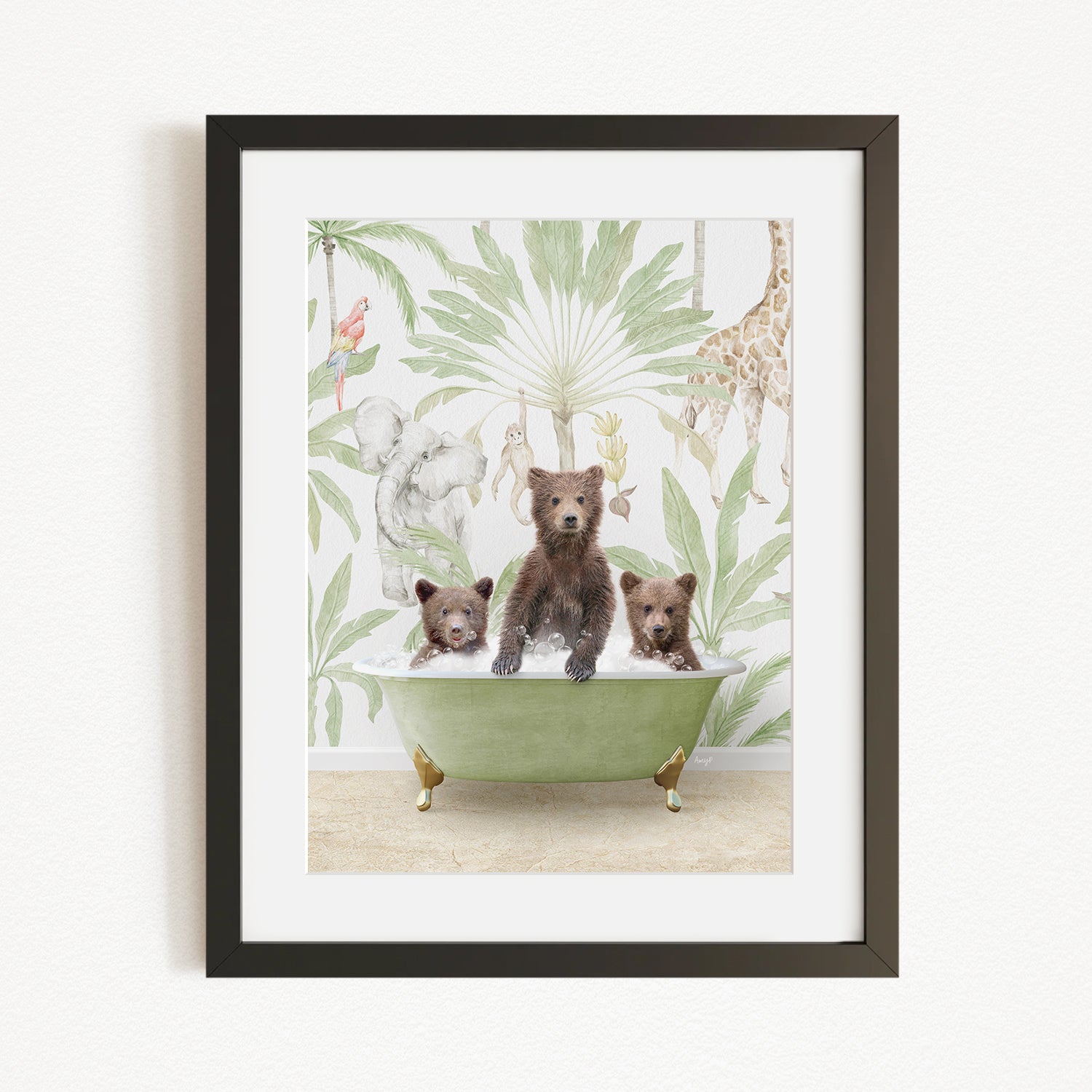 A framed print depicting three bears sitting in a green bathtub, surrounded by various animals such as a giraffe, elephant, and parrot, all set against a tropical wallpaper background.