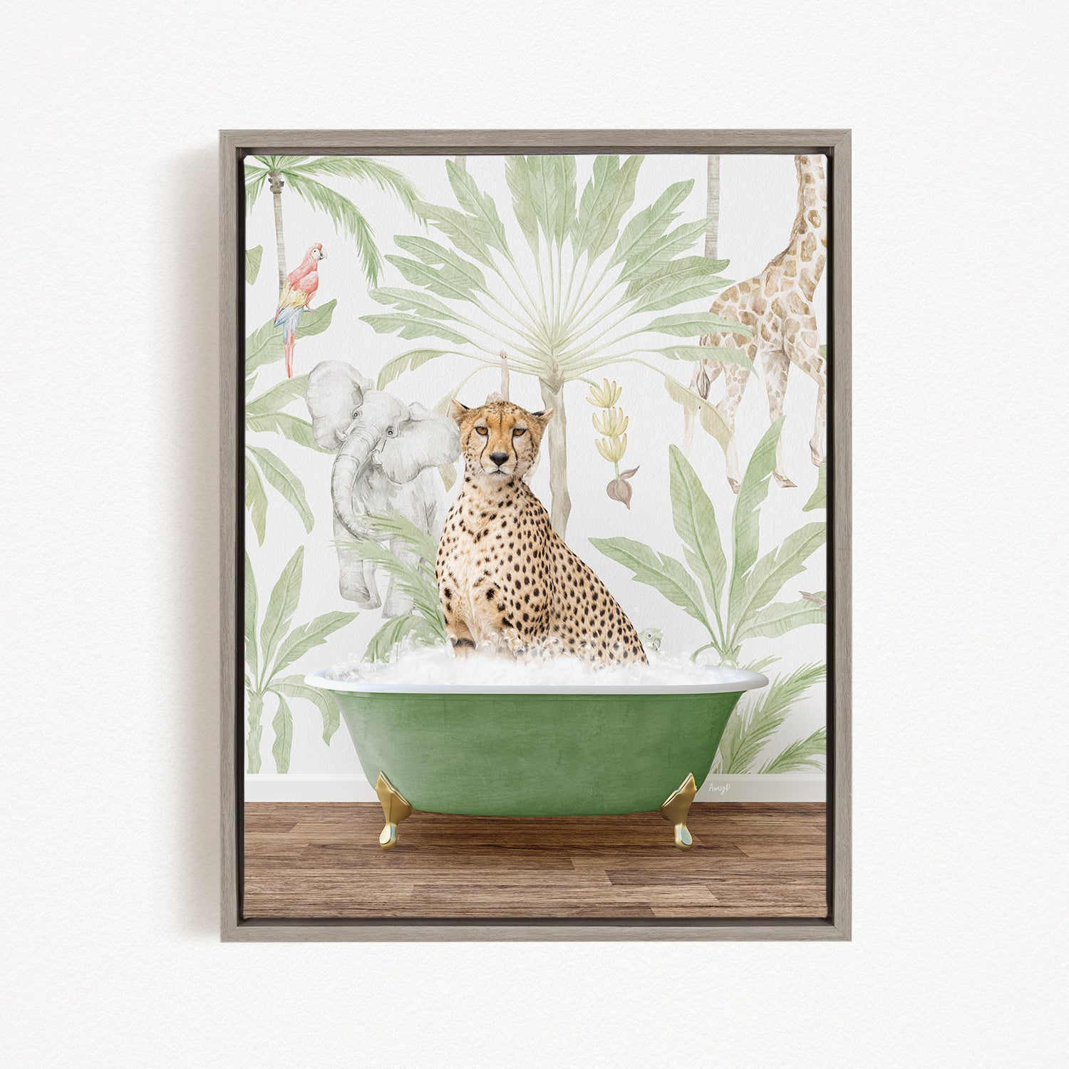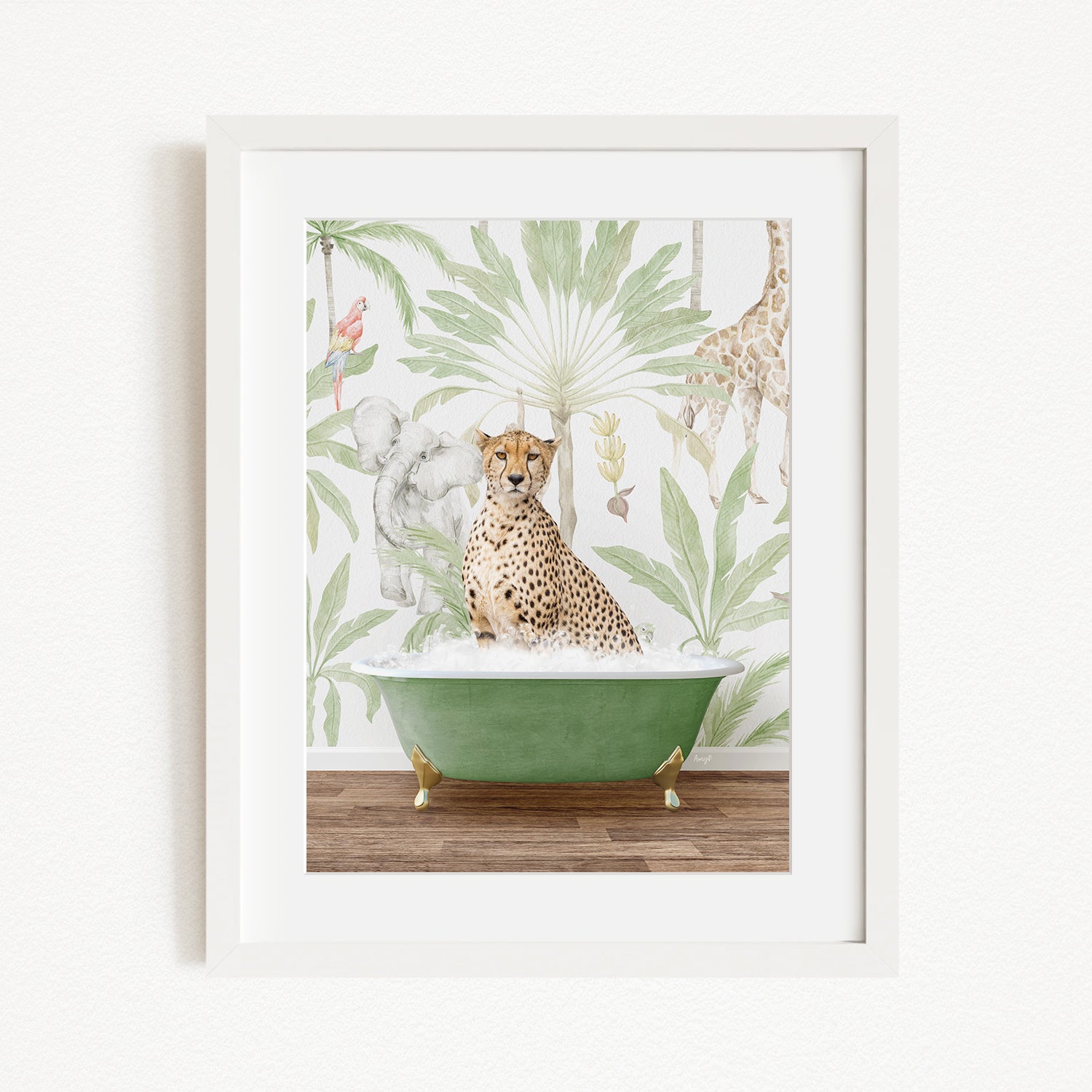 A cheetah sitting in a green bathtub, surrounded by a tropical jungle wallpaper with various animals and plants.