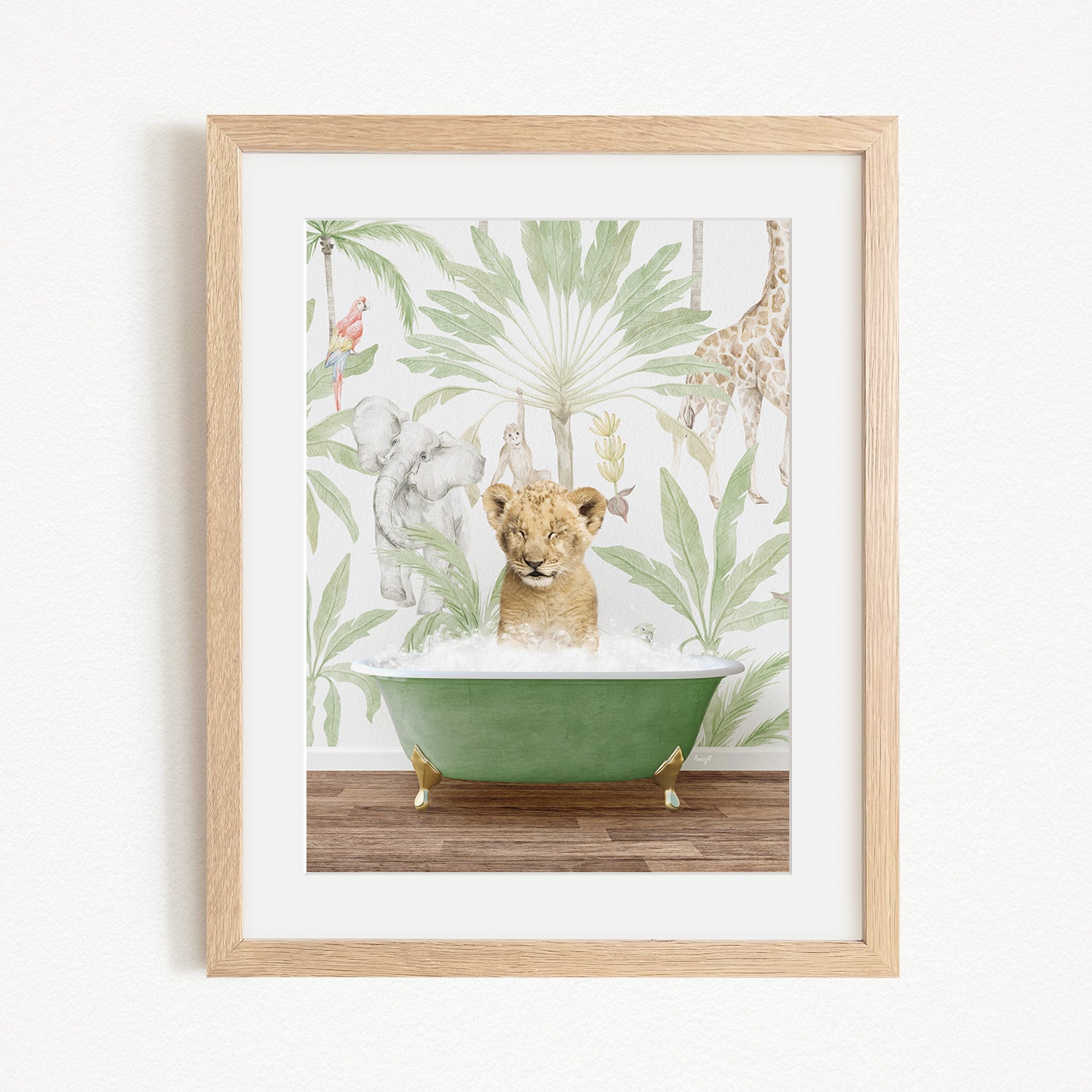 A young lion cub sitting in a green bathtub, surrounded by a tropical jungle wallpaper with various animals such as giraffes, elephants, and palm trees.