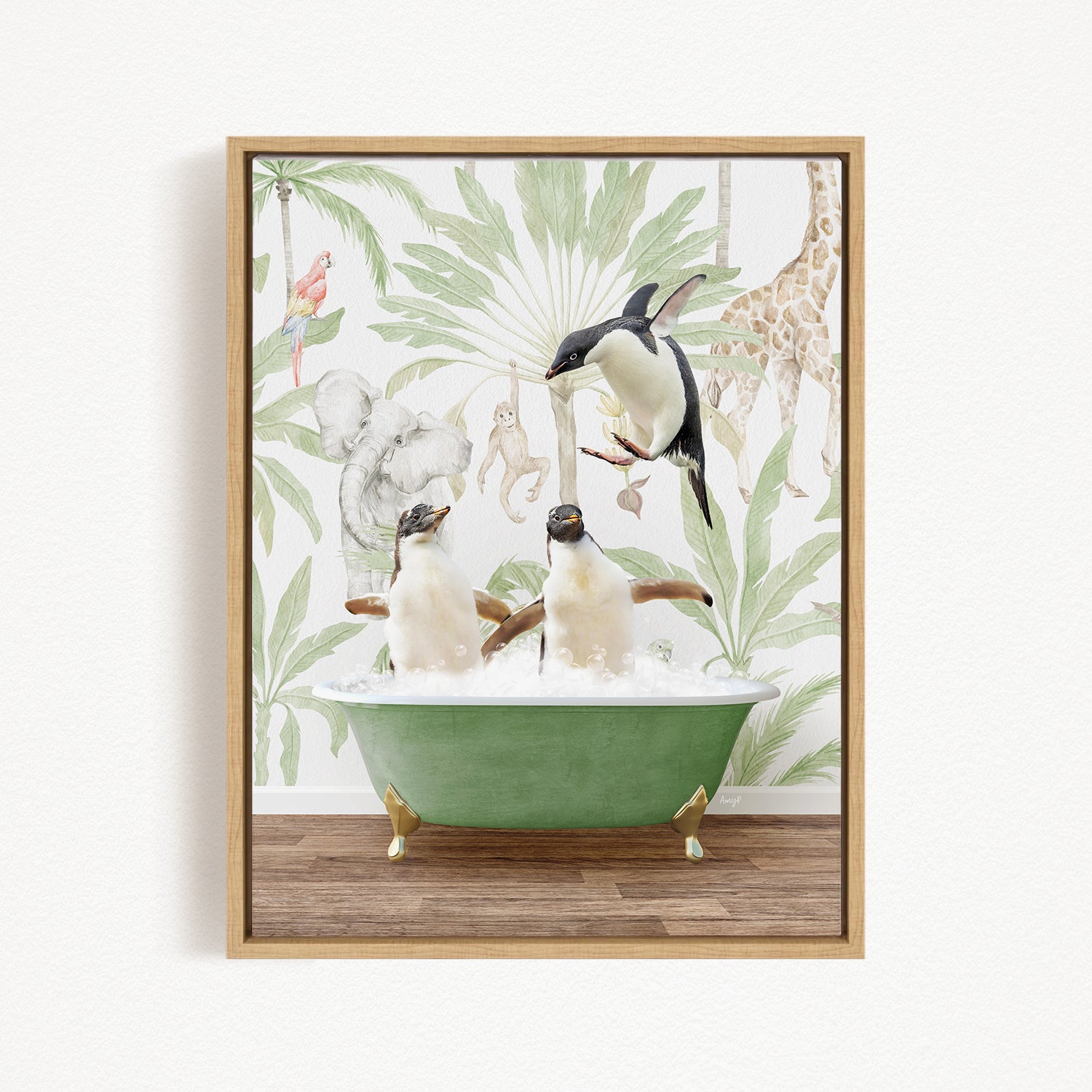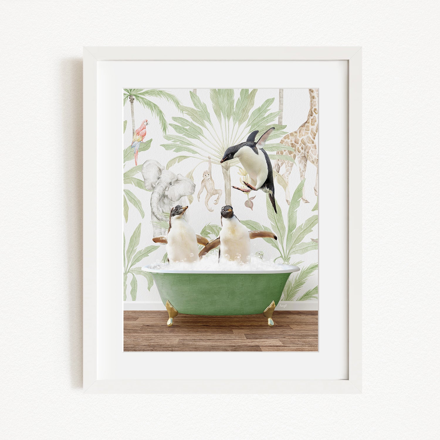 A framed image depicting two penguins sitting in a green bathtub, surrounded by a tropical jungle wallpaper with various animals such as a parrot, giraffe, and monkey.