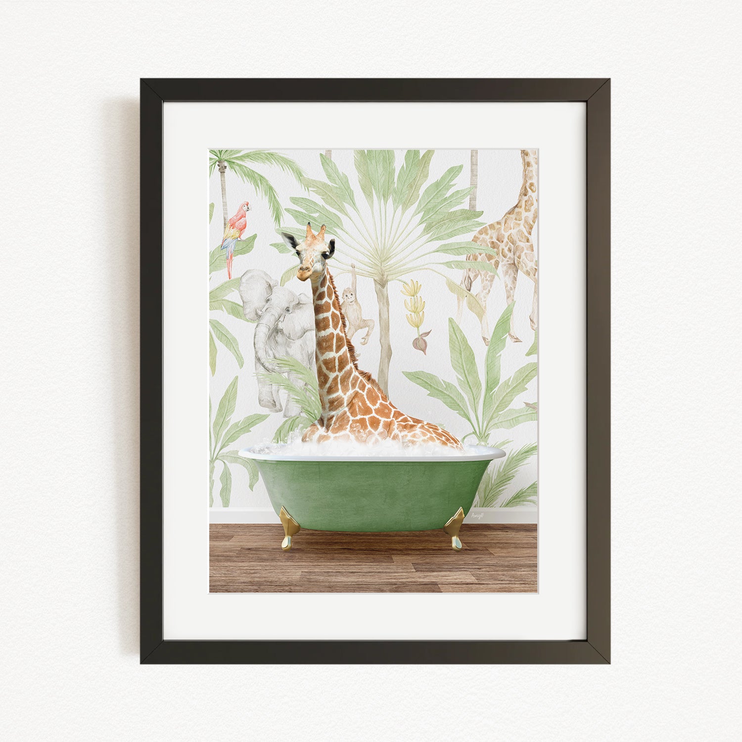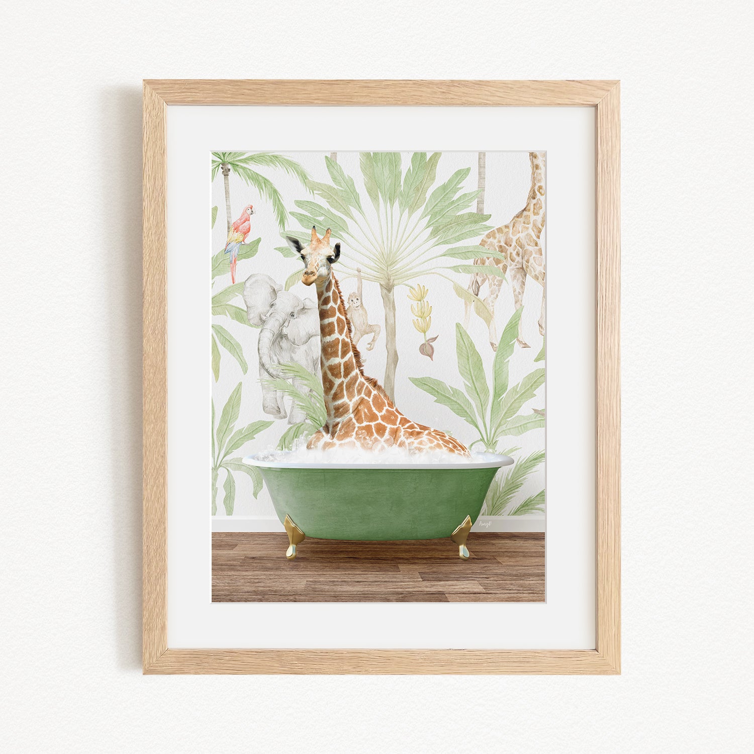 A giraffe sitting in a green bathtub, surrounded by tropical foliage, is the central focus of the framed artwork.