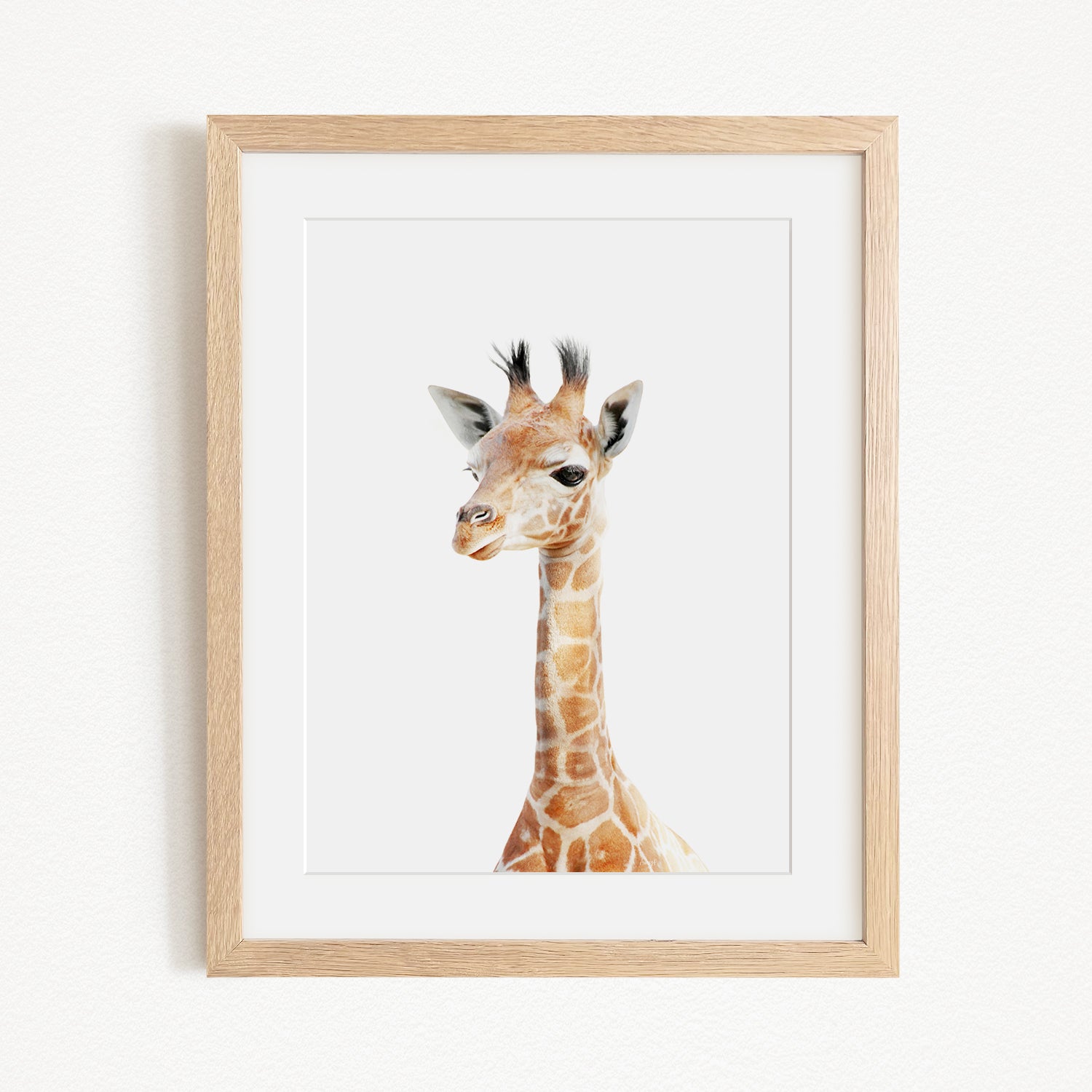 A framed photograph of a giraffe, with its distinctive brown and white spotted coat and tall, slender neck, is displayed on a white wall.
