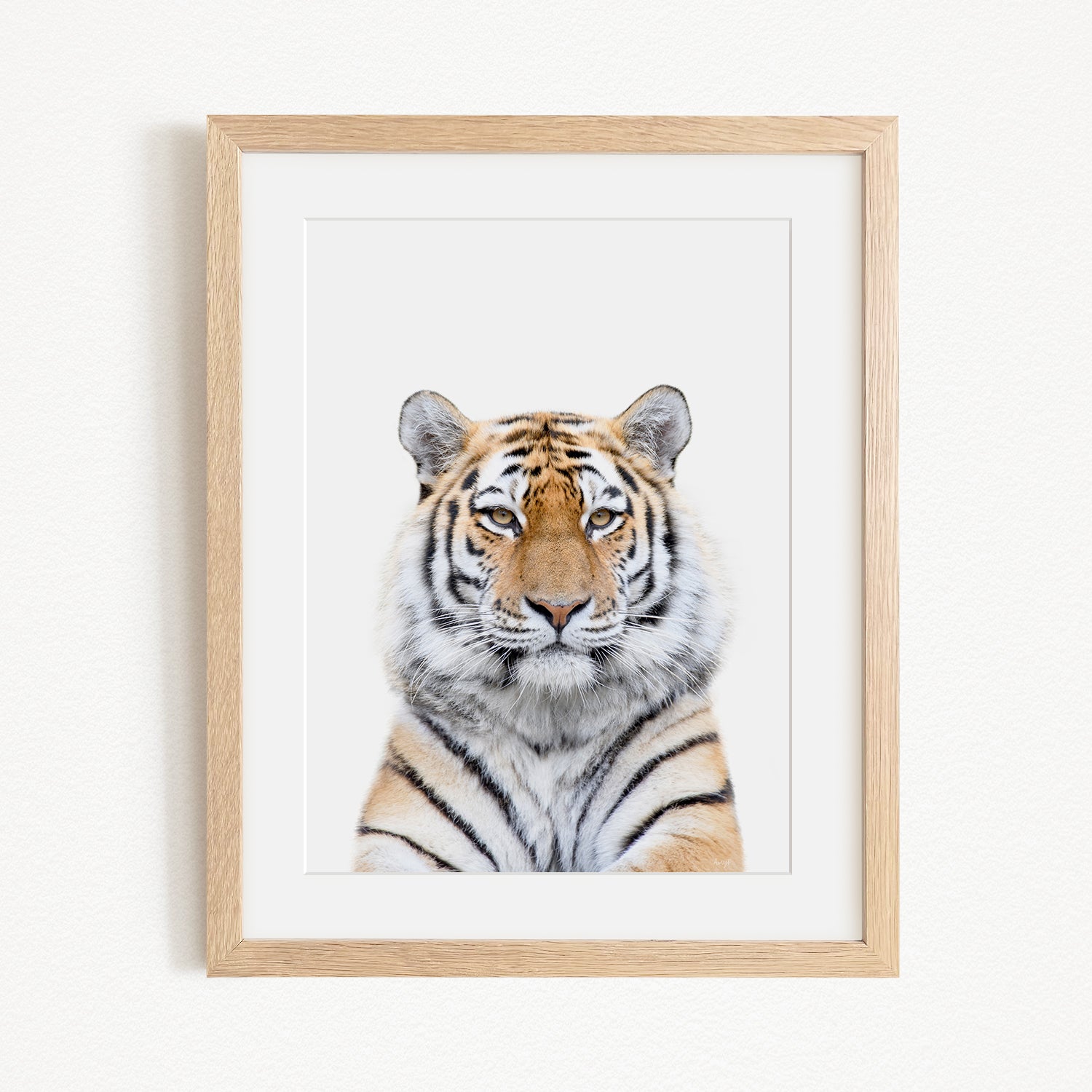 A close-up portrait of a tiger, with its distinctive striped fur and piercing eyes, is displayed in a framed white picture against a plain white wall.