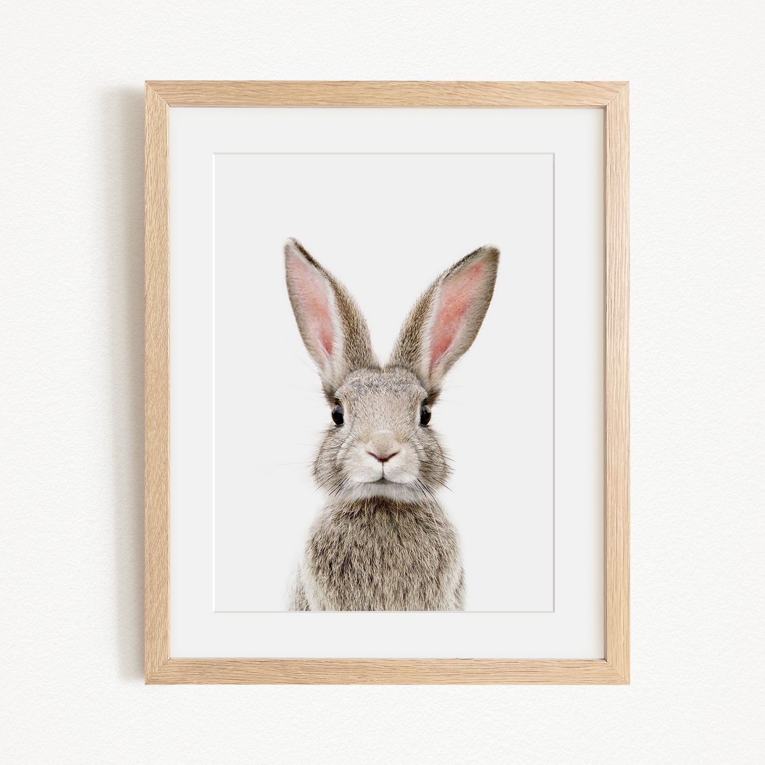 A framed photograph of a rabbit with large ears and a curious expression.