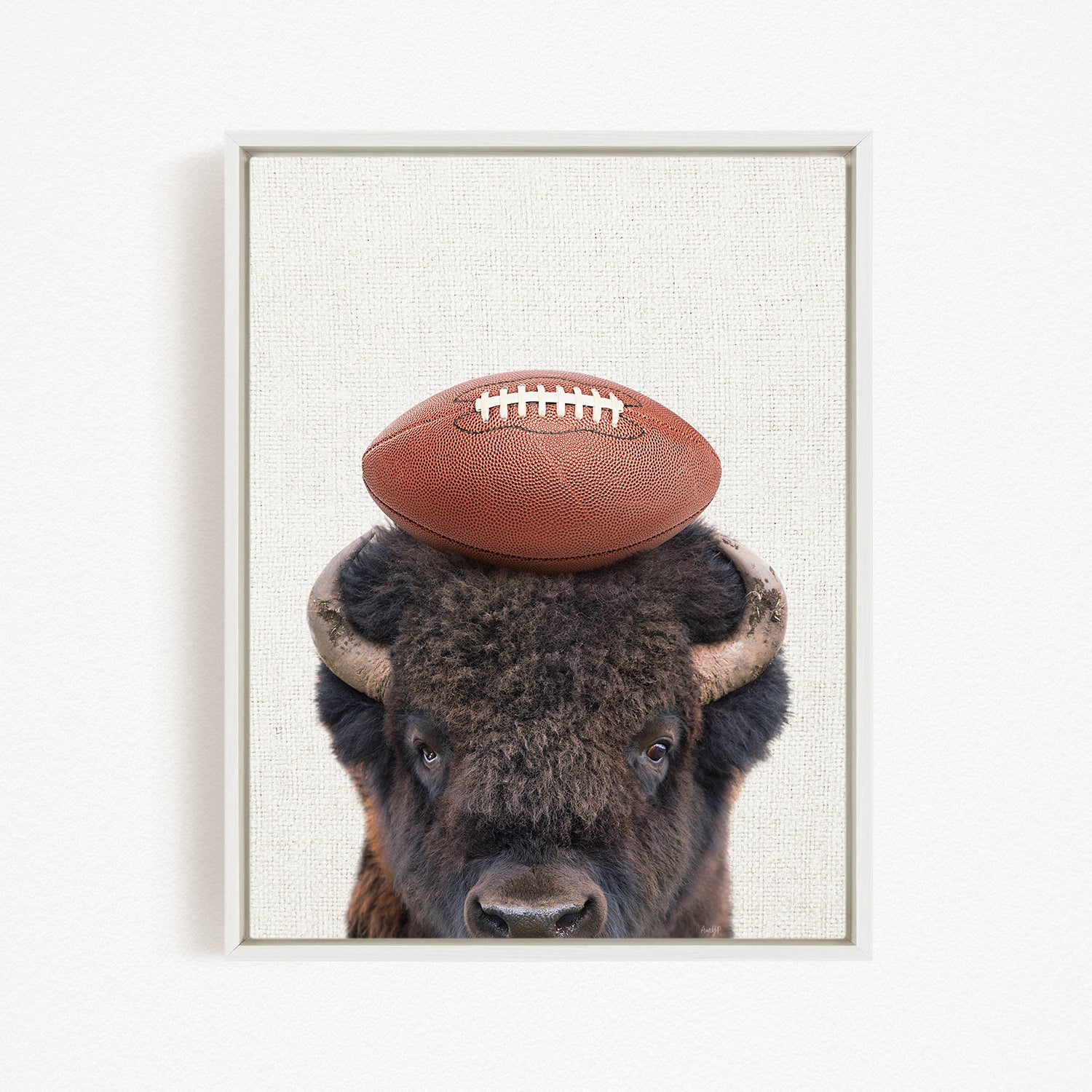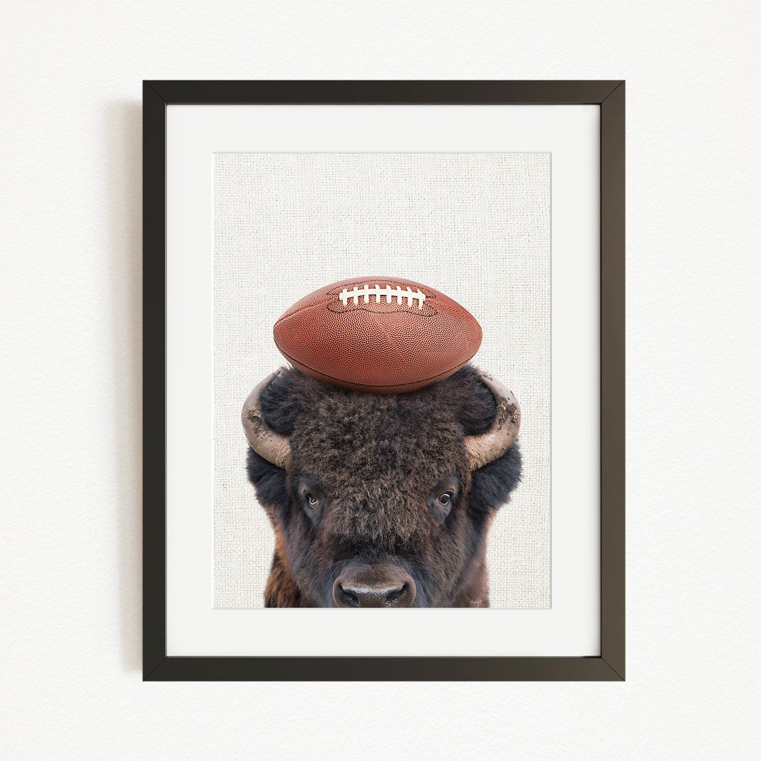 A buffalo with a football resting on its head, in a framed artwork.