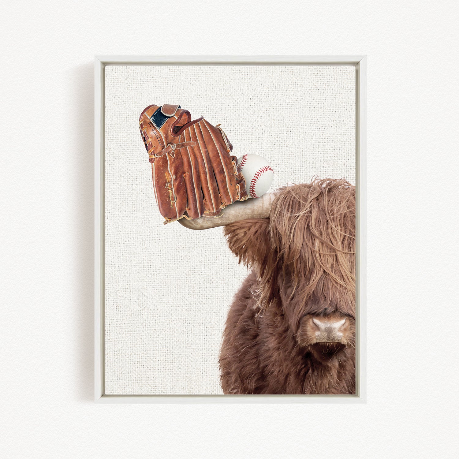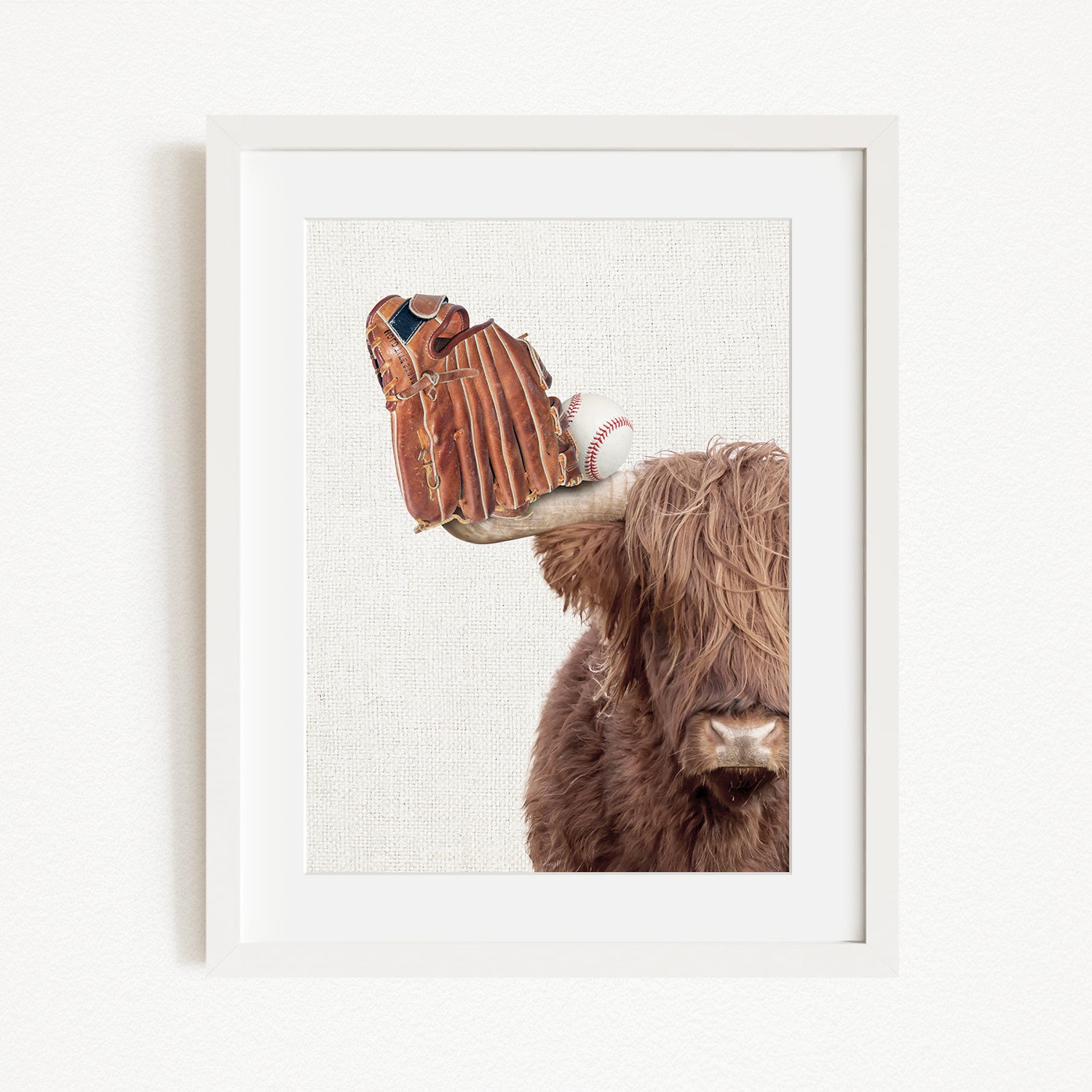 A framed image depicting a brown cow with a baseball glove on its head.