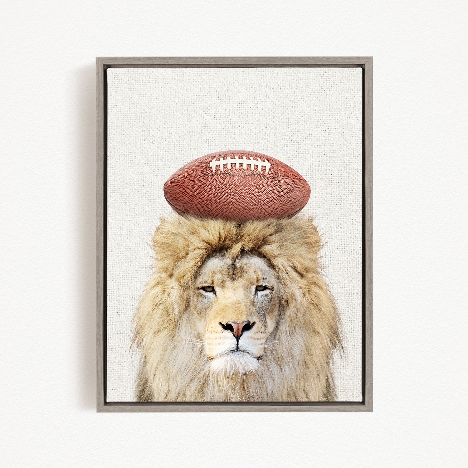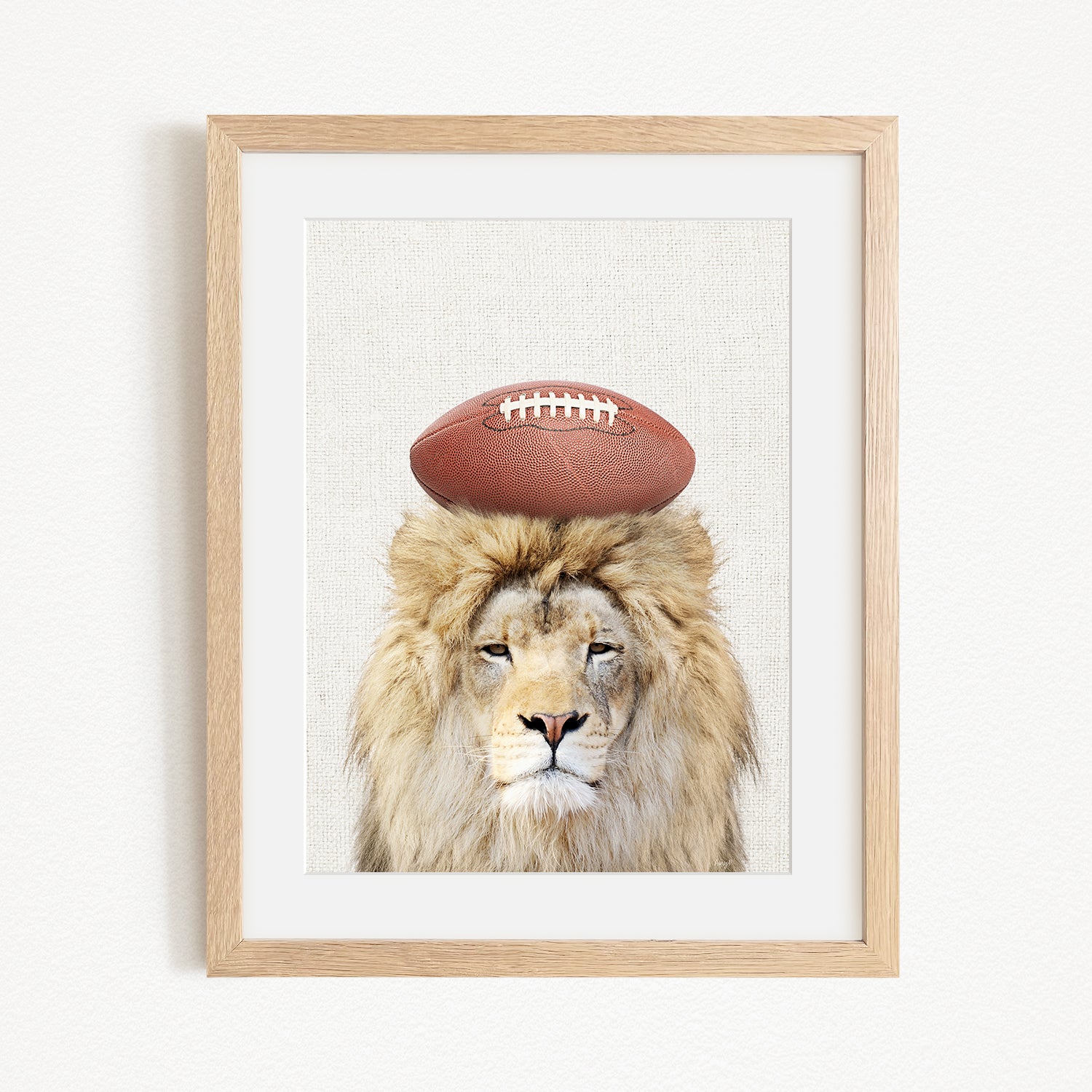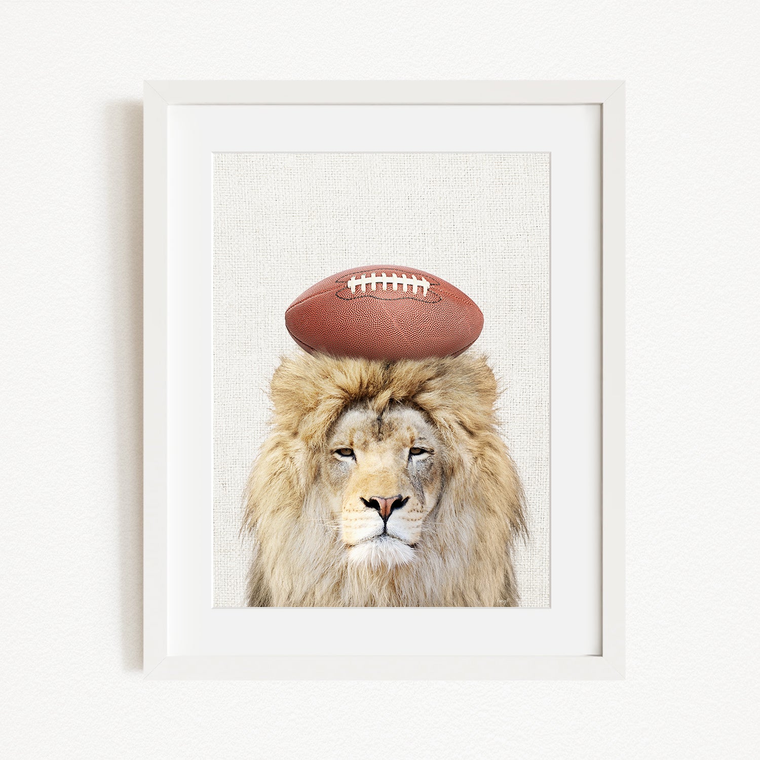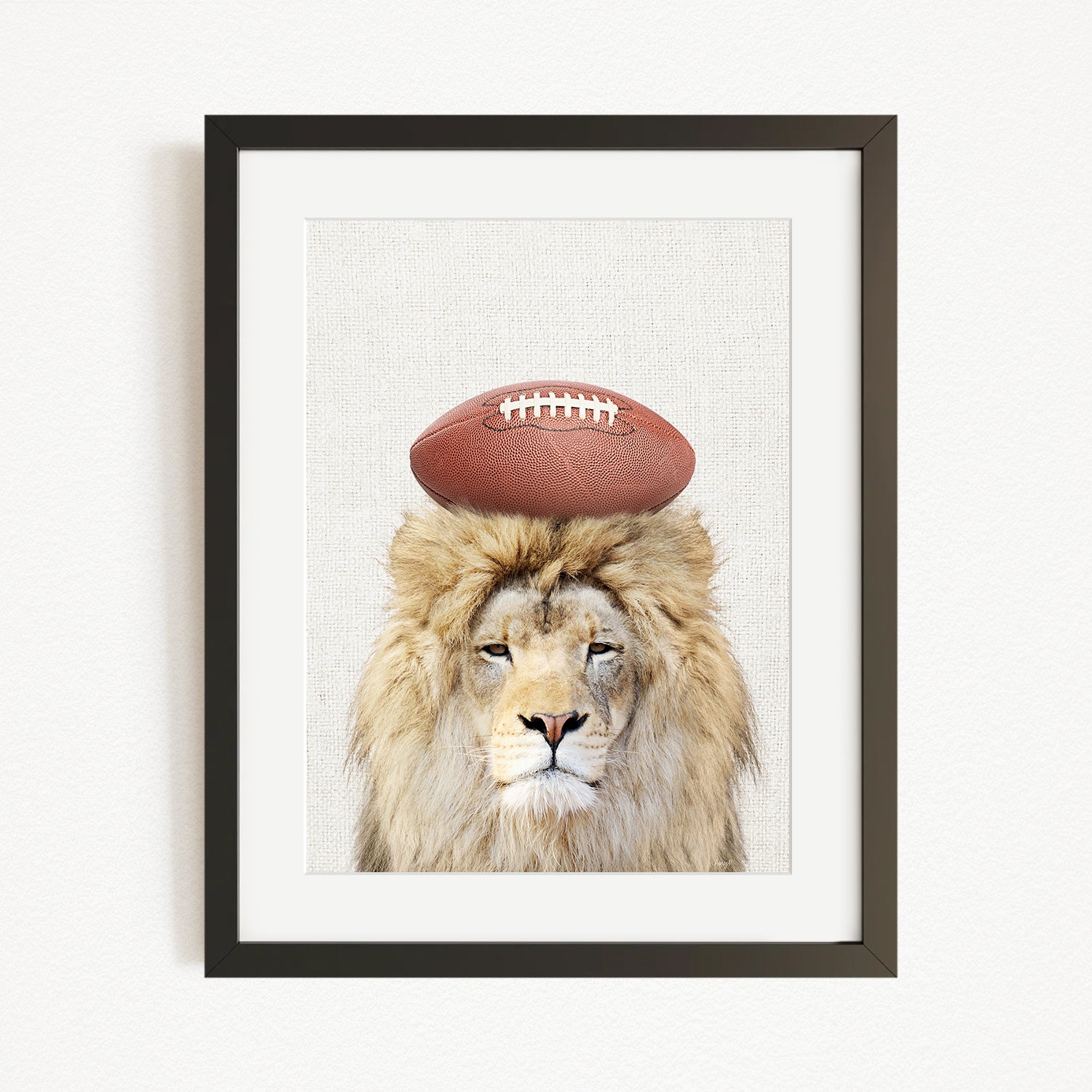 A framed image of a lion with a football on its head.