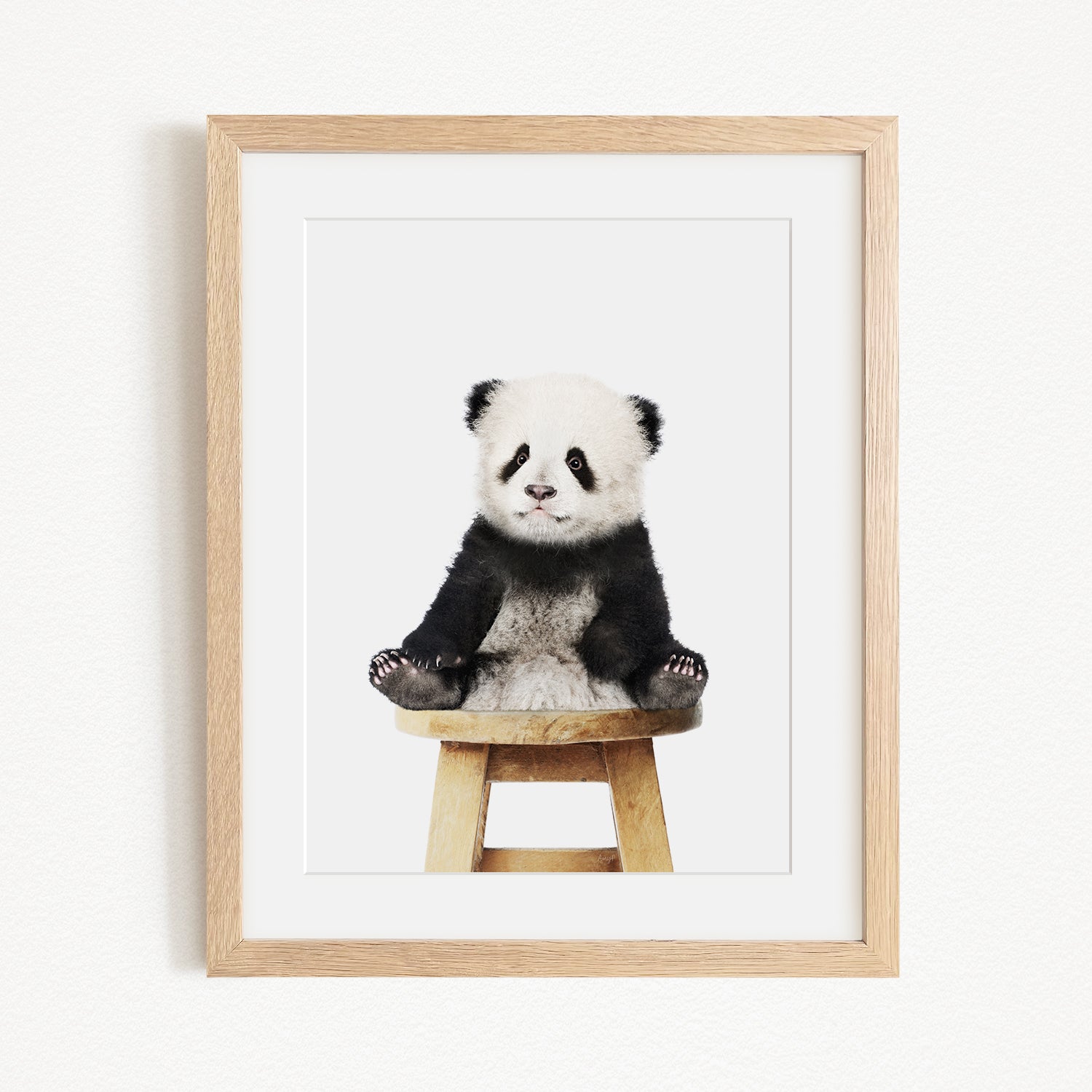A cute panda bear sitting on a wooden stool, looking directly at the camera.
