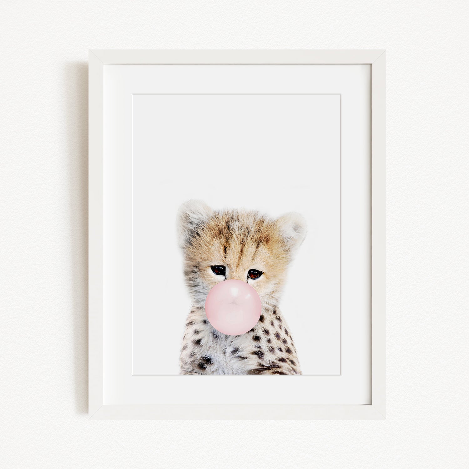 A framed image of a cheetah blowing a bubble with a pink bubble gum bubble.