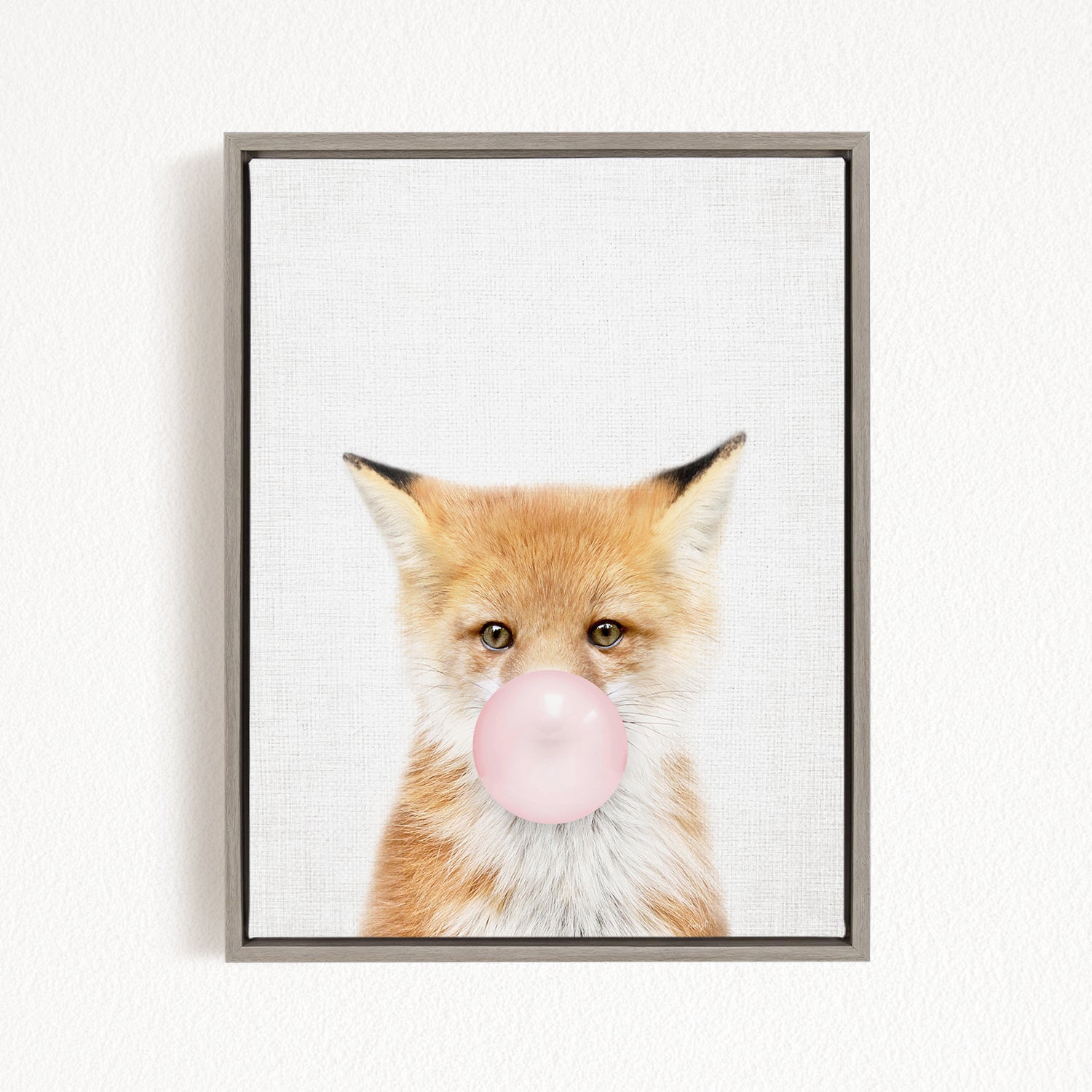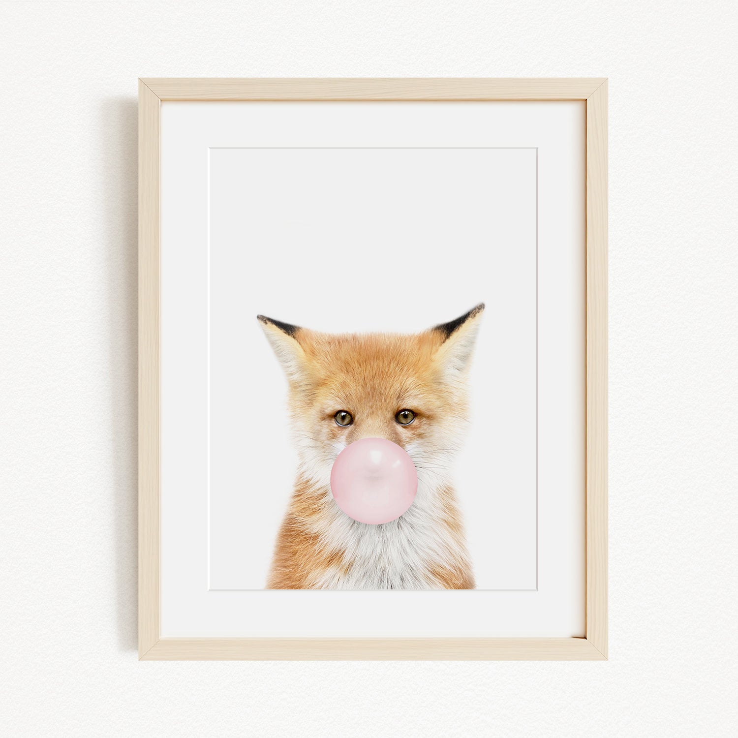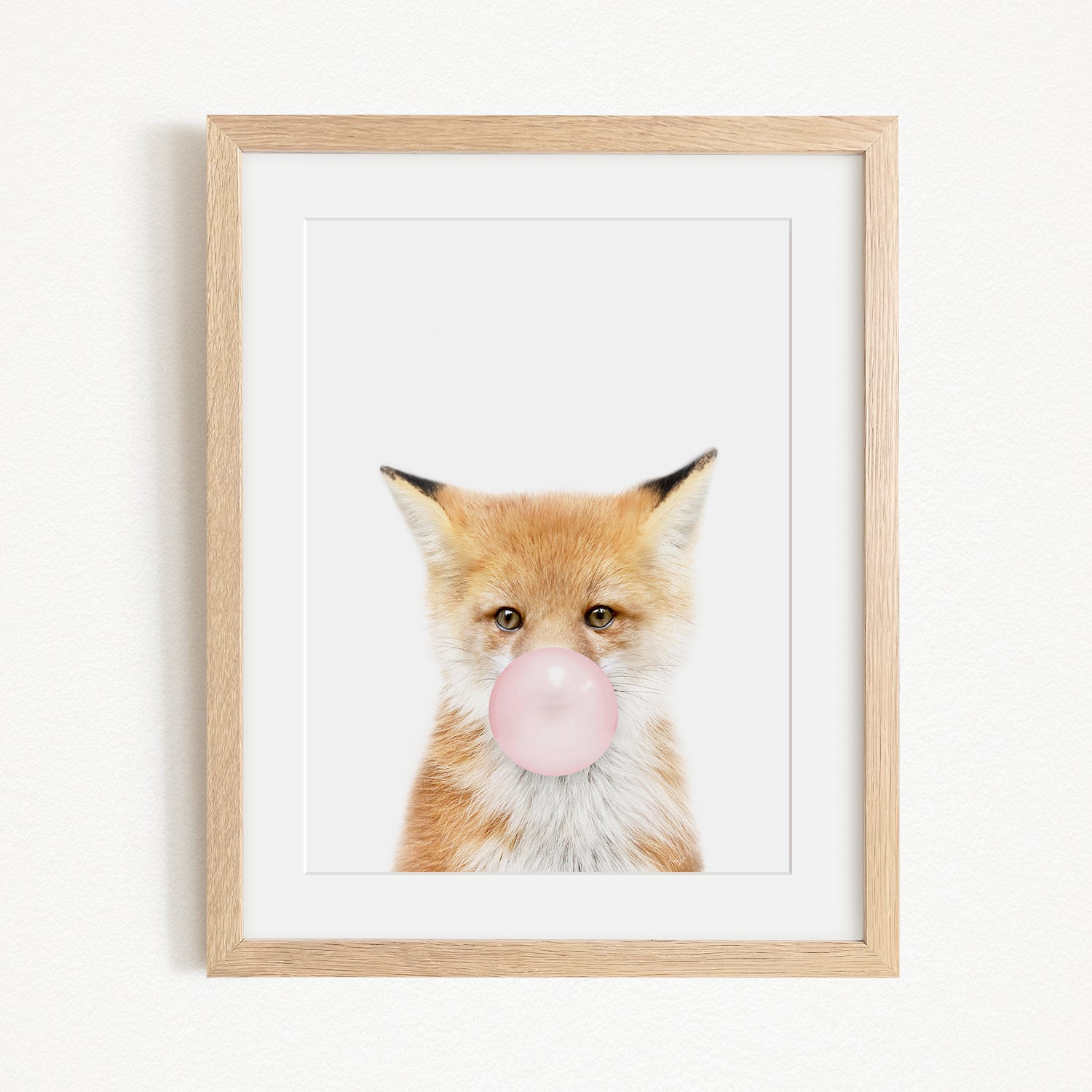 A framed image of a fox blowing a bubble with a pink bubble gum bubble.