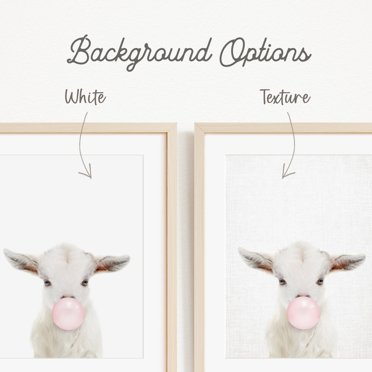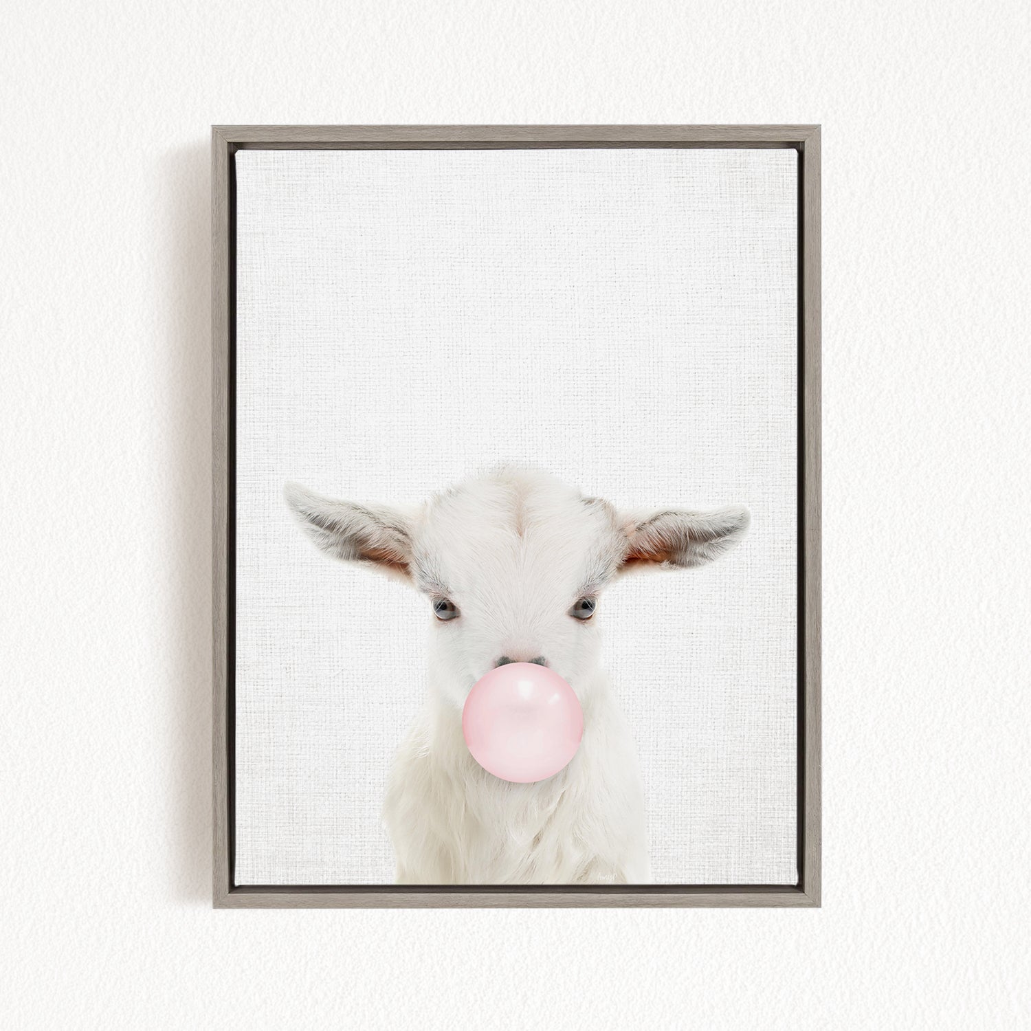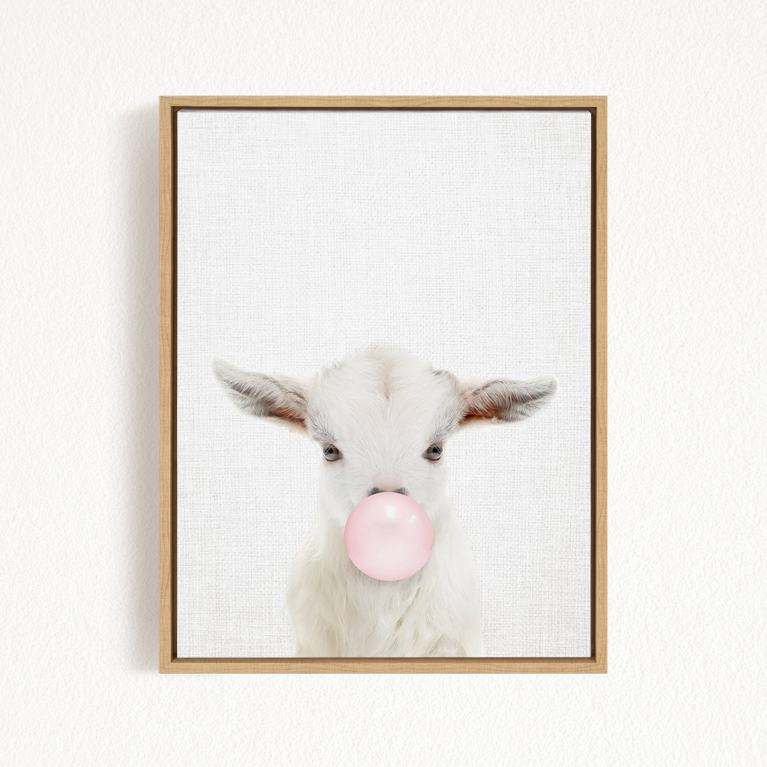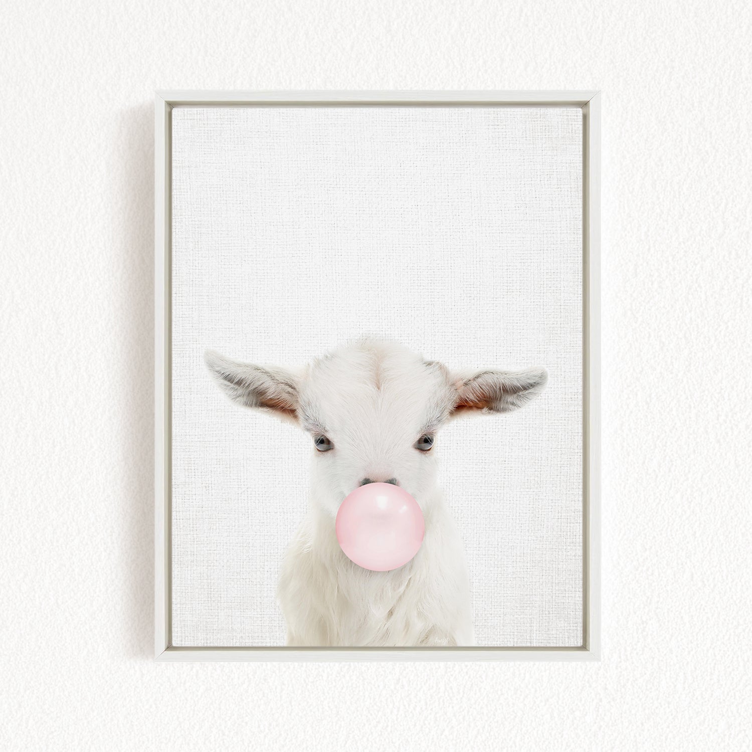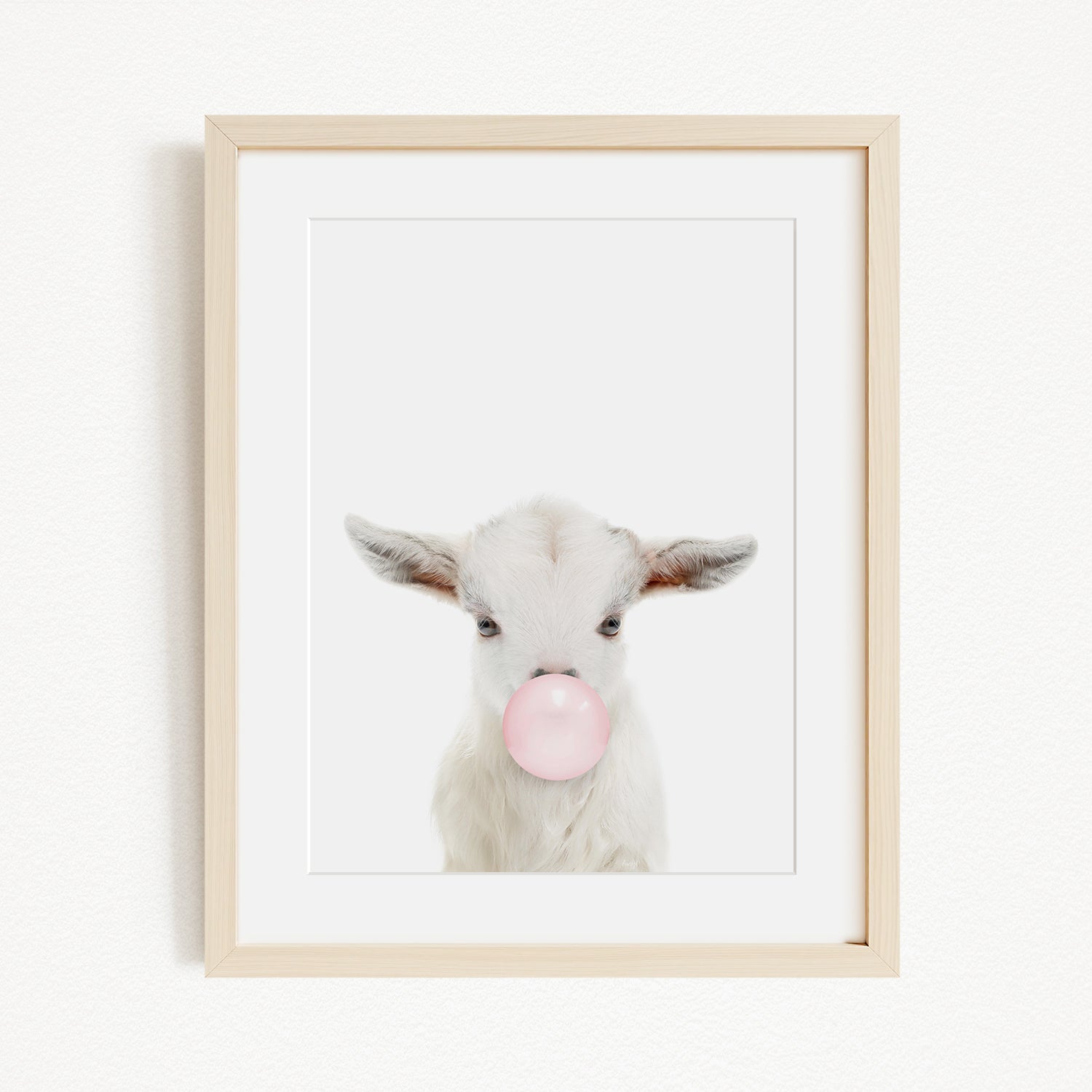 A white goat with pink bubble gum blowing in its mouth is the focus of the framed image.