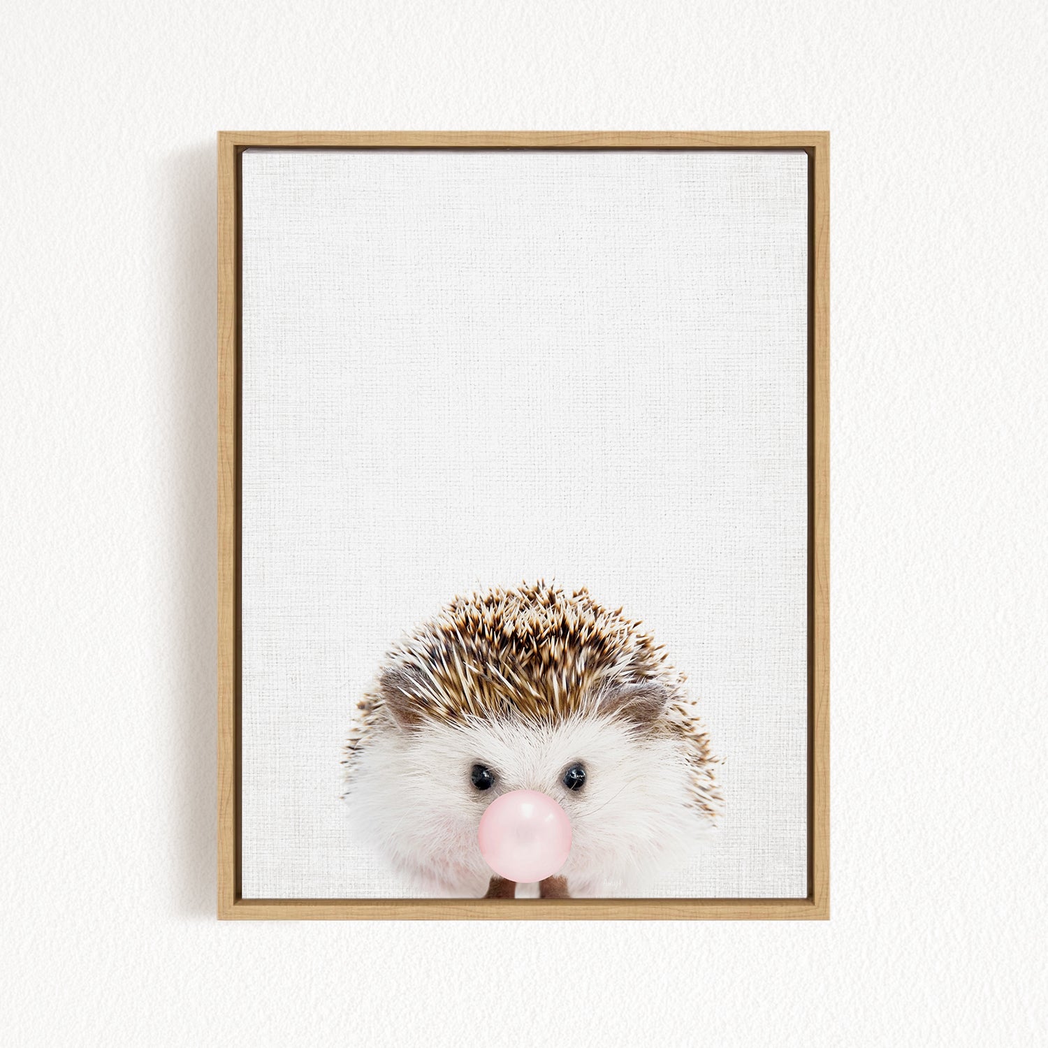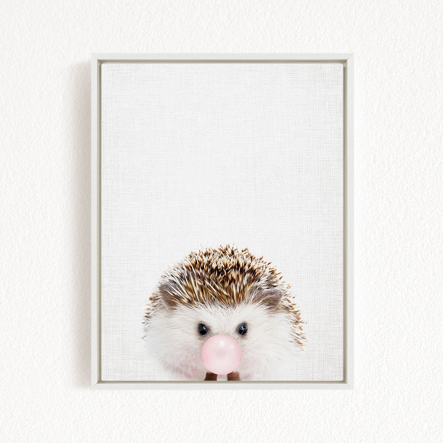 A framed image of a cute hedgehog blowing a bubble with a pink bubblegum flavor.
