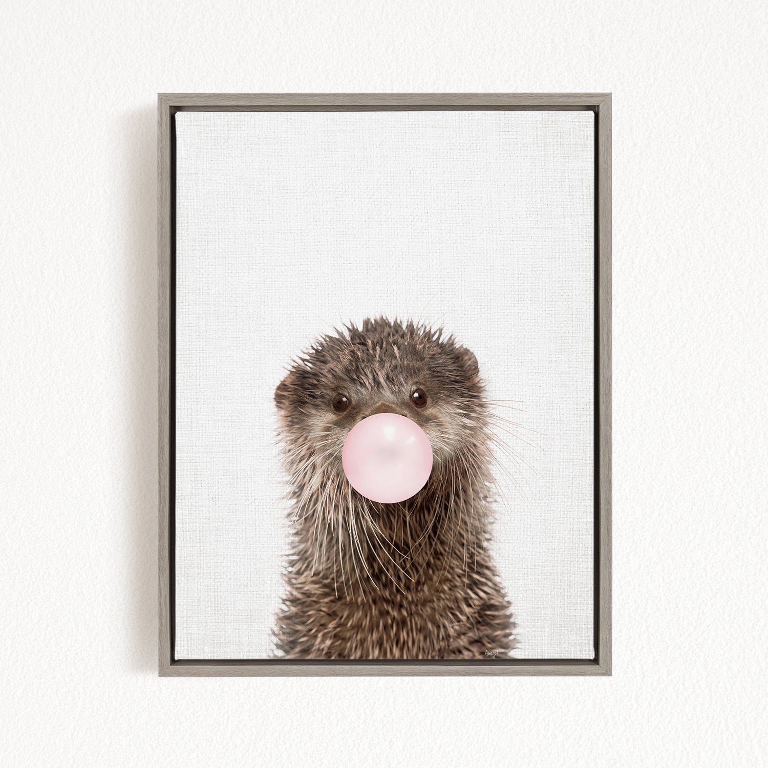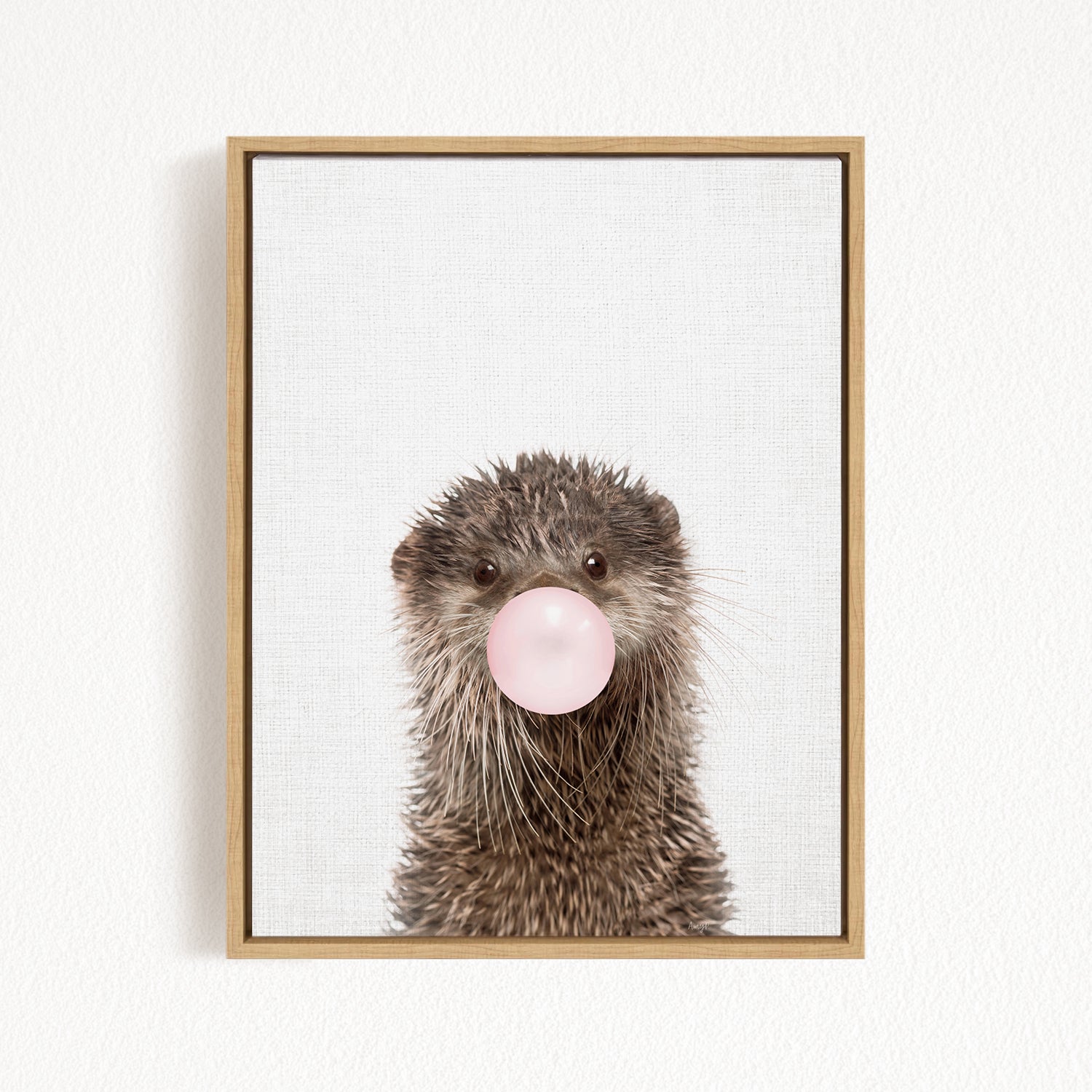 a cute otter blowing a bubble with a pink bubblegum bubble.