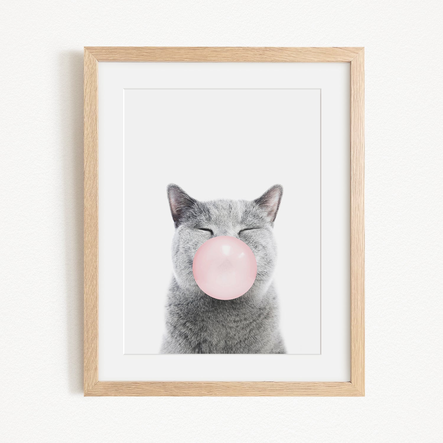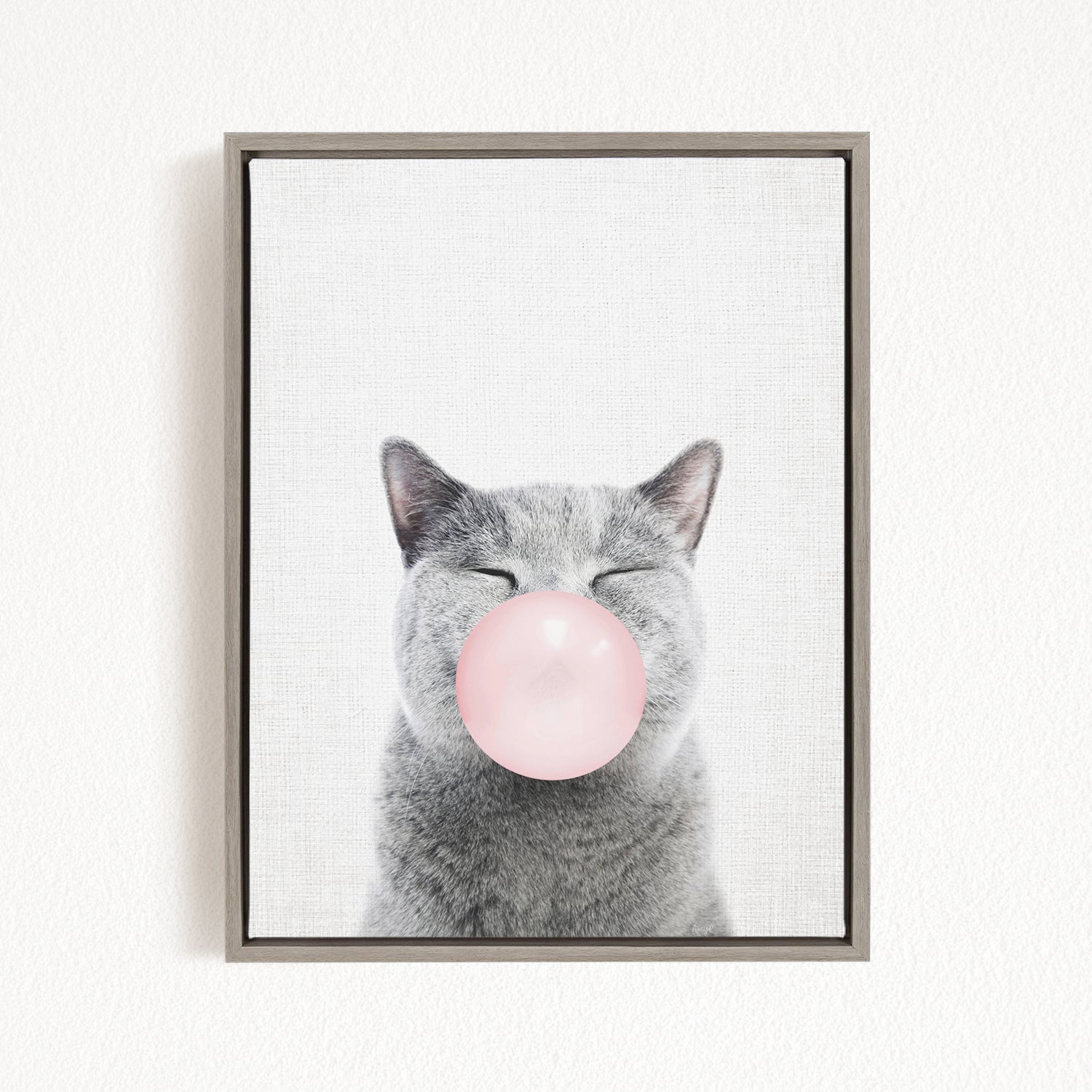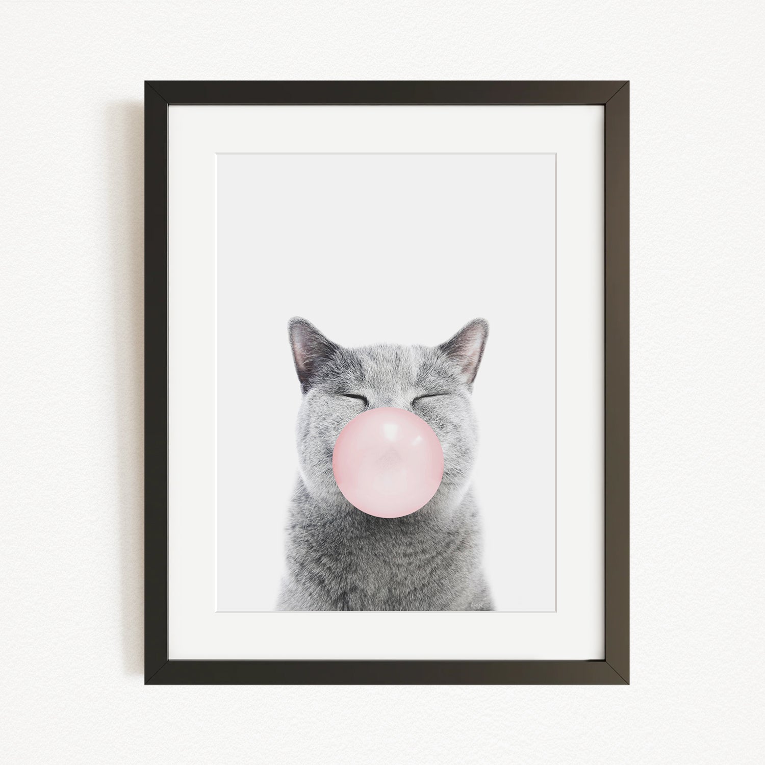 a gray cat blowing a bubble with a pink bubble gum bubble.