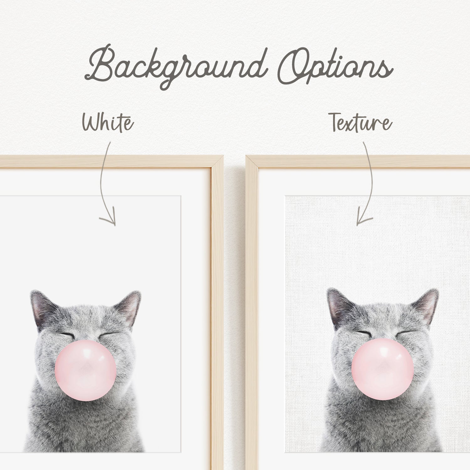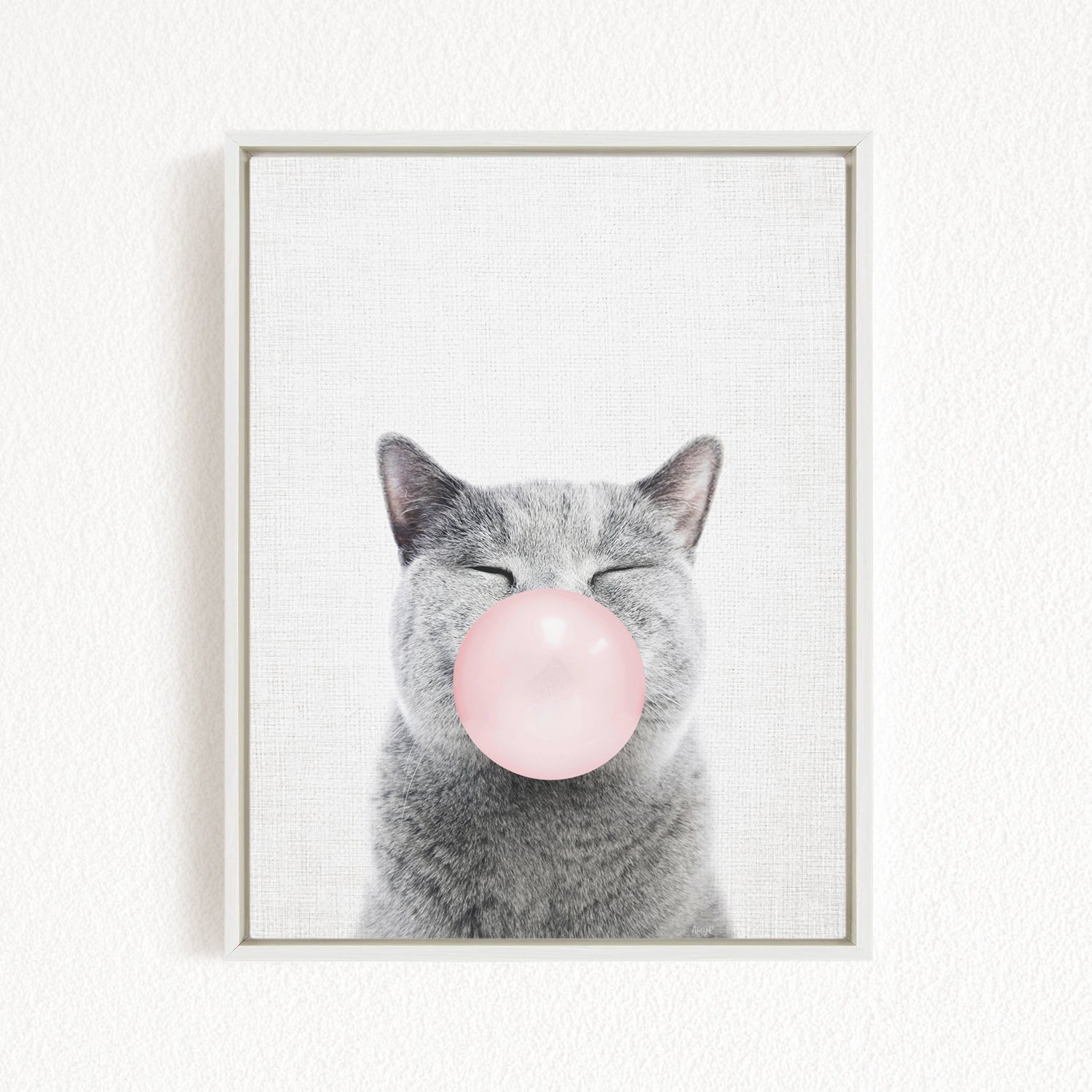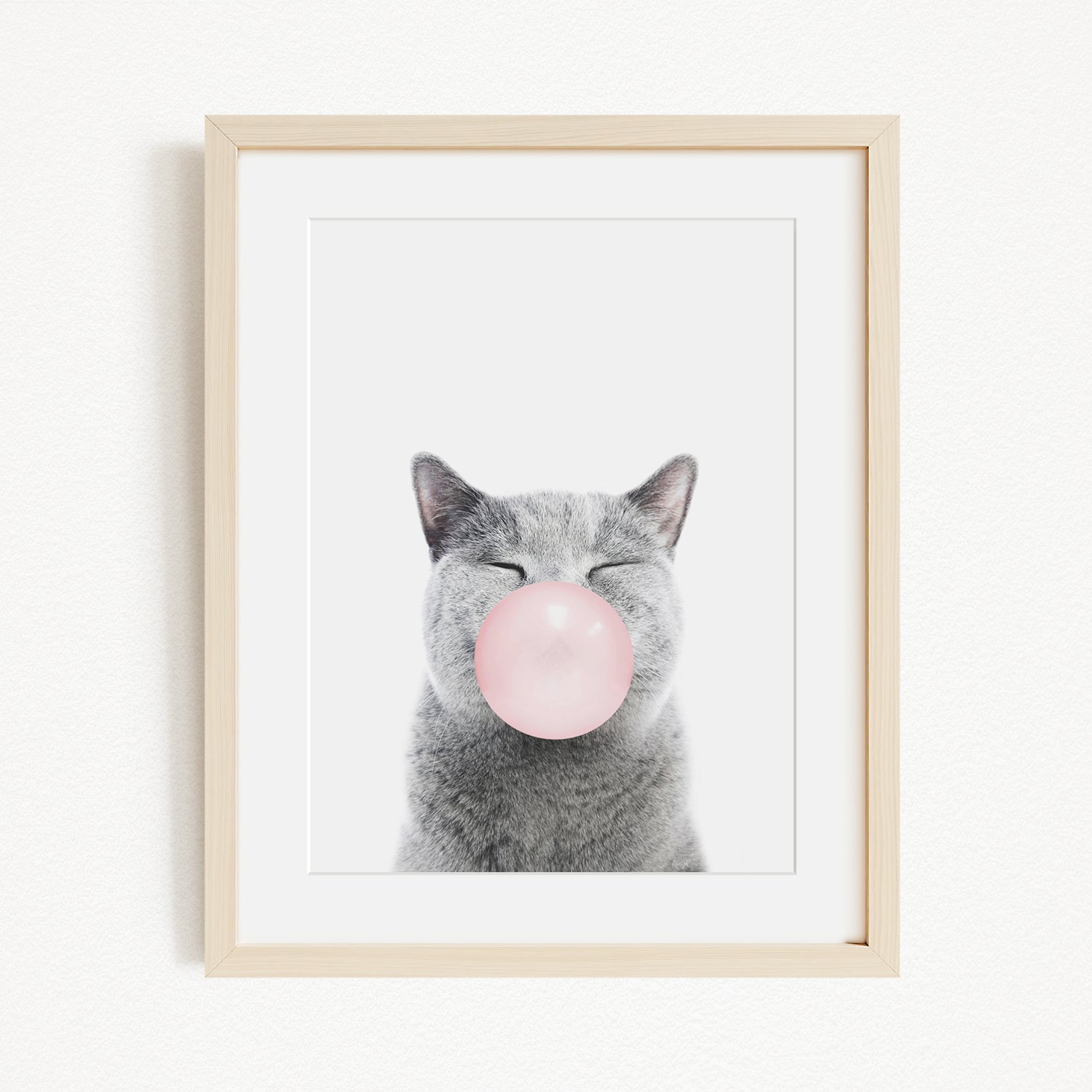 a gray cat blowing a bubble with a pink bubble gum bubble.
