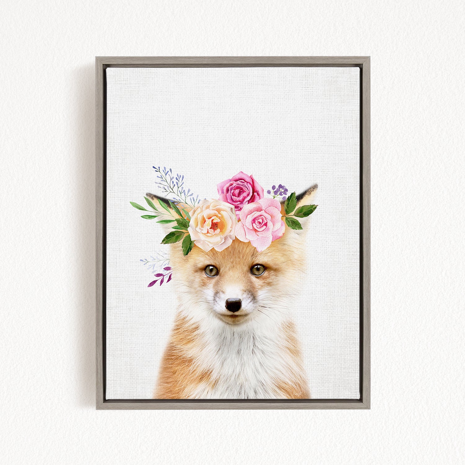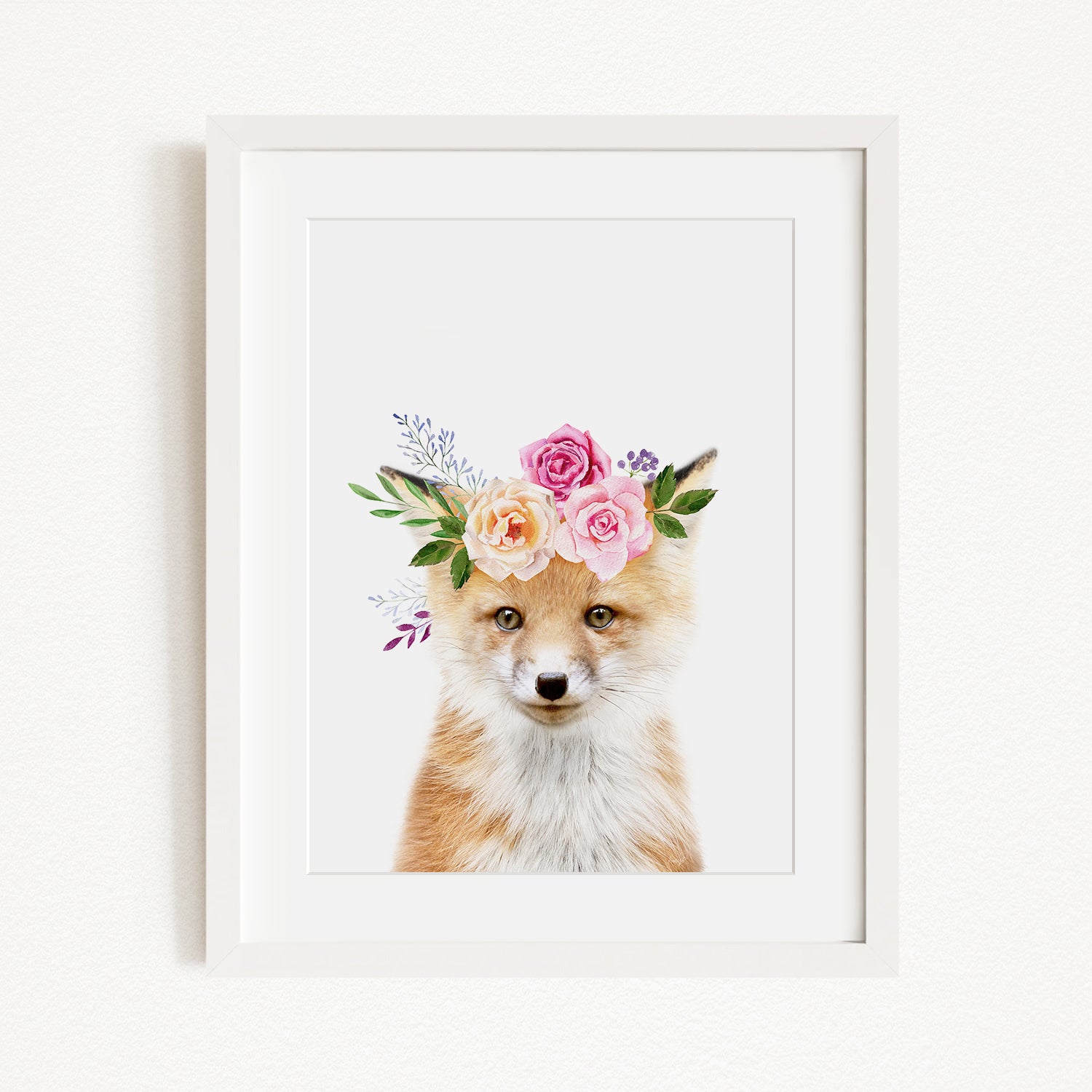 A framed print of a fox wearing a floral crown of pink and white roses and greenery.