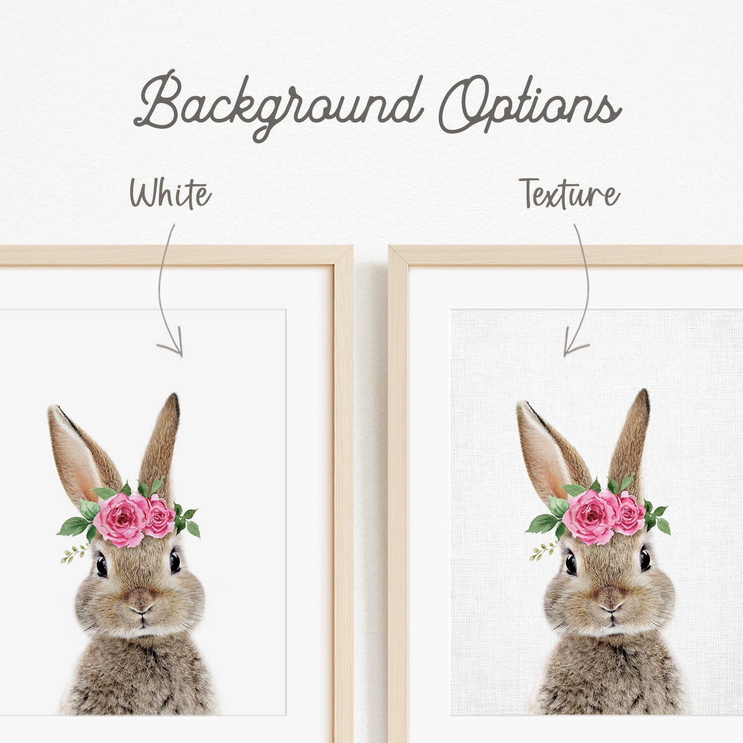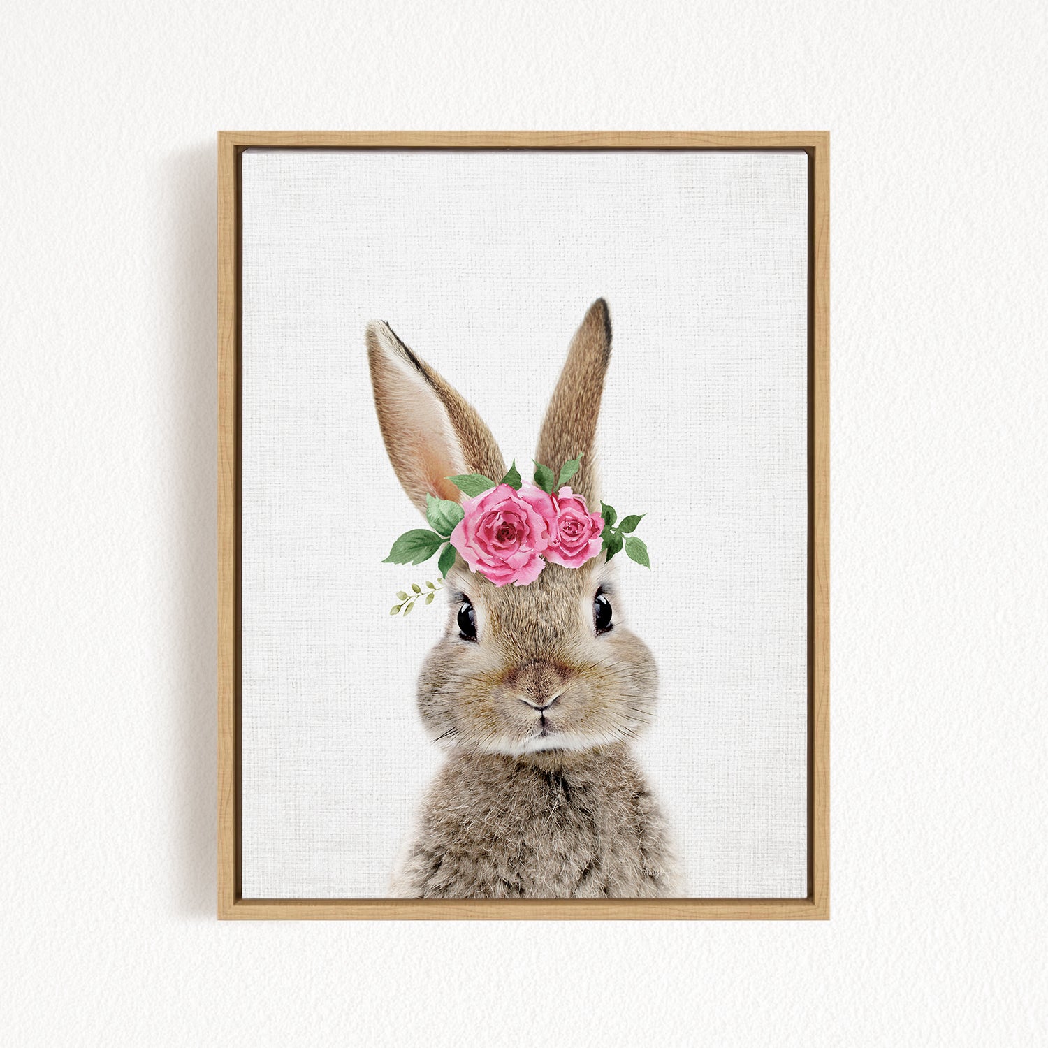 A framed image of a rabbit wearing a floral crown of pink roses.