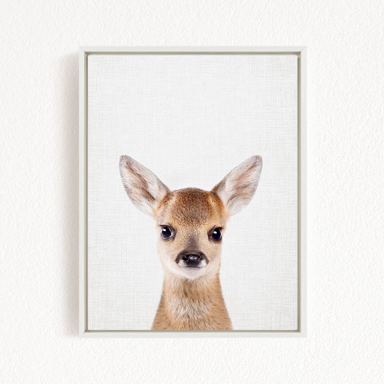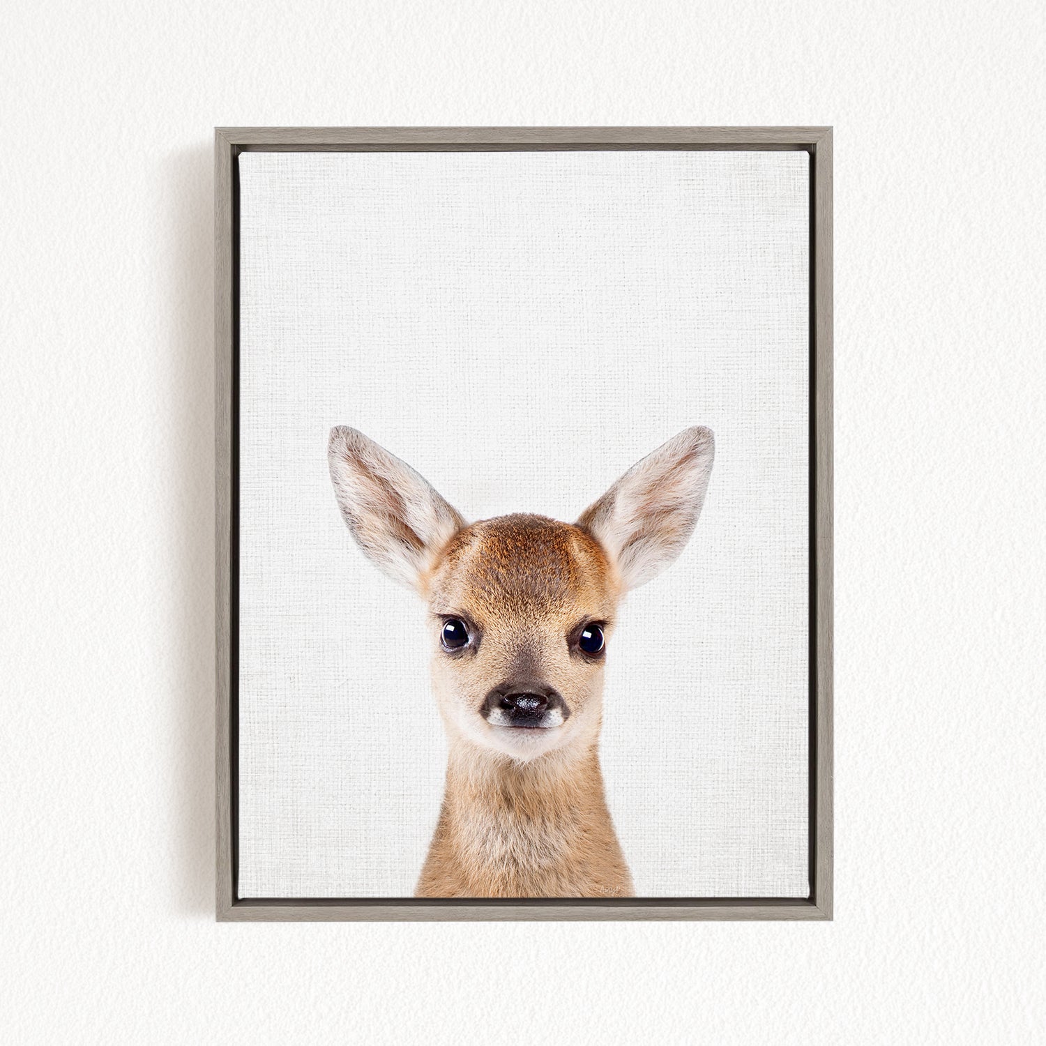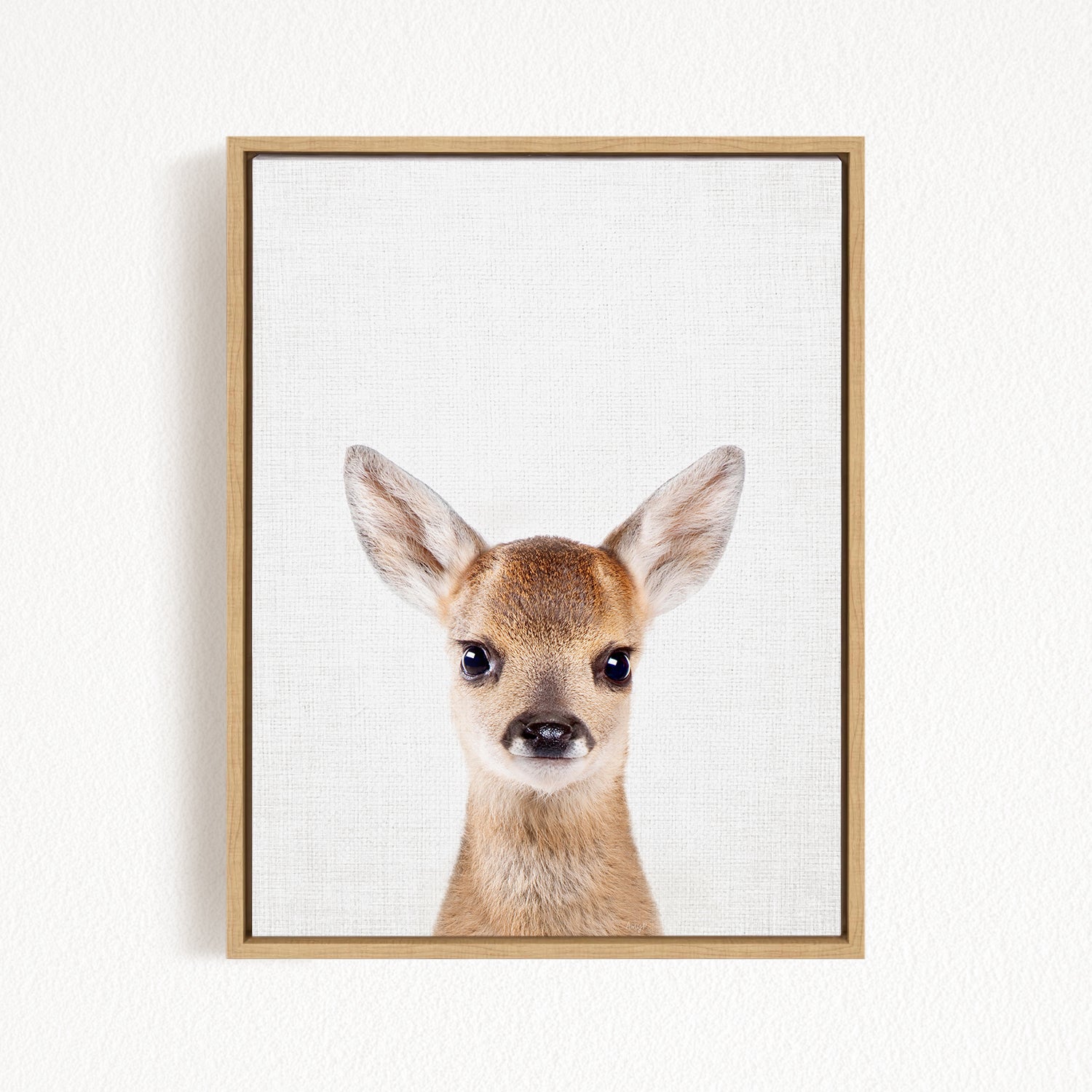 A framed print of a deer's head with large, alert eyes and a small nose, set against a plain white background.