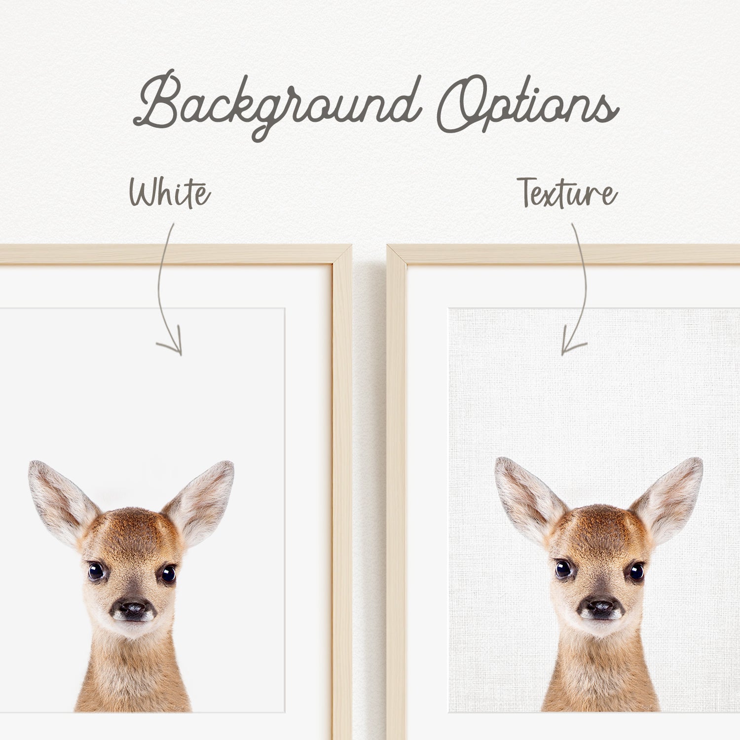 a close-up of a deer's face, with two framed pictures side by side. The text above the images indicates that there are two different backgrounds available, with one being white and the other being a different texture.