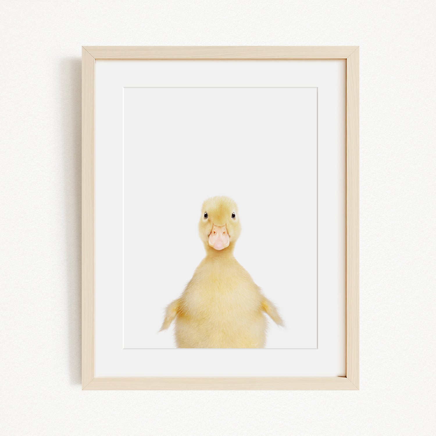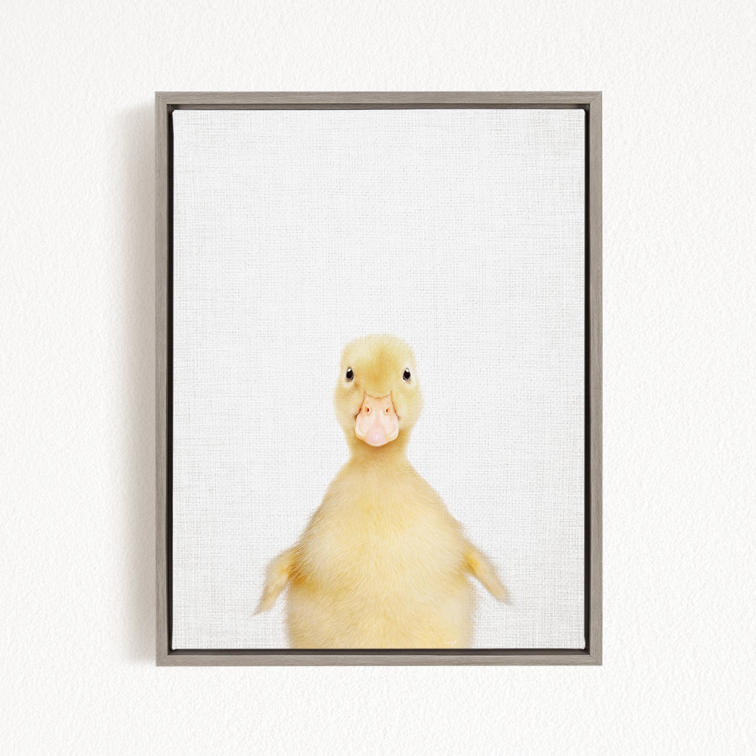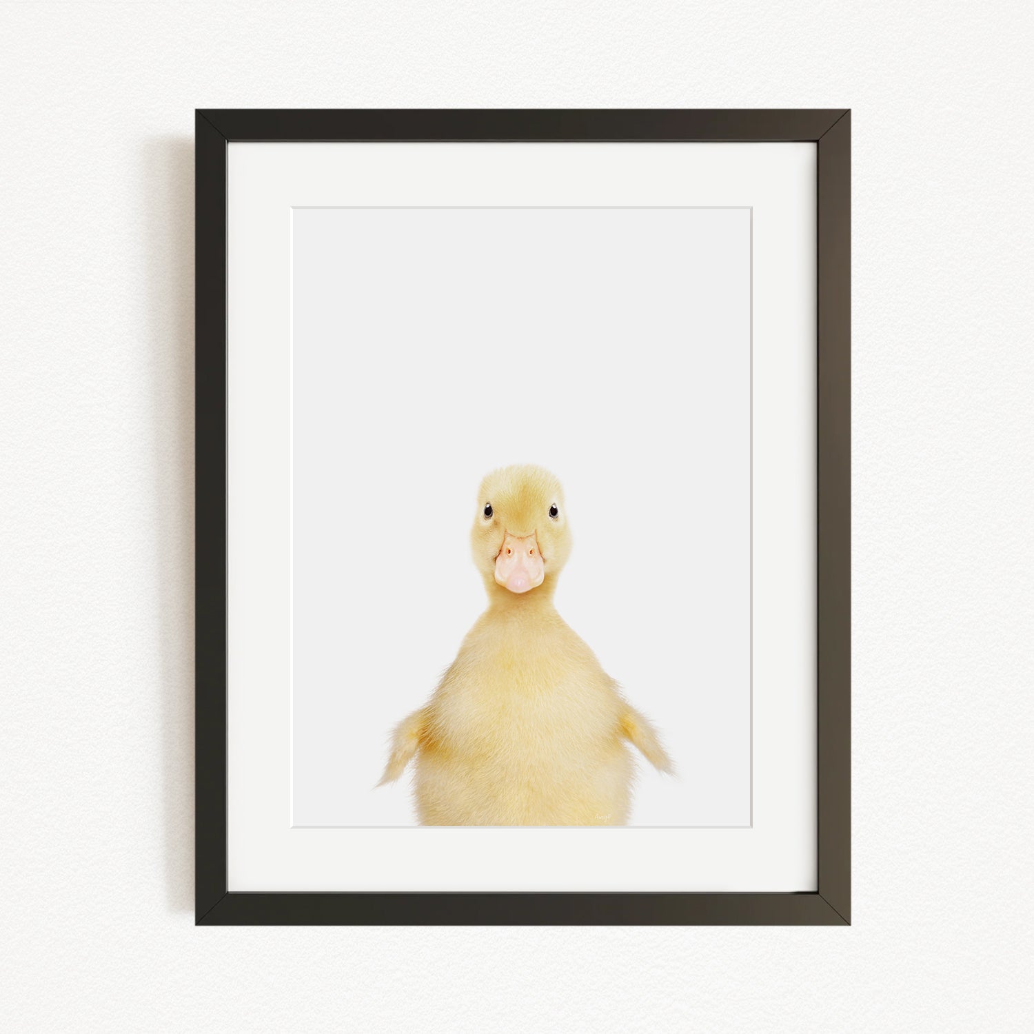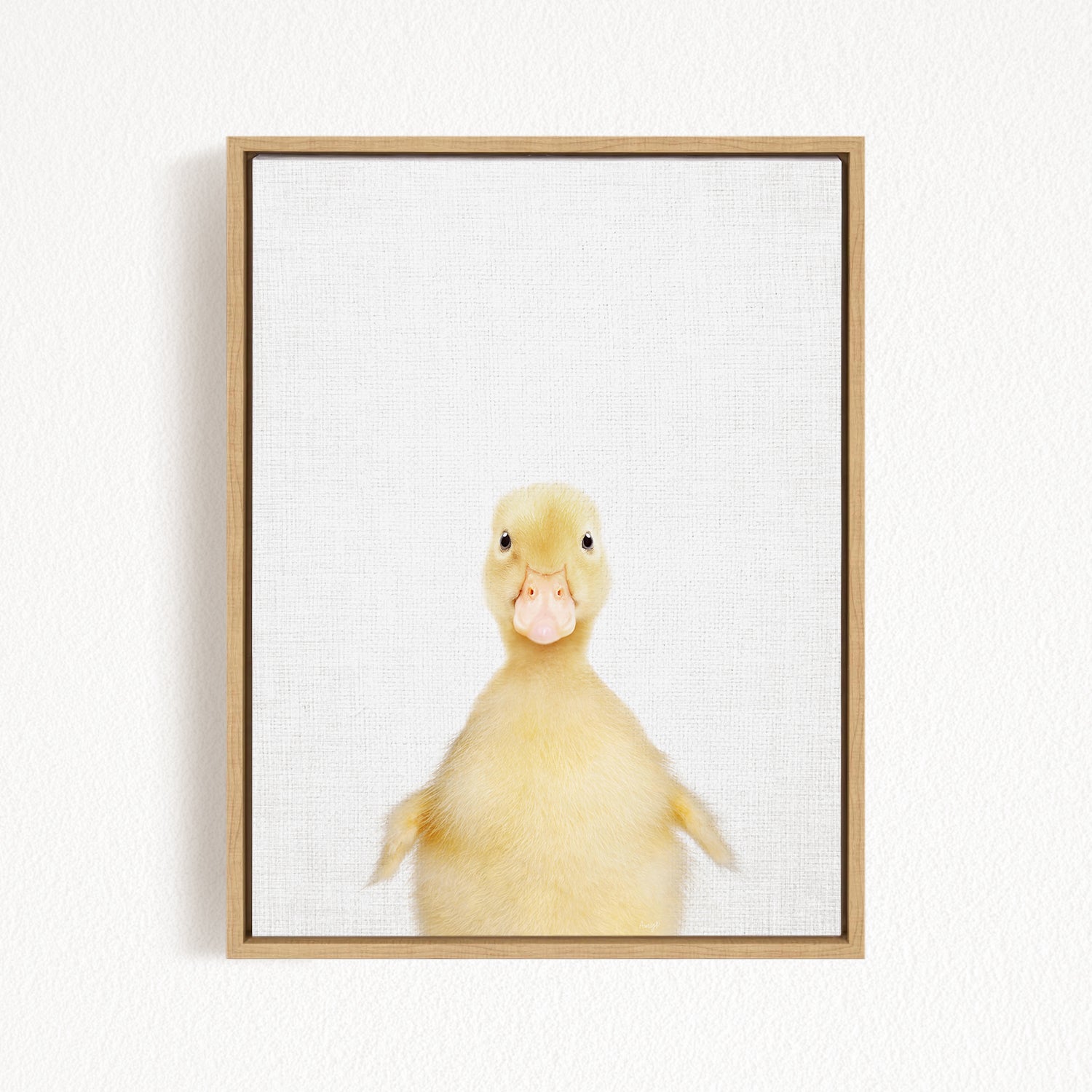 A cute yellow duck with a pink beak is the main subject of the framed print, which is displayed on a white wall.