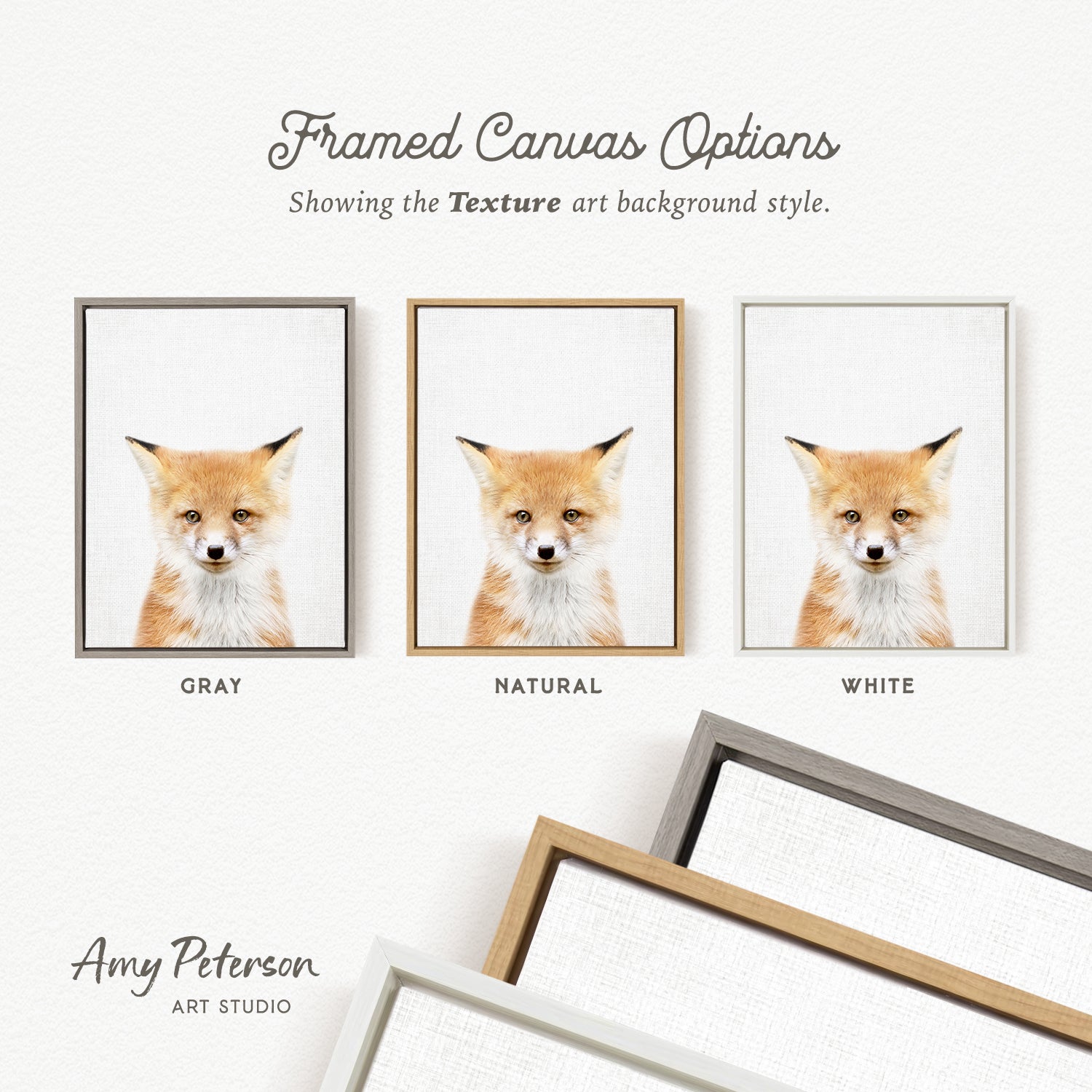 A framed print of a young fox with a white background and a black border, displayed on a wooden floor against a white wall.