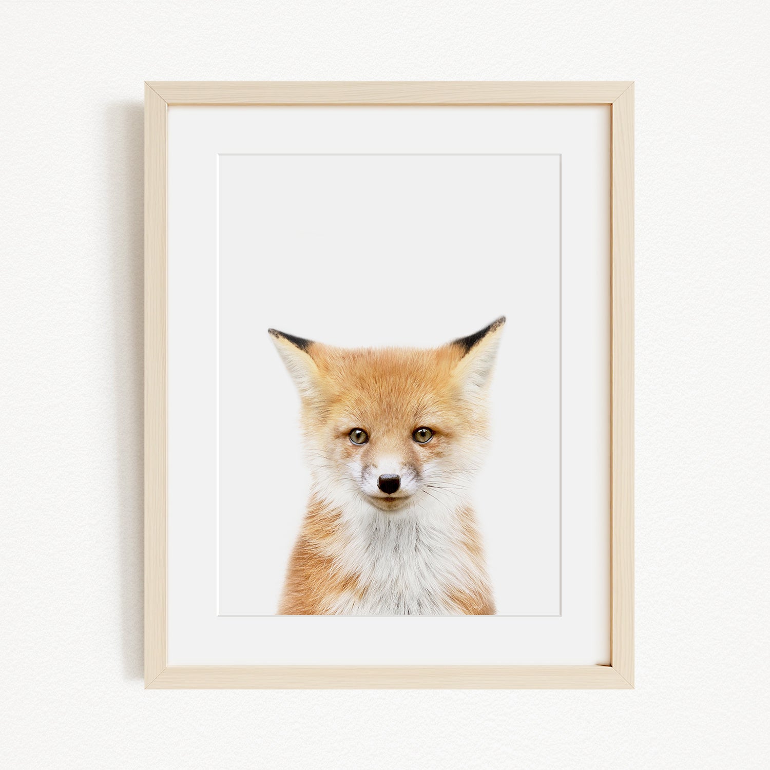 A framed print of a young fox with a friendly expression, looking directly at the camera.