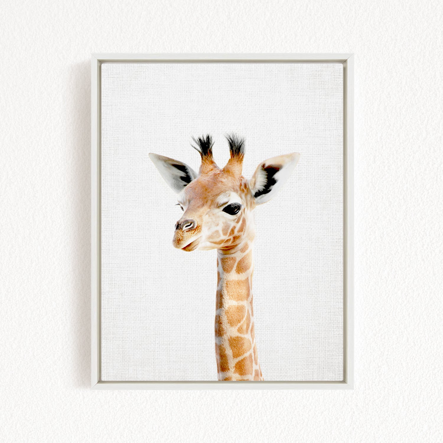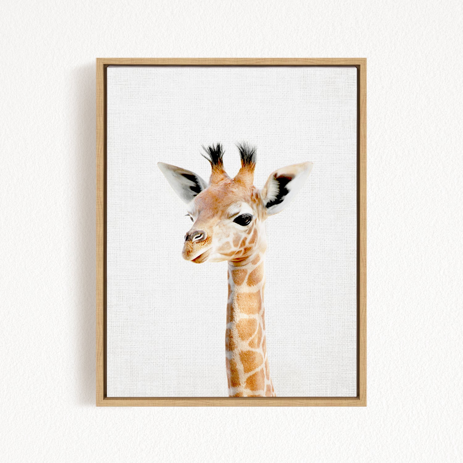 A framed photograph of a giraffe's head, with its distinctive long neck and spotted coat, is displayed on a white wall.