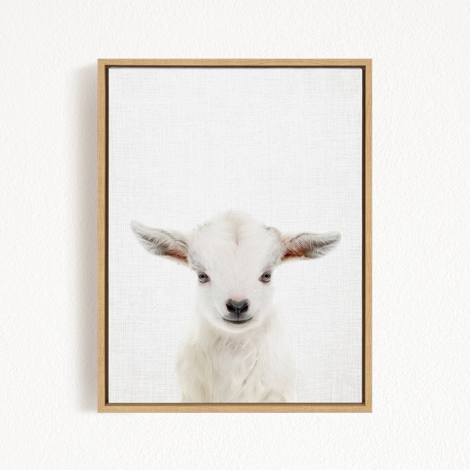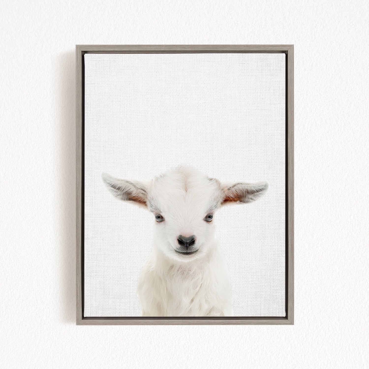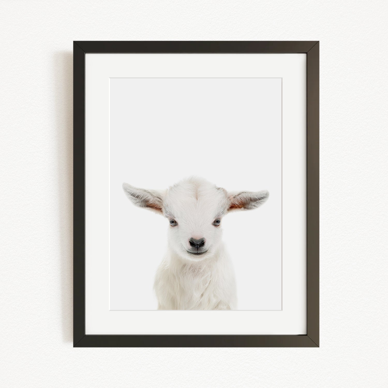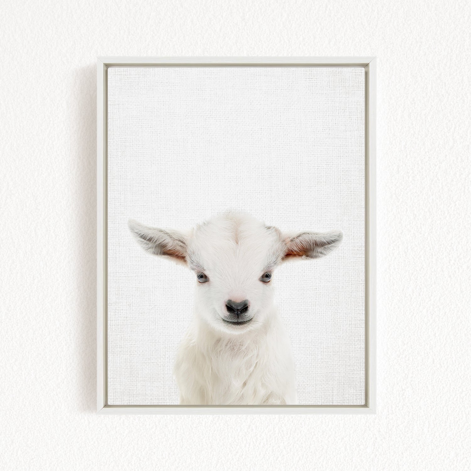 A white lamb with large ears is the focus of the image, which is a framed print of a close-up portrait of a baby goat.