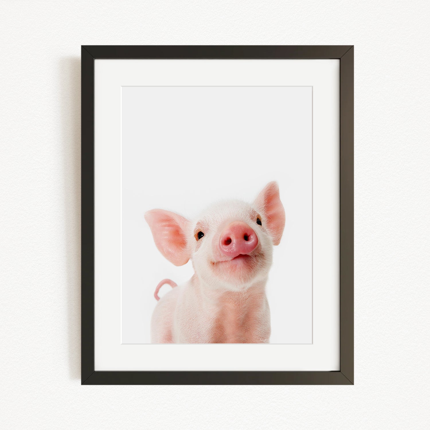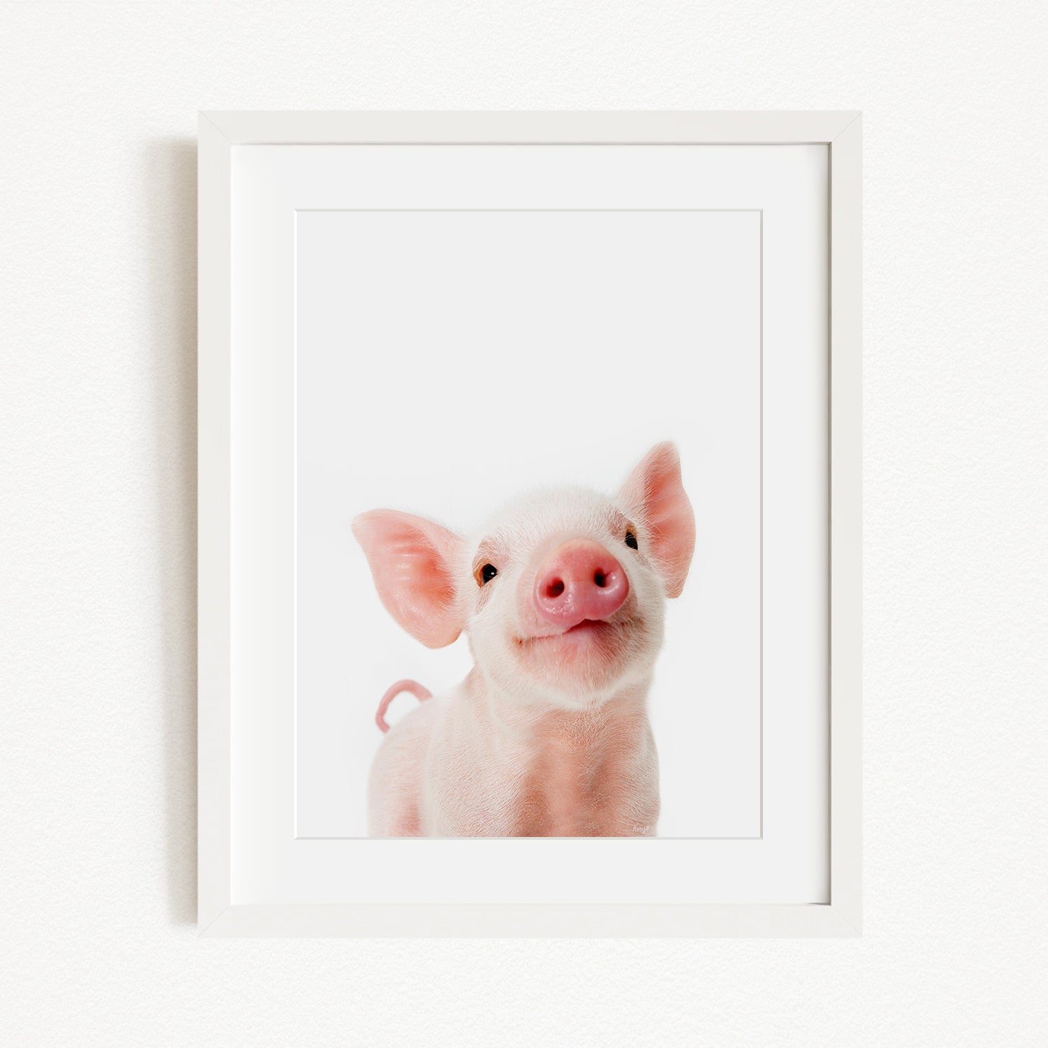 A cute, pink pig with large ears and a pink nose is the main subject of the image, which is a framed picture hanging on a white wall.