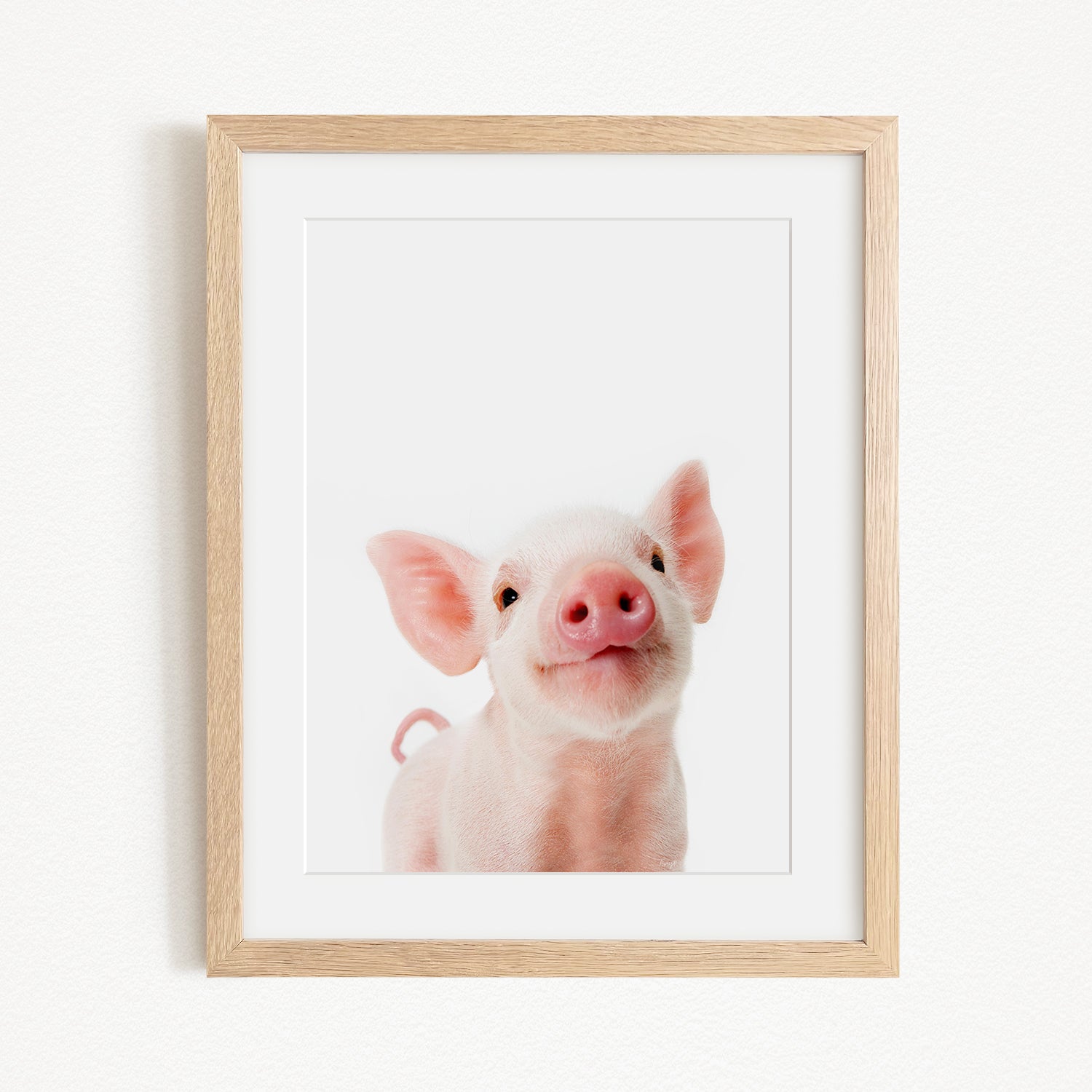 A cute, pink pig with large ears and a pink nose is the main subject of the framed image.