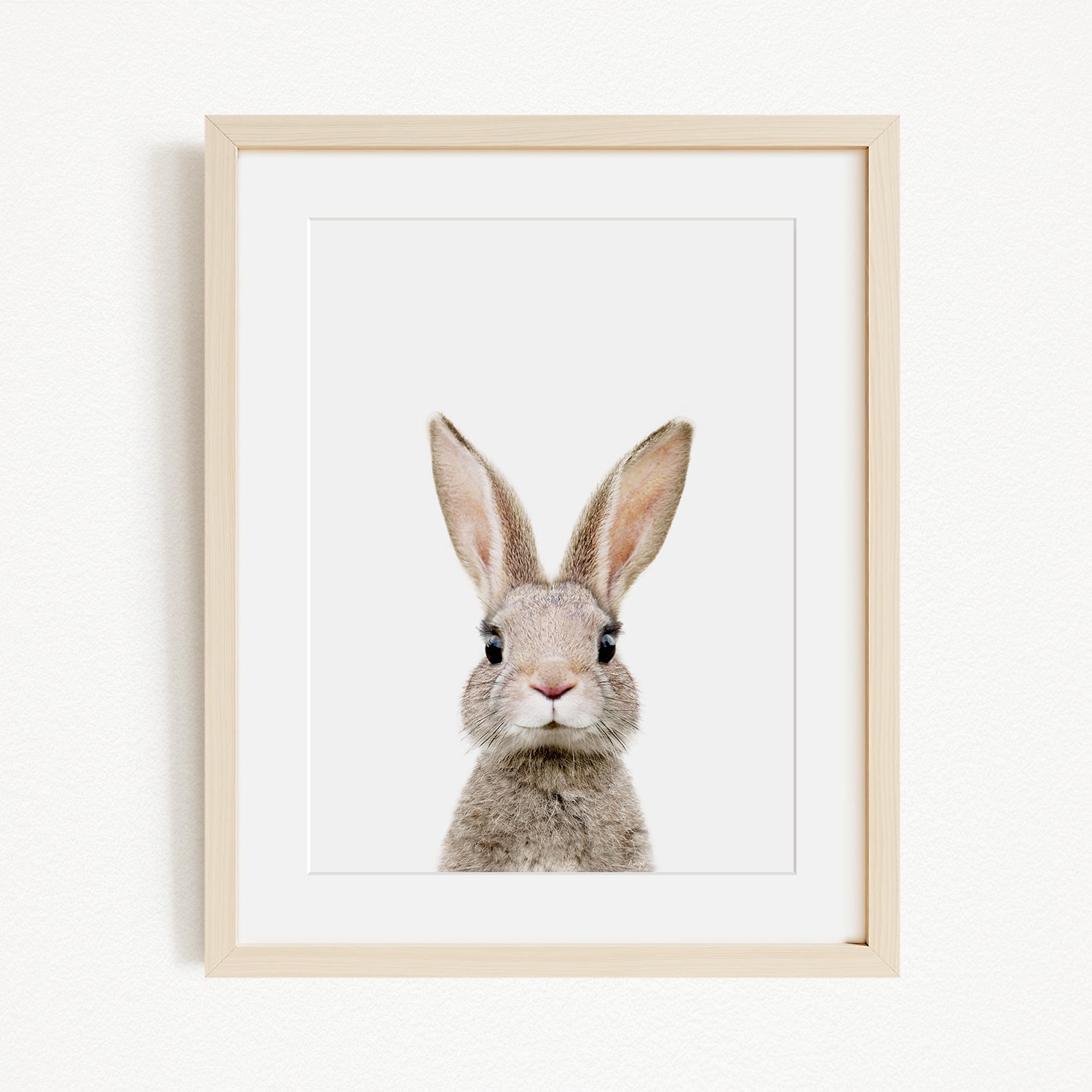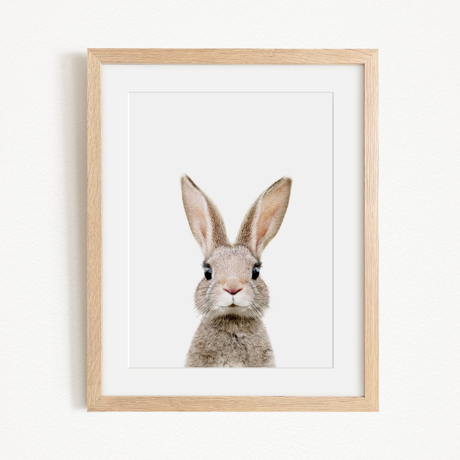 A cute, fluffy rabbit with large ears and a pink nose is the main subject of the framed image.