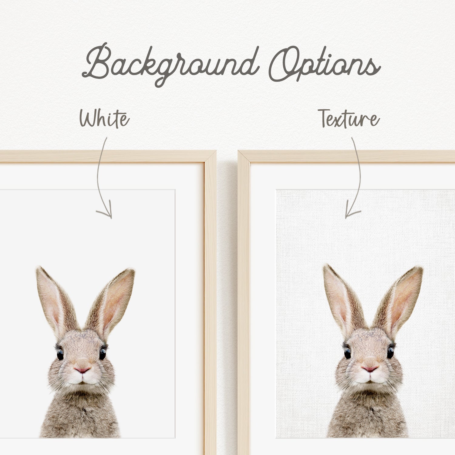 a close-up of a rabbit's face, with two framed pictures side by side. The text above the images indicates that there are two different backgrounds available, with one being white and the other being a different texture.