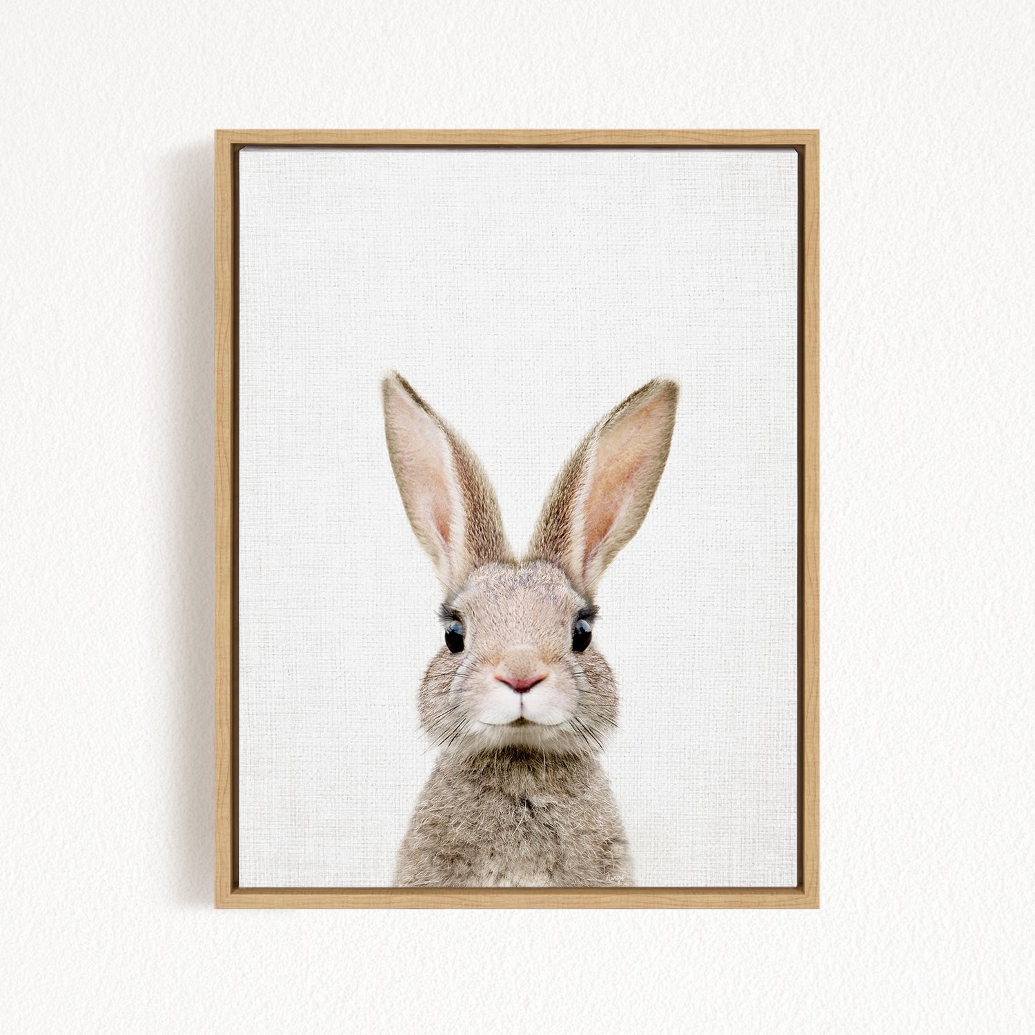 A framed image of a rabbit with large ears and a curious expression.