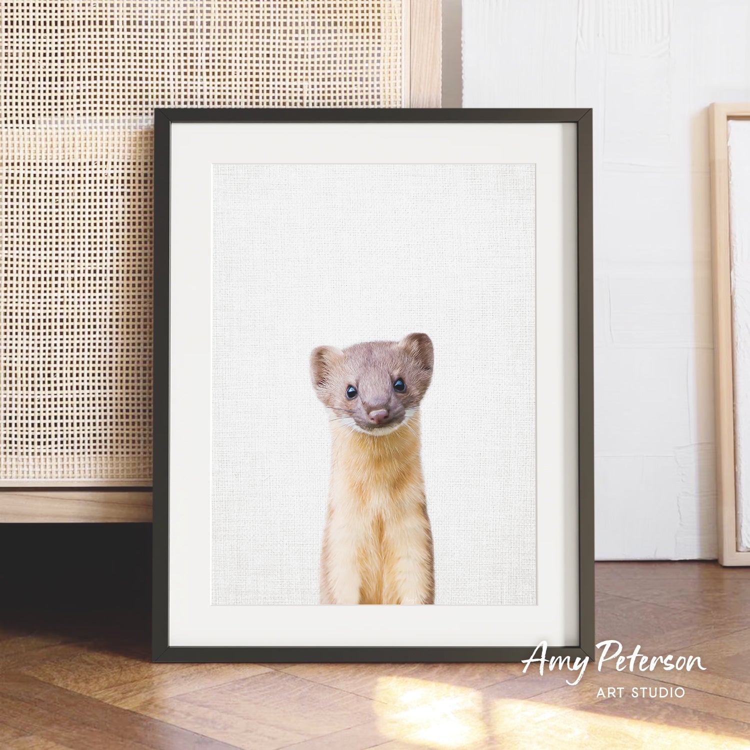 A small, curious-looking animal with a white face and brown fur is the focus of the image, which is framed and displayed on a white wall.
