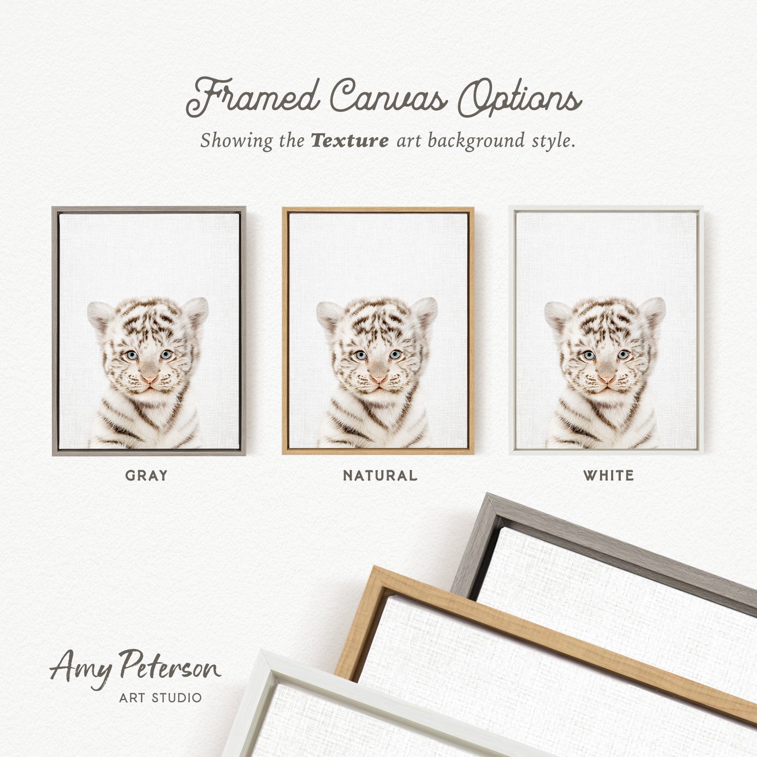 three framed canvas options, each with a different background color: gray, natural, and white. The text above the options reads " Framed Canvas Options" and "Showing the Texture art background style." The text below the options reads "Grays," "NATURAL," and "WHITE." The artist's name, Amy Peterson, is also mentioned at the bottom of the image.