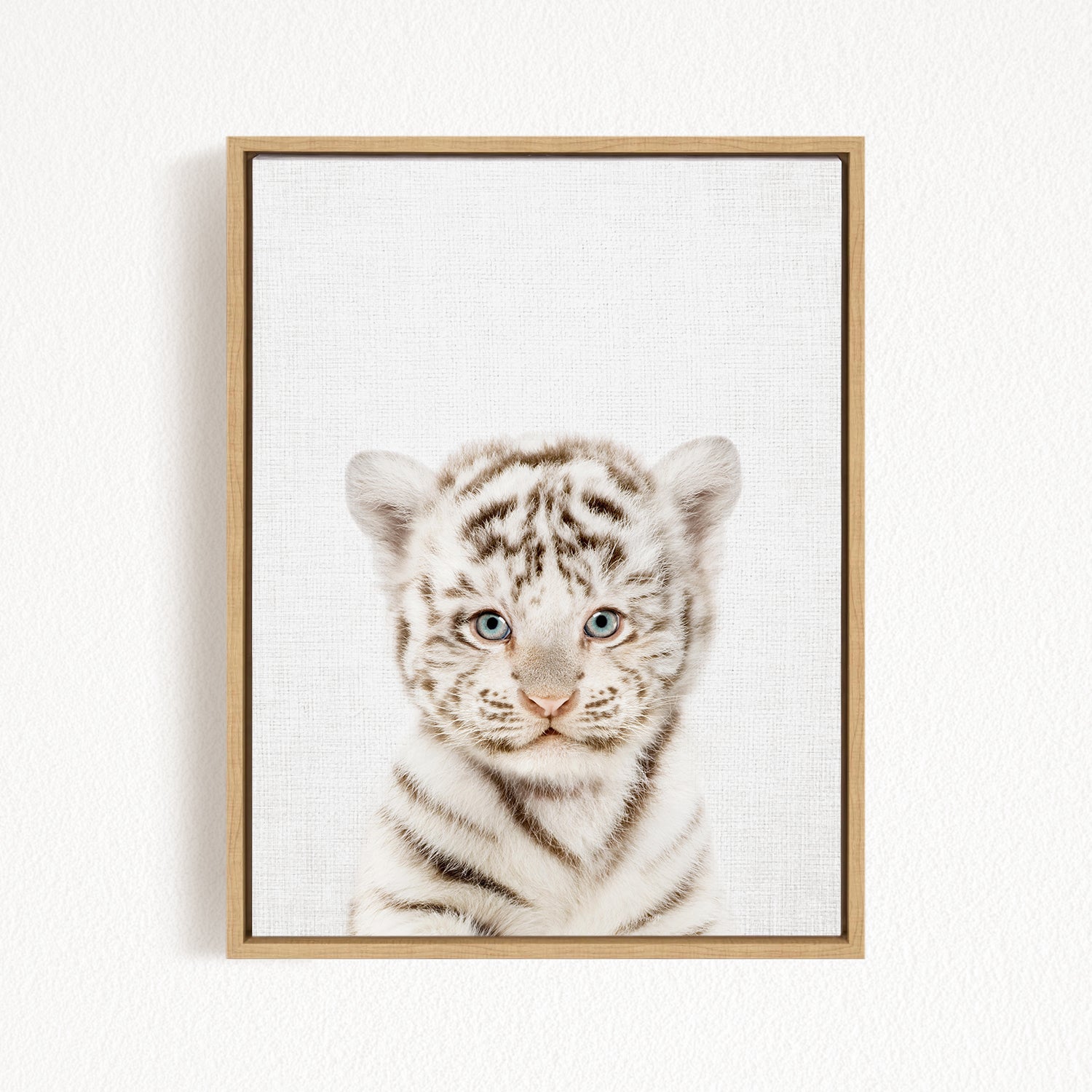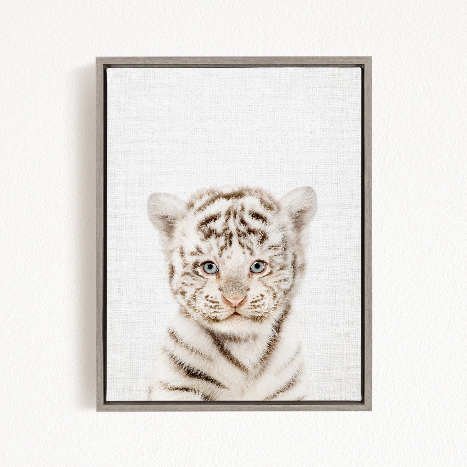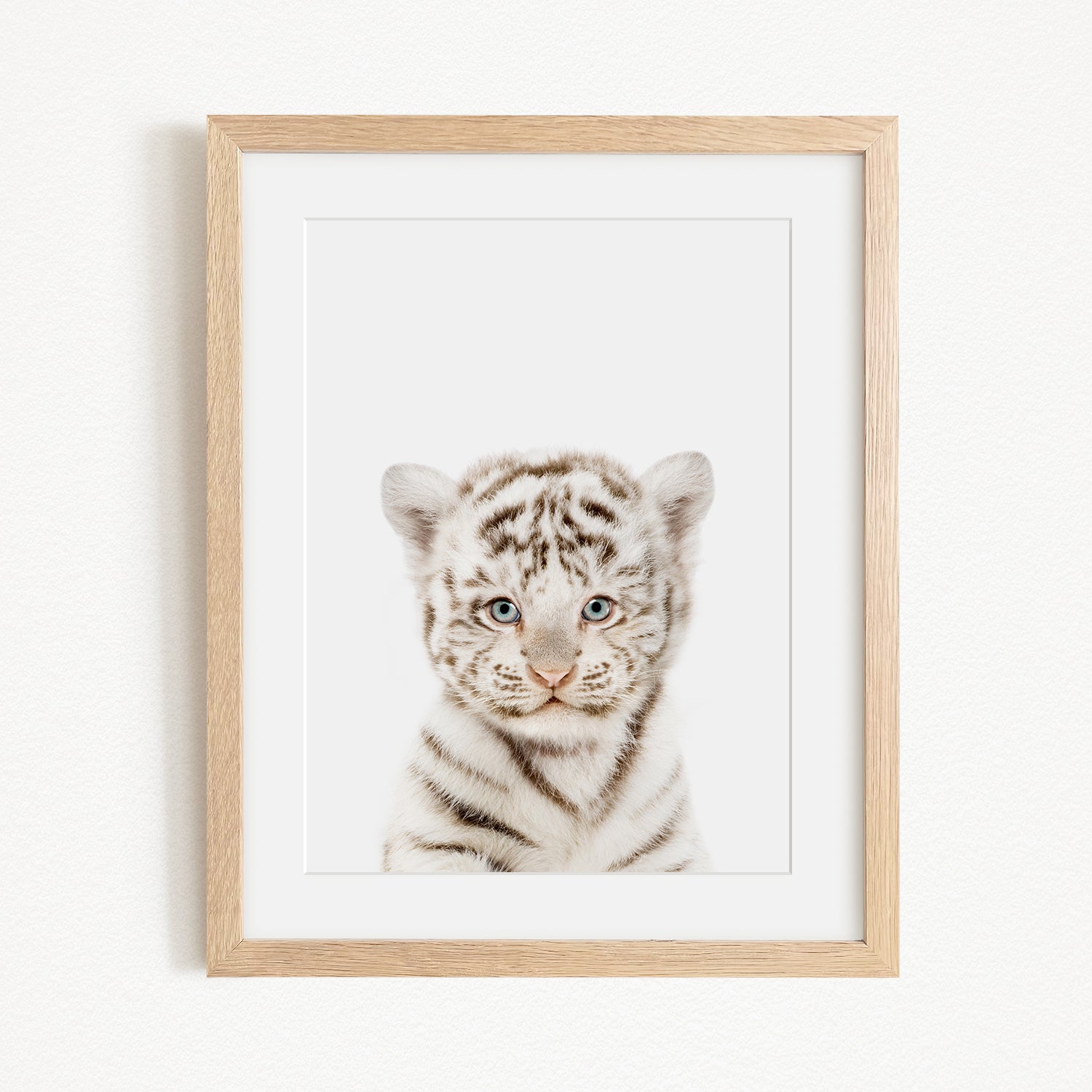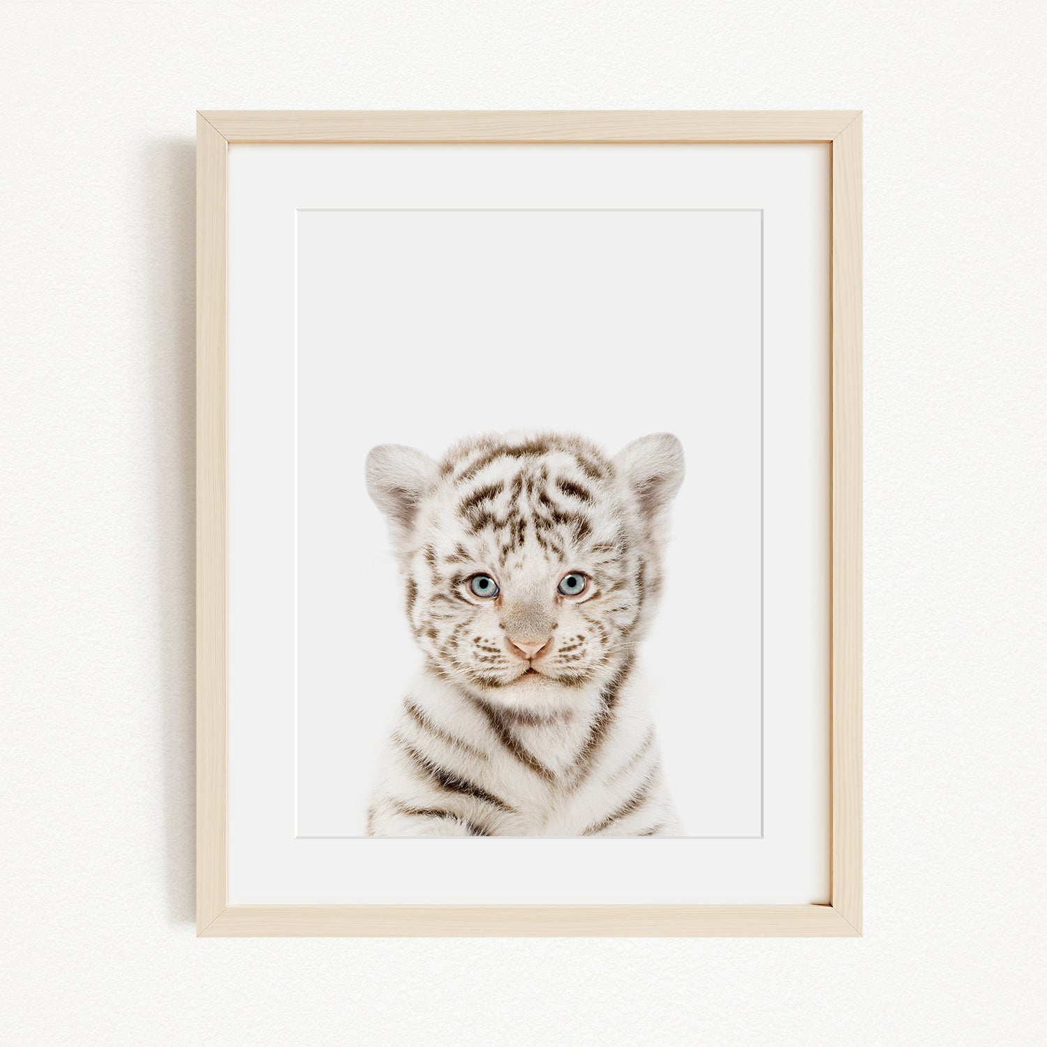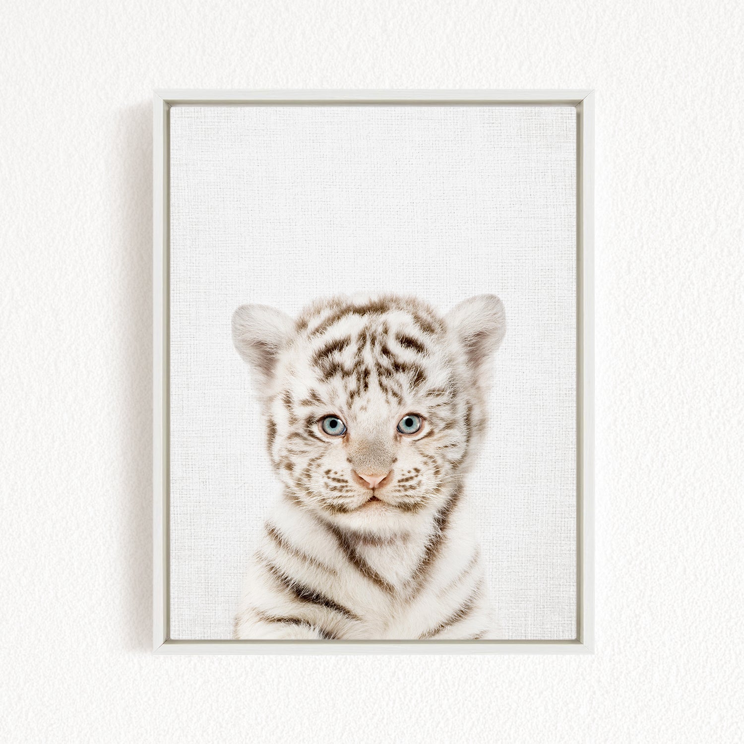 A framed photograph of a young tiger cub with striking blue eyes and a white and black striped coat.