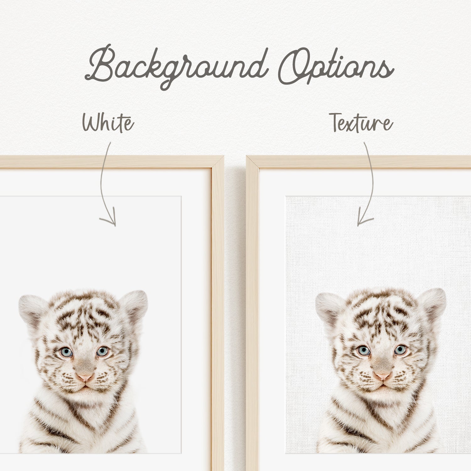 A young tiger cub with striking blue eyes and a playful expression is the focal point of the framed image.