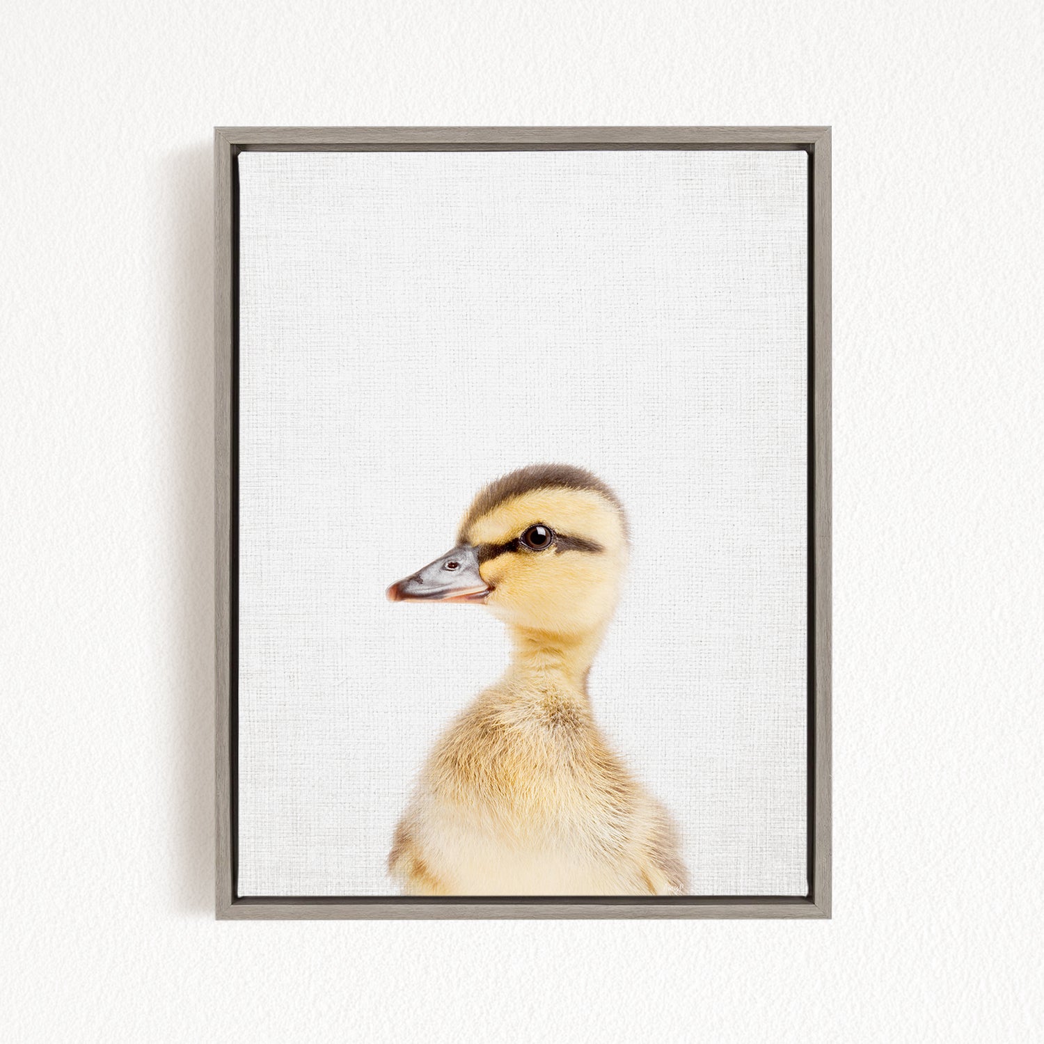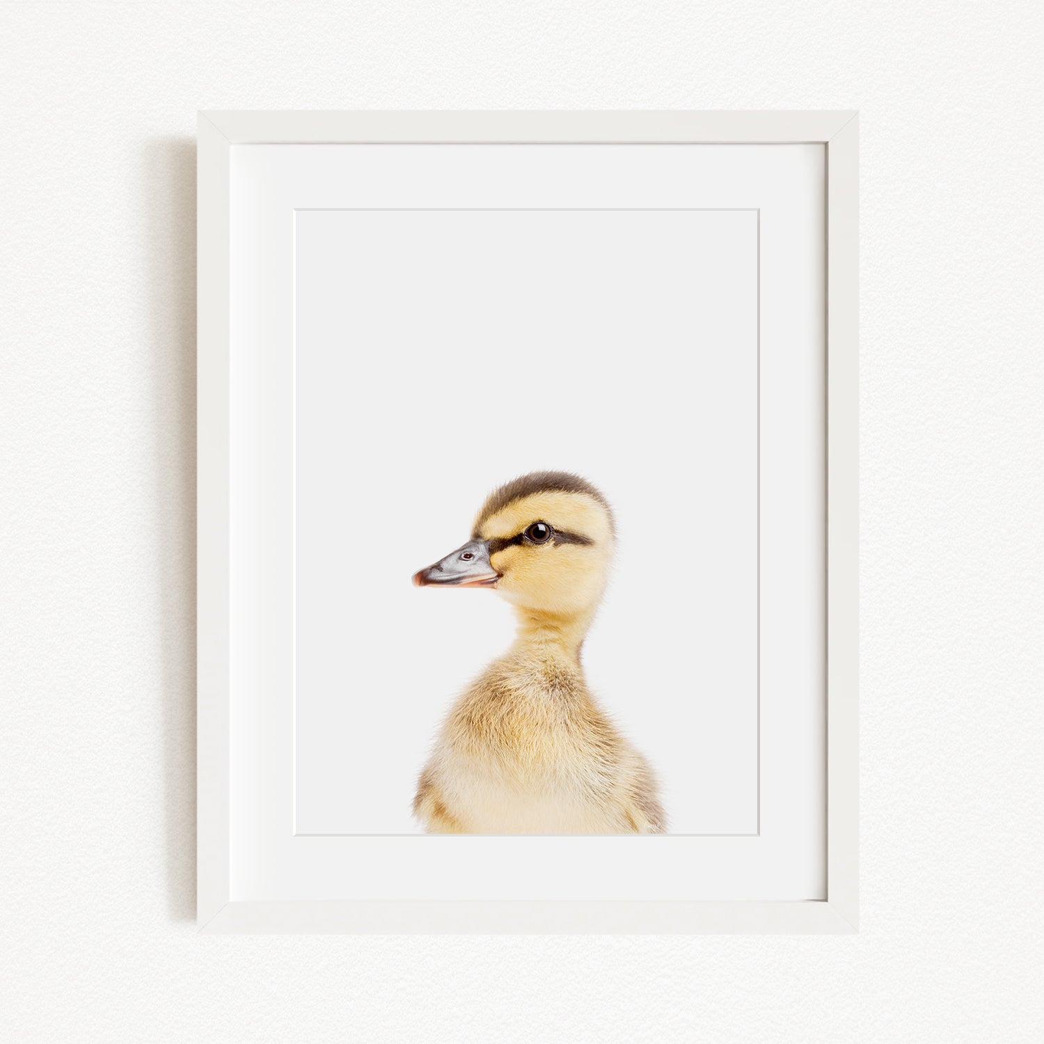 A young duckling with a yellow and brown coloration is the focus of the image, captured in a framed photograph against a plain white background.