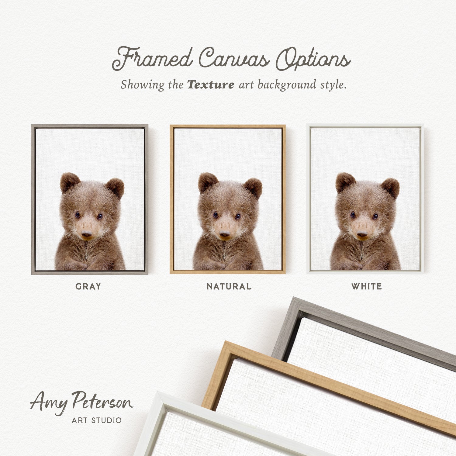 a close-up of a cute brown bear cub, with two framed pictures side by side. The text above the images indicates that there are two different backgrounds available, with one being white and the other being a textured background.