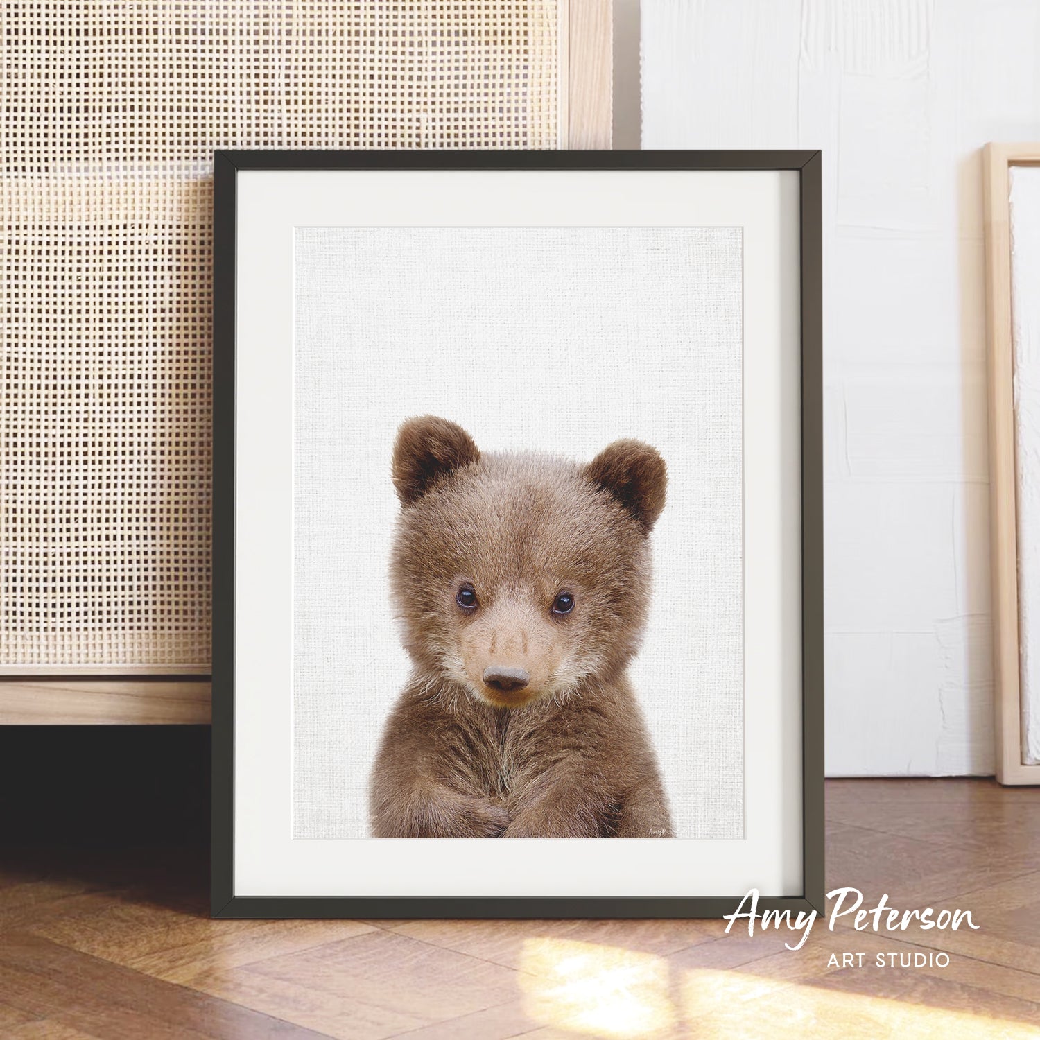 A framed photograph of a cute brown bear cub is displayed on a wooden floor in front of a woven basket.