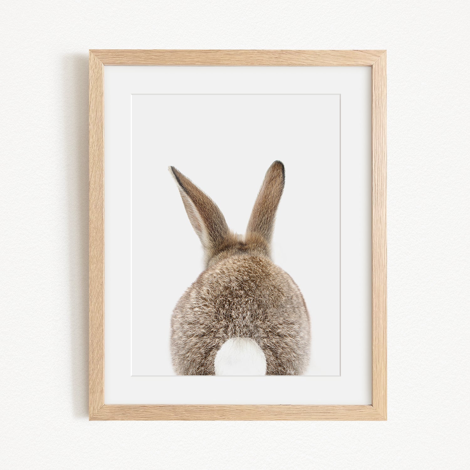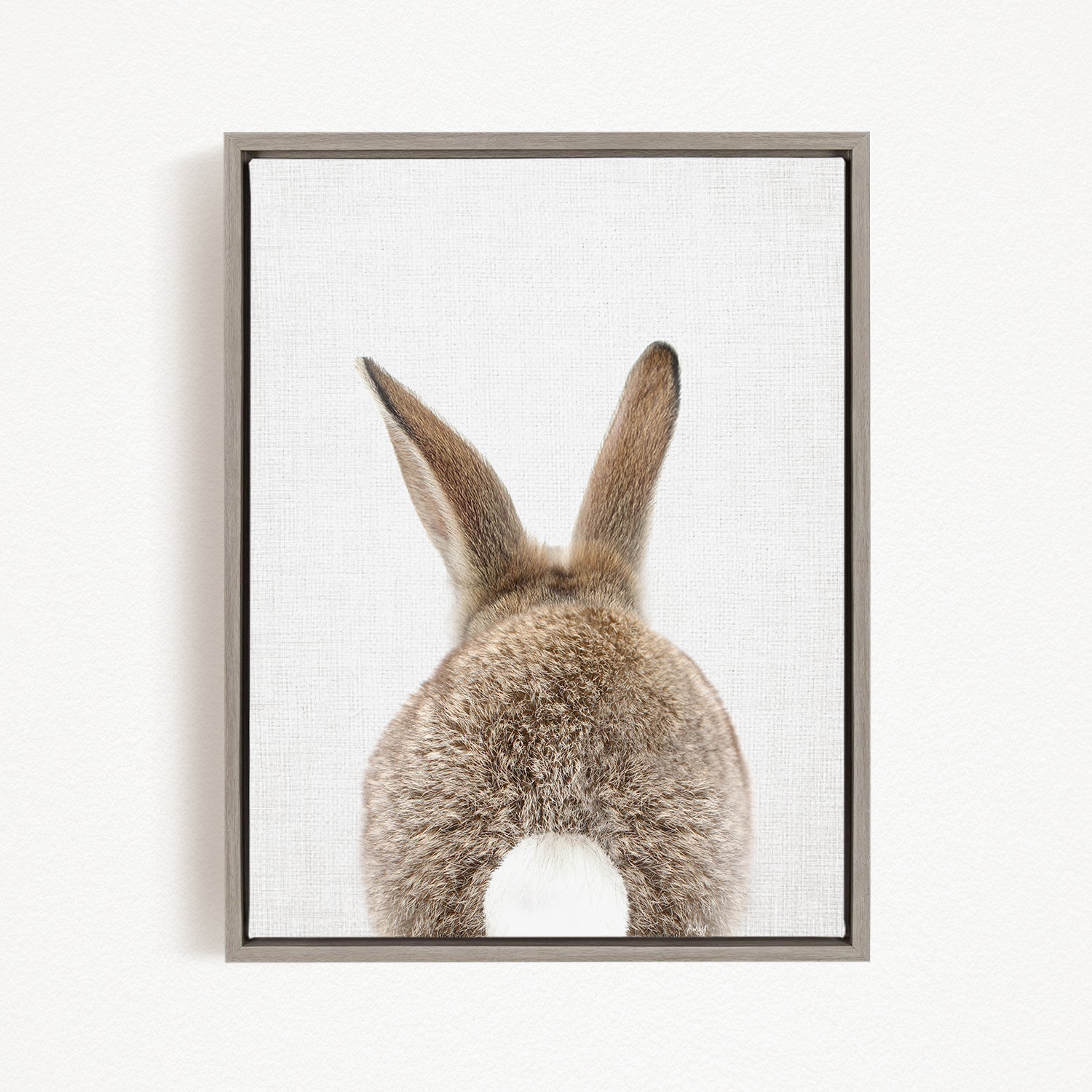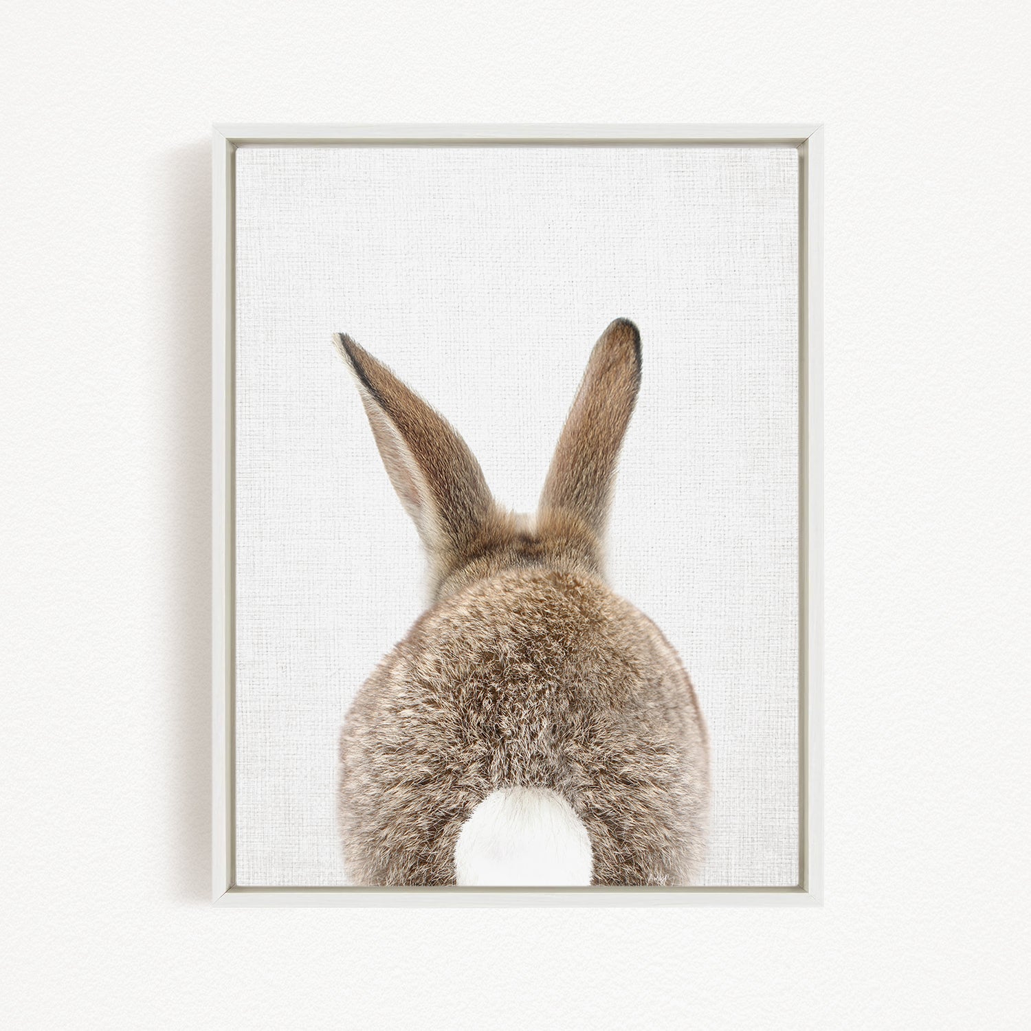 A framed image of a rabbit's back, showing its fluffy tail and ears.