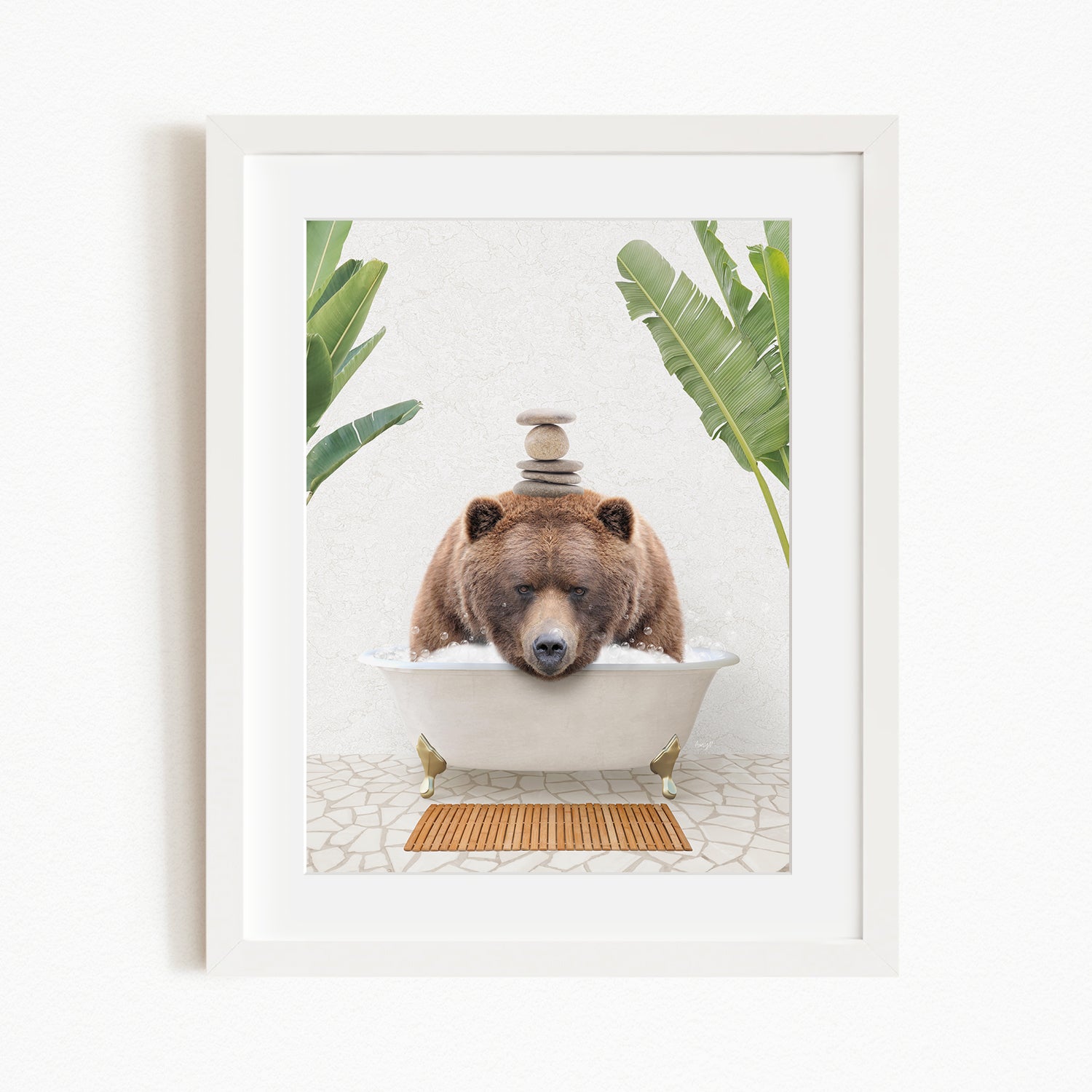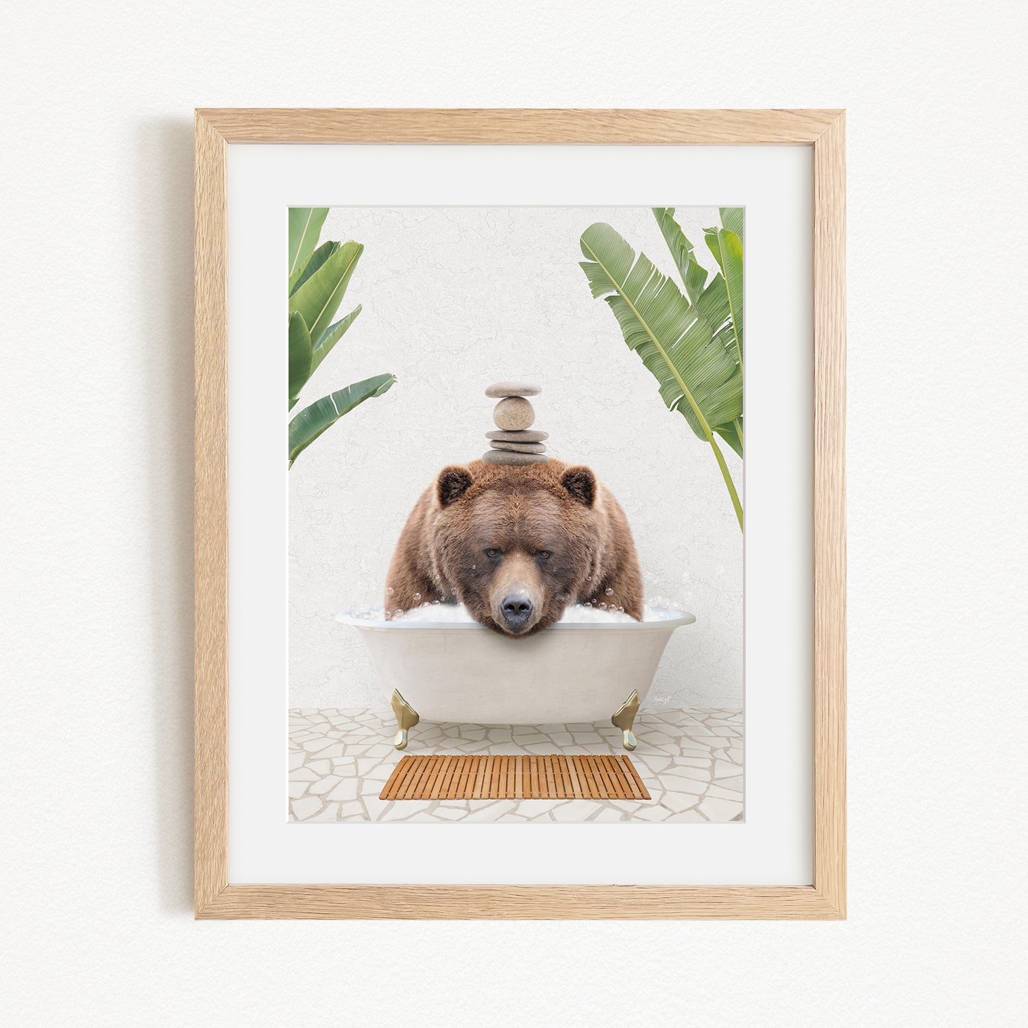 A brown bear is sitting in a white bathtub filled with water, surrounded by green leaves and a wooden mat on the floor.