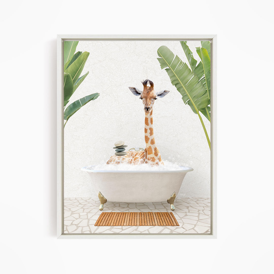 A giraffe is sitting in a bathtub filled with bubbles, surrounded by tropical plants and a wooden mat on the floor.