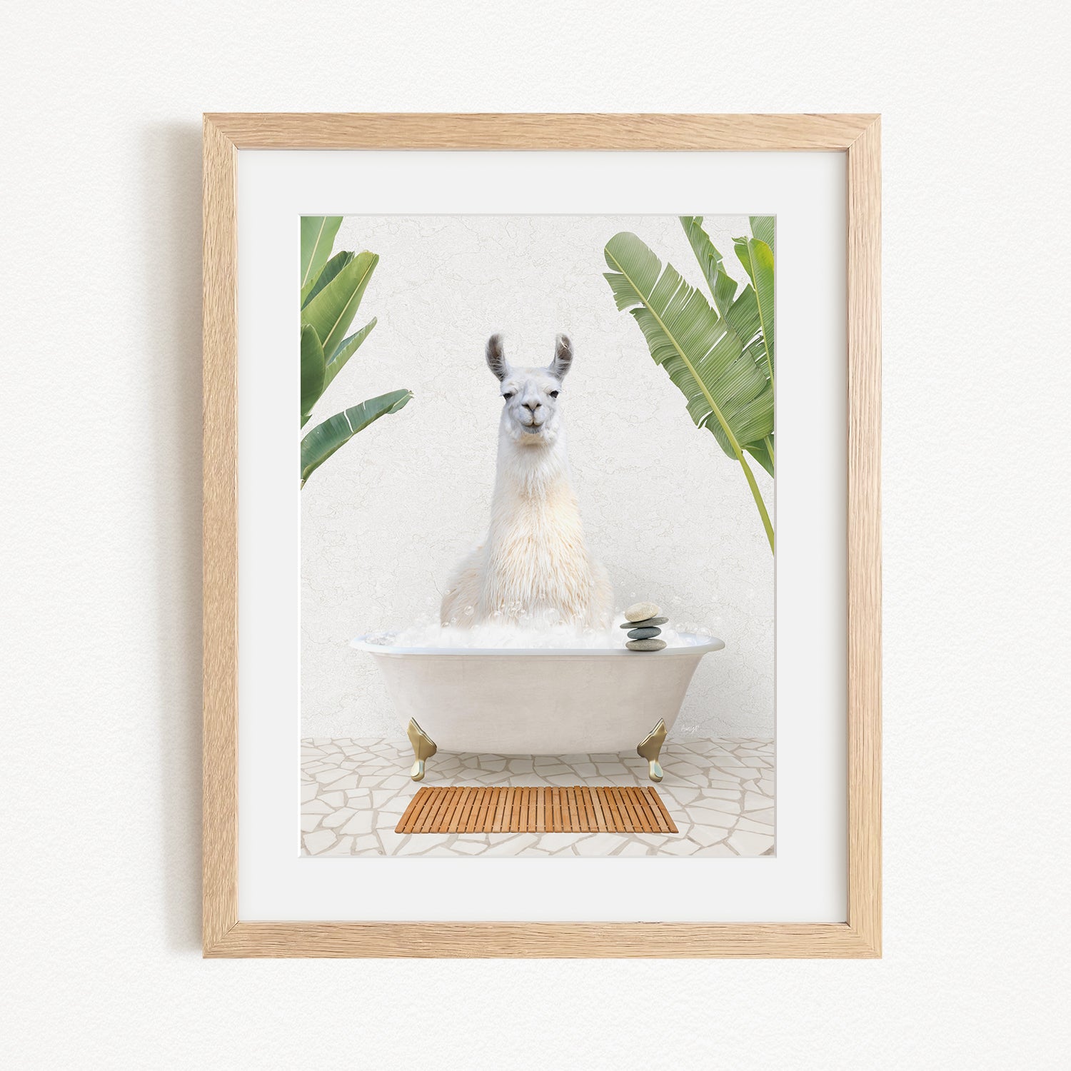 A white llama sitting in a white bathtub, surrounded by green plants, in a framed artwork.