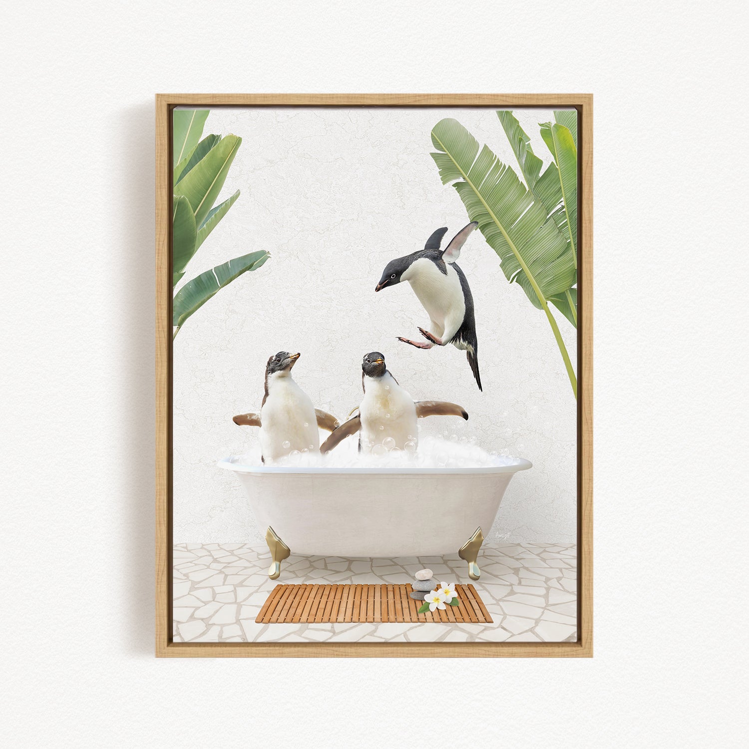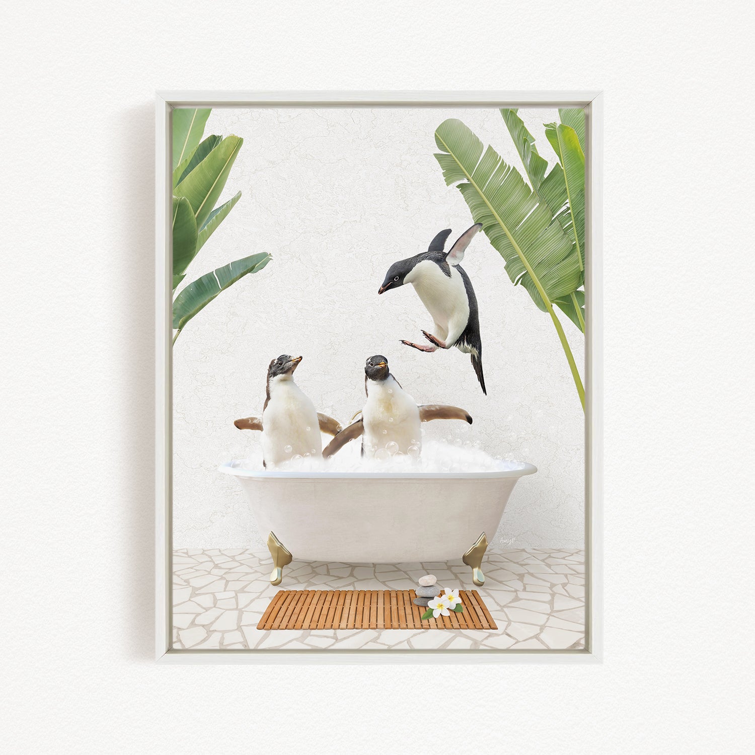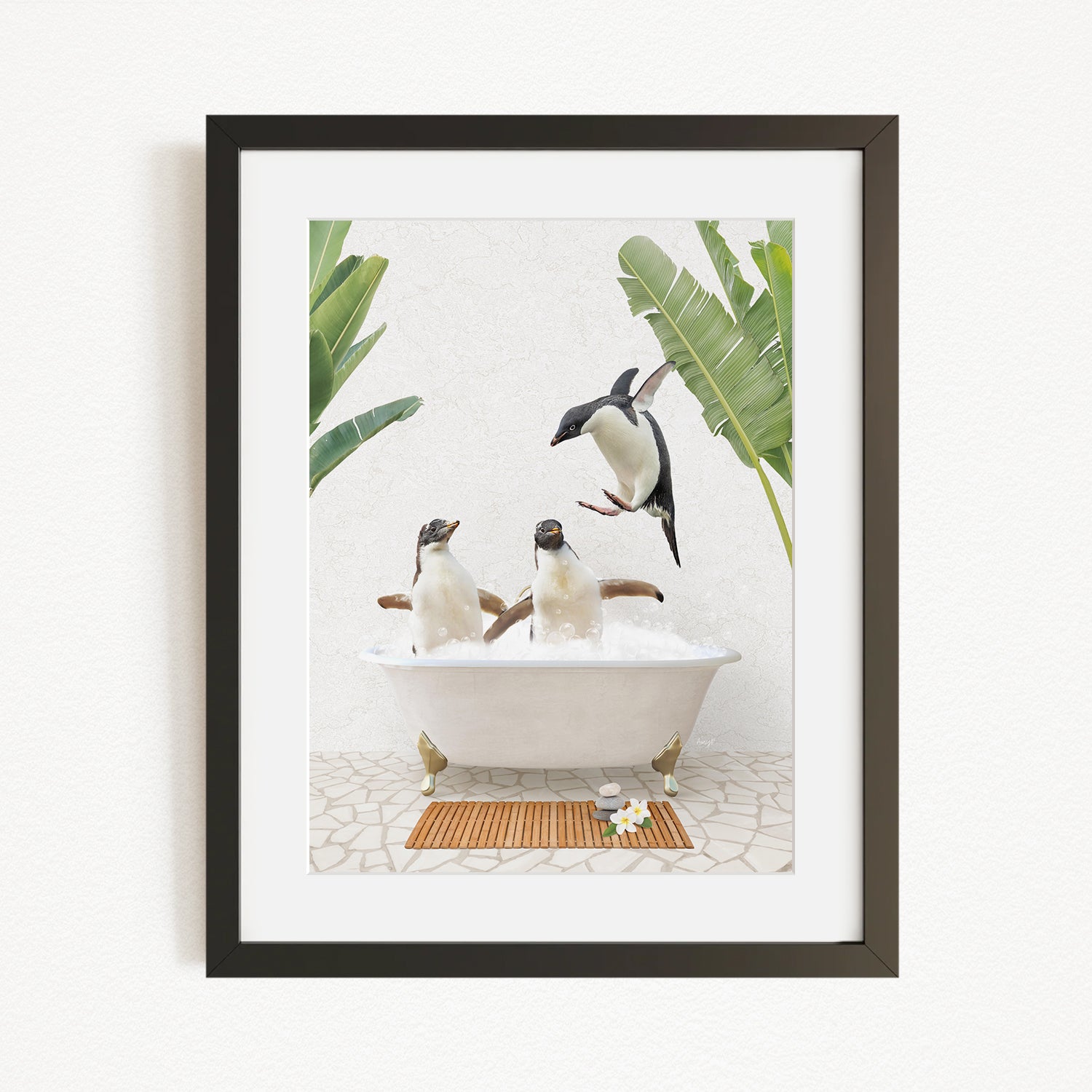 A framed image depicting three penguins sitting in a bathtub, surrounded by tropical plants.
