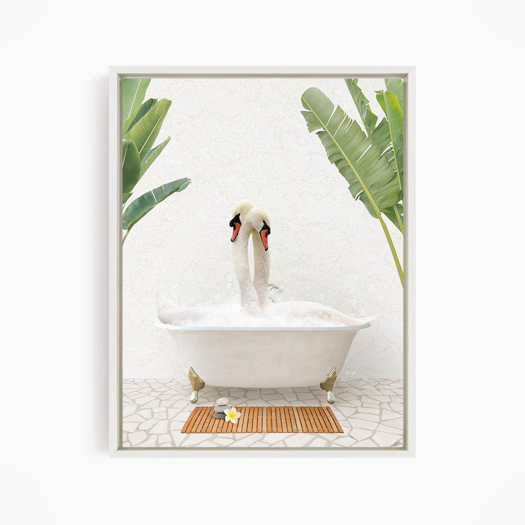 A hand holds up a framed photograph of a pair of swans sitting in a bathtub, surrounded by tropical plants.