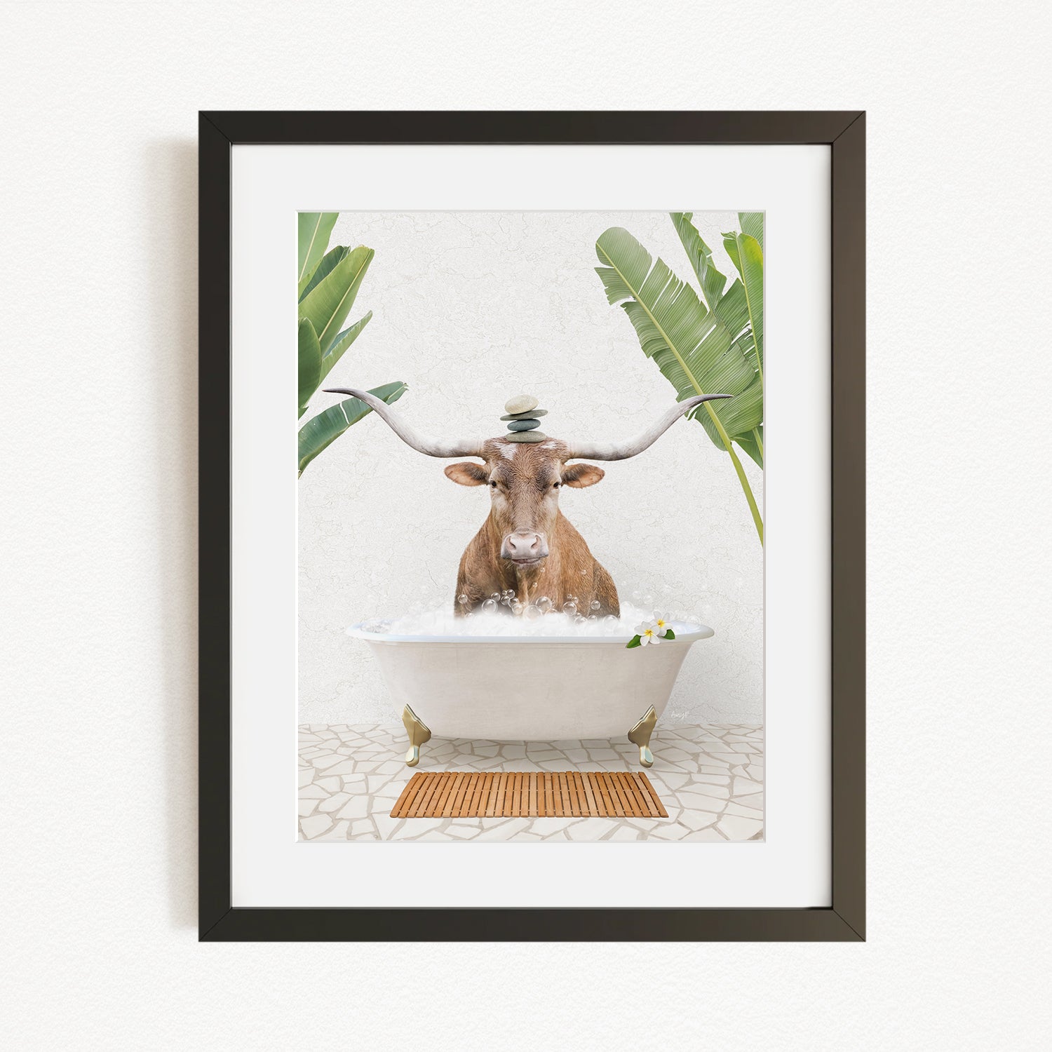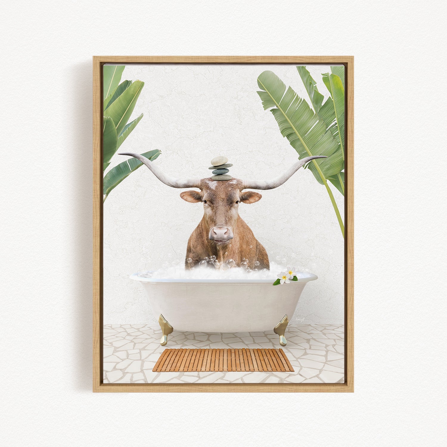 A framed image depicting a brown cow with large horns sitting in a white bathtub filled with water, surrounded by green plants.