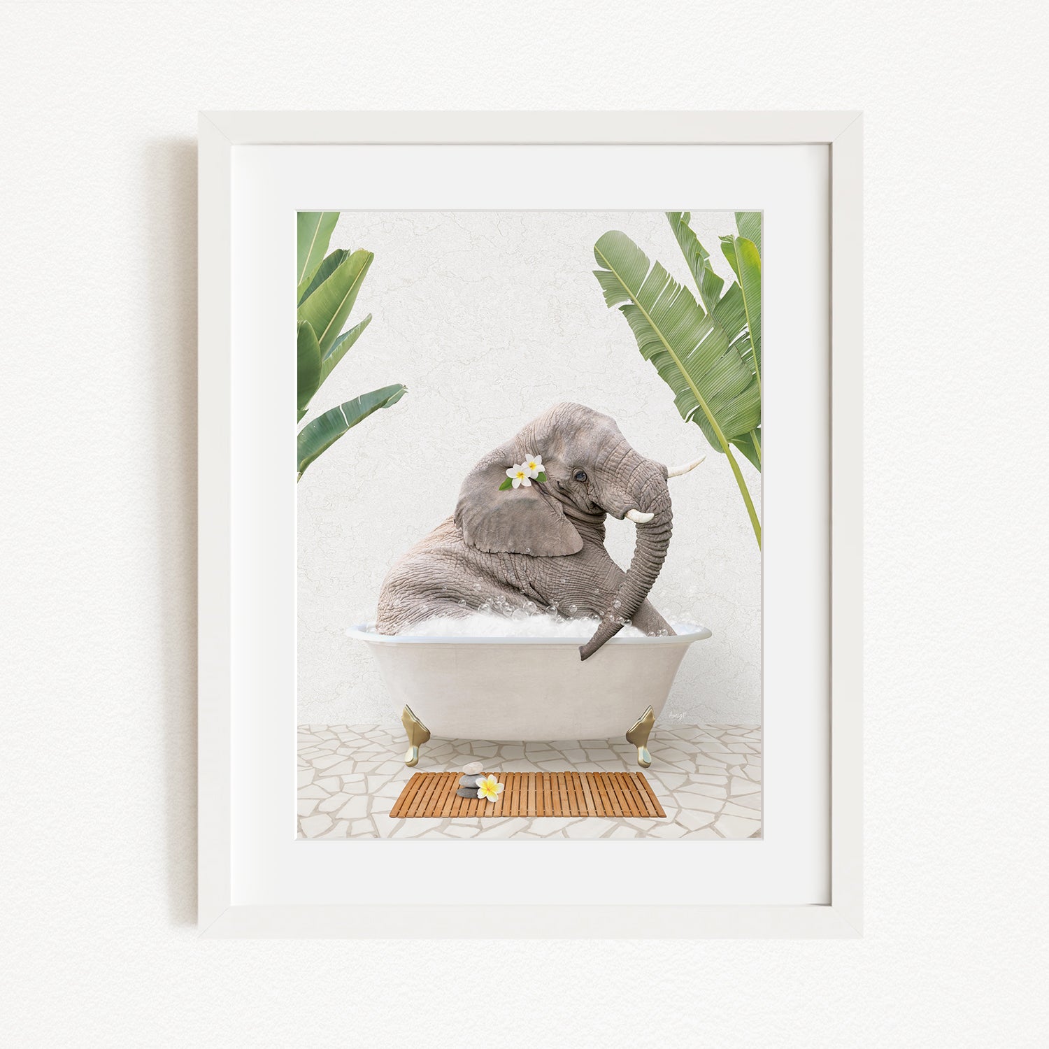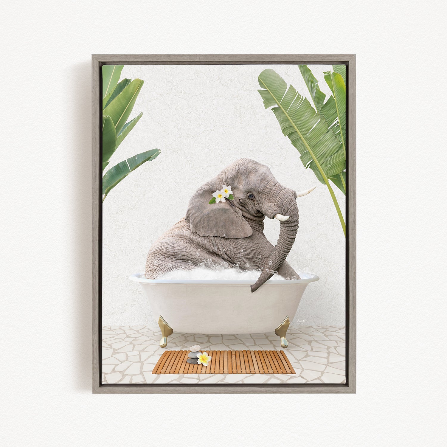 A gray elephant is sitting in a white bathtub, surrounded by green leaves and flowers, creating a whimsical and relaxing scene.