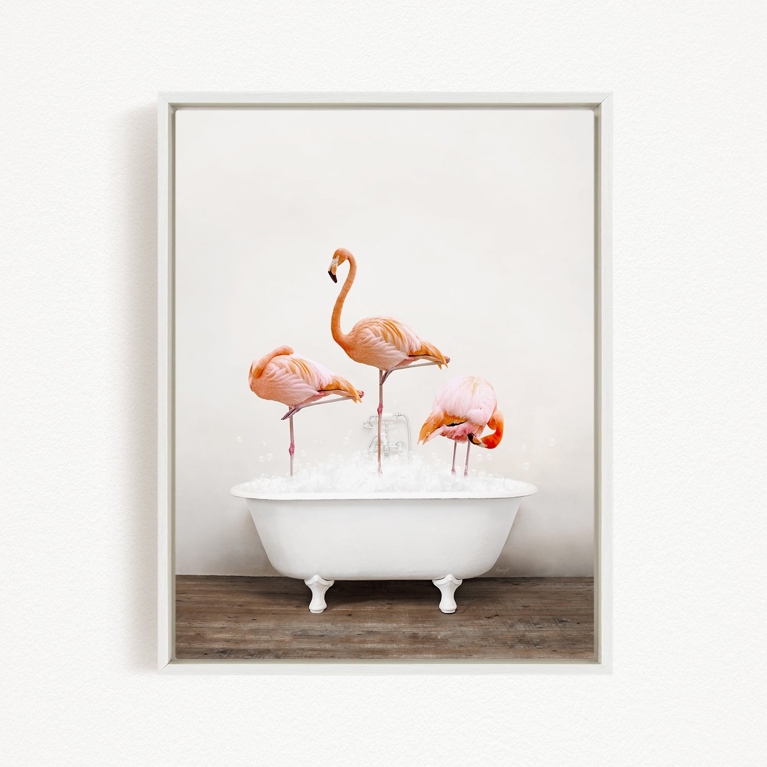 A framed image depicting three flamingos standing in a white bathtub filled with water.